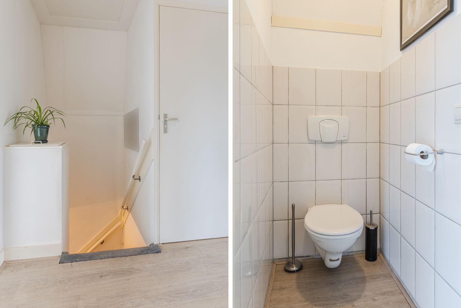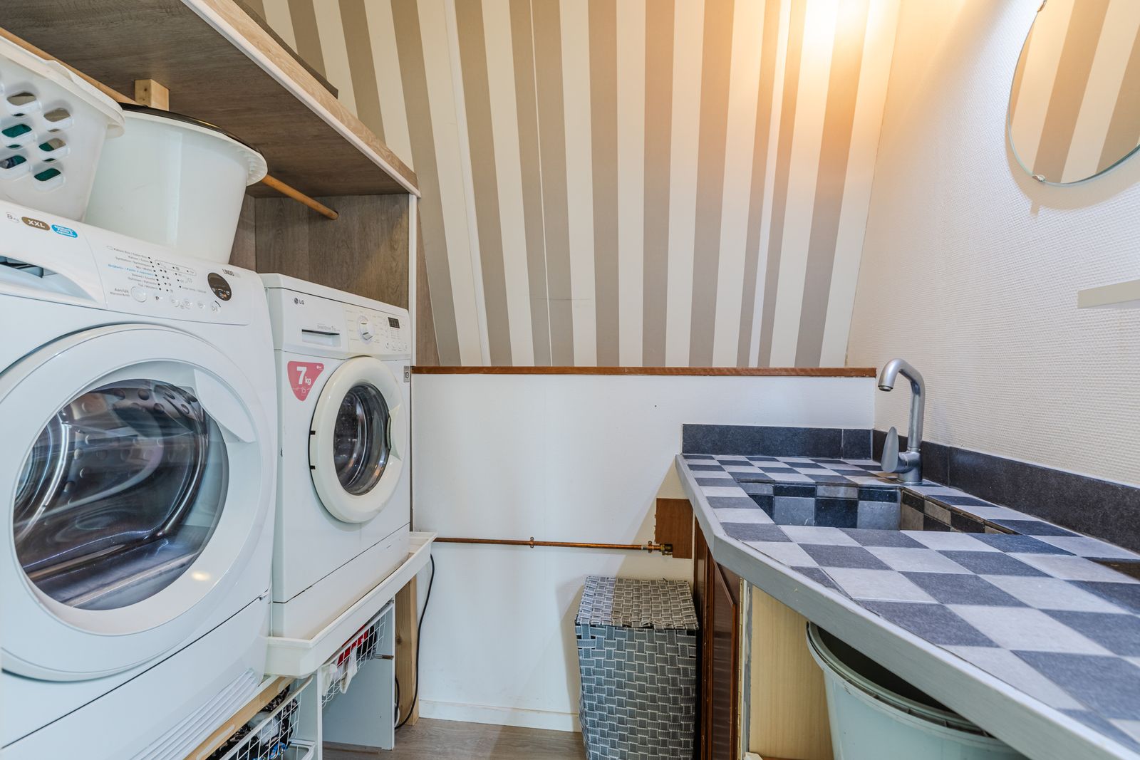 Op de eerste verdieping is een toilet en een aparte waskamer met aansluiting voor wasmachine en droger. Hier is ook een wastafel met warm en koud water. Er is dus een mogelijkheid om de waskamer om te bouwen tot een extra doucheruimte.