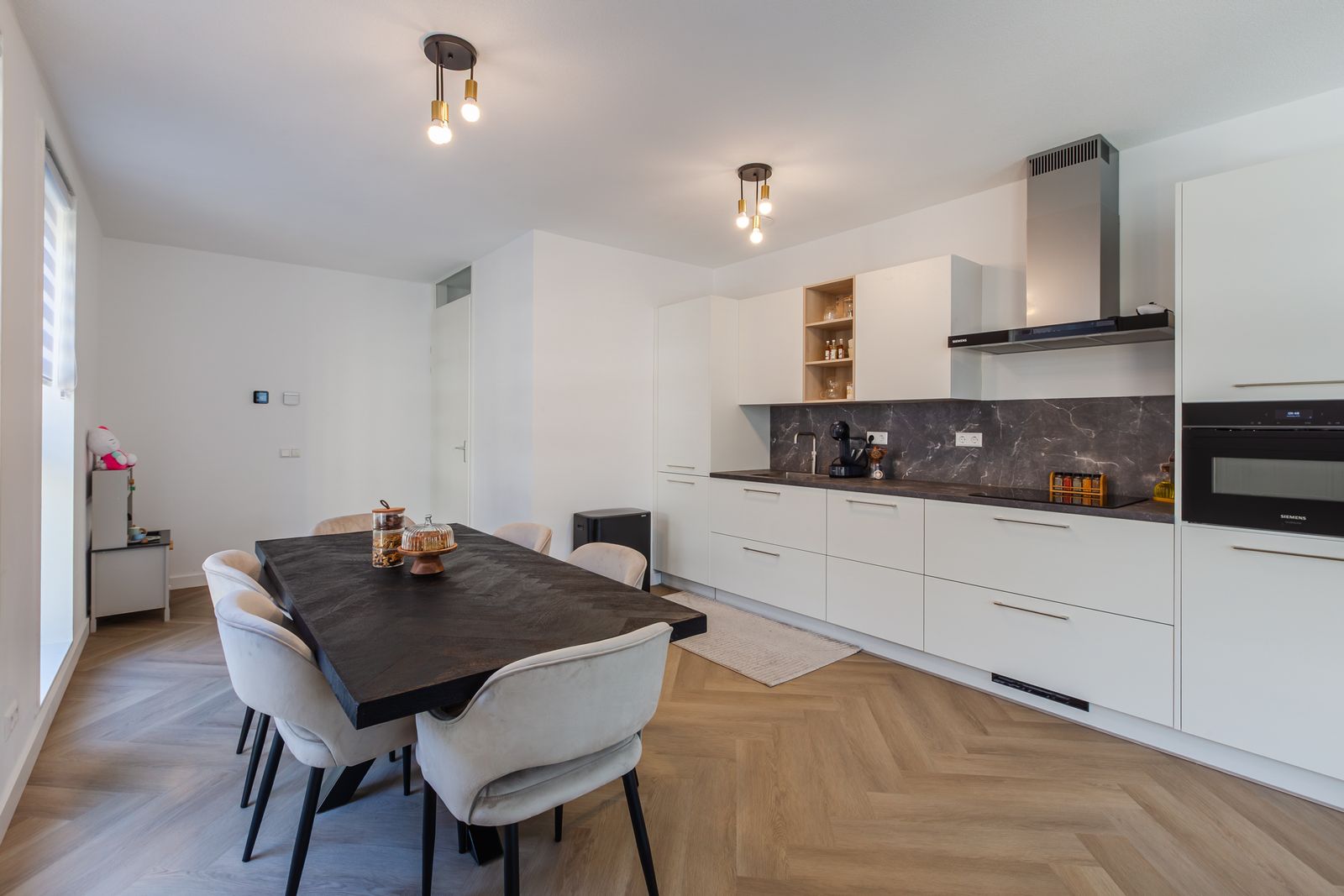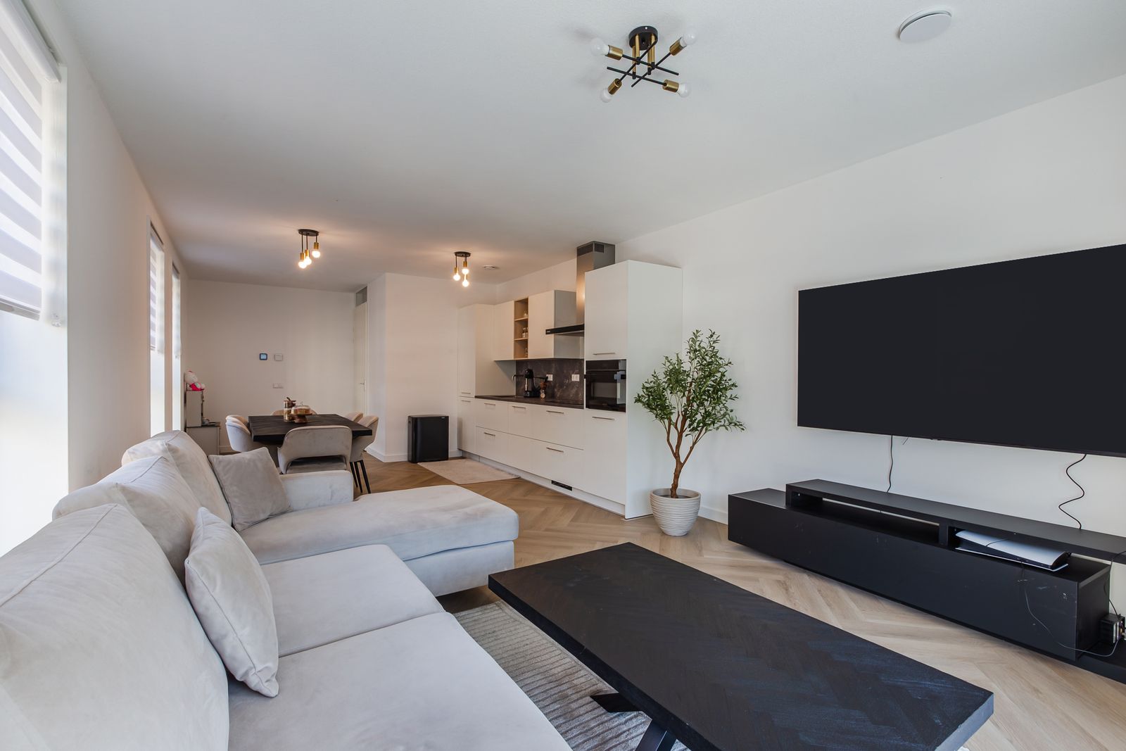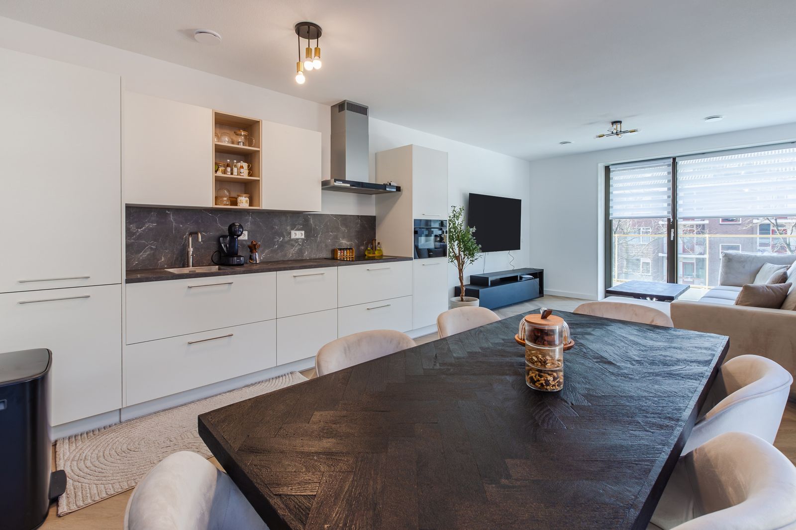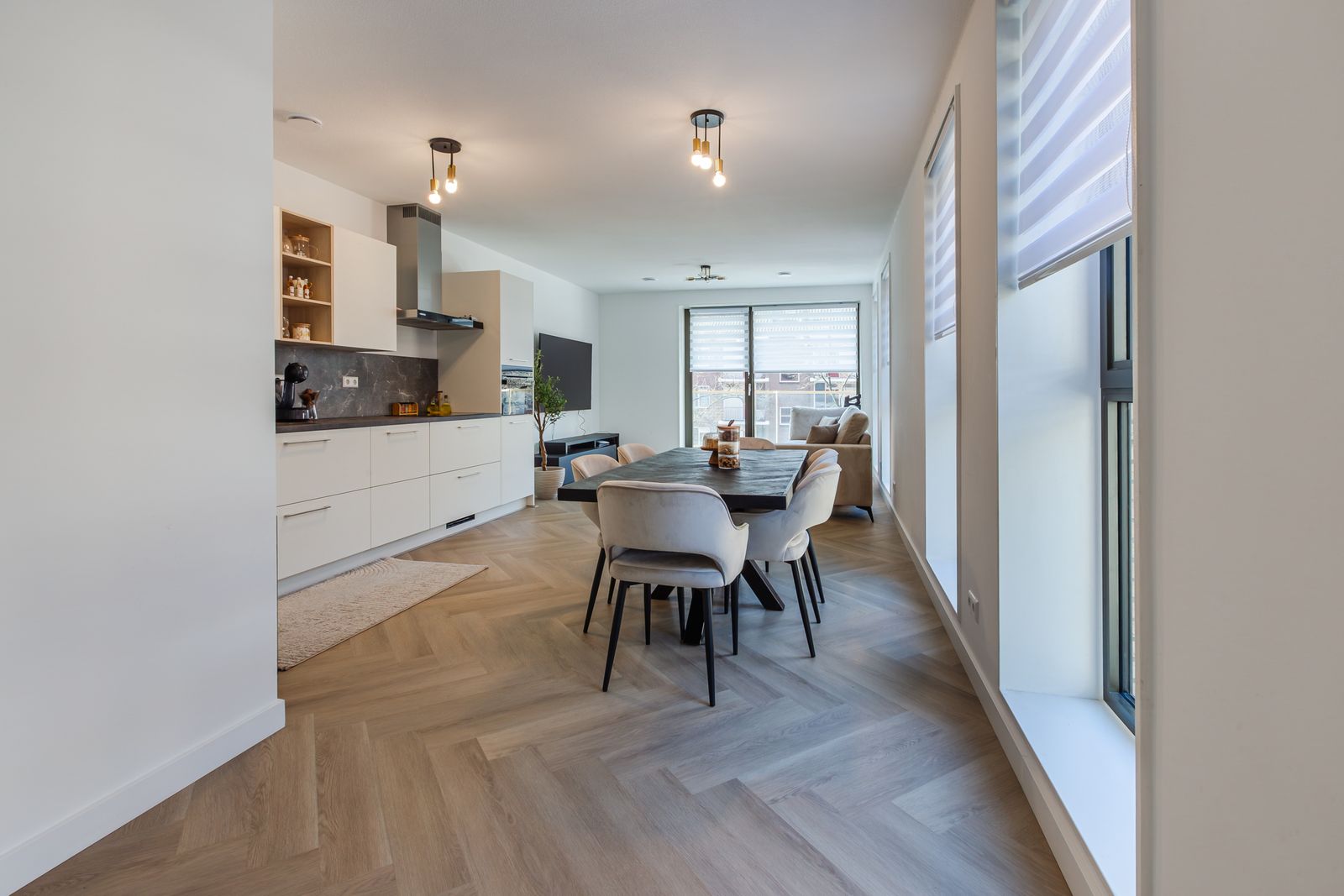 De open keuken sluit perfect aan op de woonkamer en is modern en luxe uitgevoerd, een fijne plek om te koken en samen te komen.