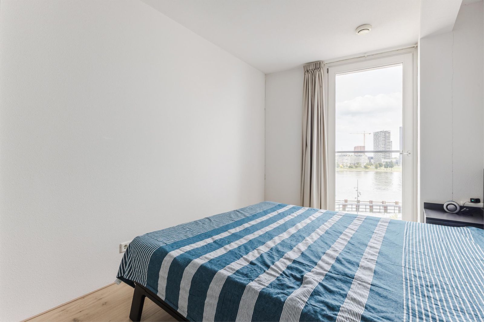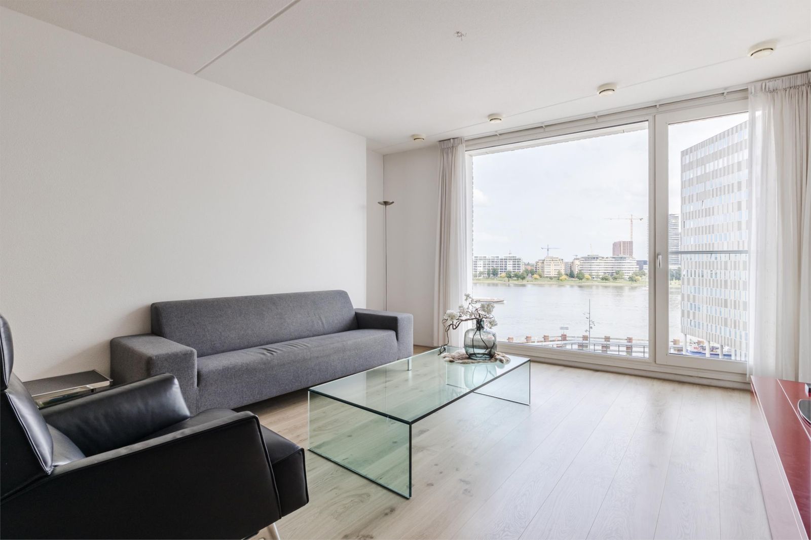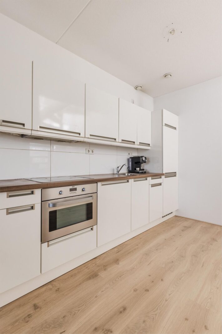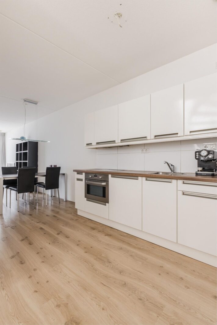 This bright and spacious three-bedroom apartment is situated on the 6th floor of the prestigious IJ View complex, offering unobstructed panoramic views over the IJ river. The generous living room with open kitchen is bathed in natural light, while two comfortable bedrooms also enjoy water views. The modern bathroom features a bathtub, walk-in shower, and washbasin; a separate toilet and utility/storage room with central heating system (2018) and laundry setup complete the layout.