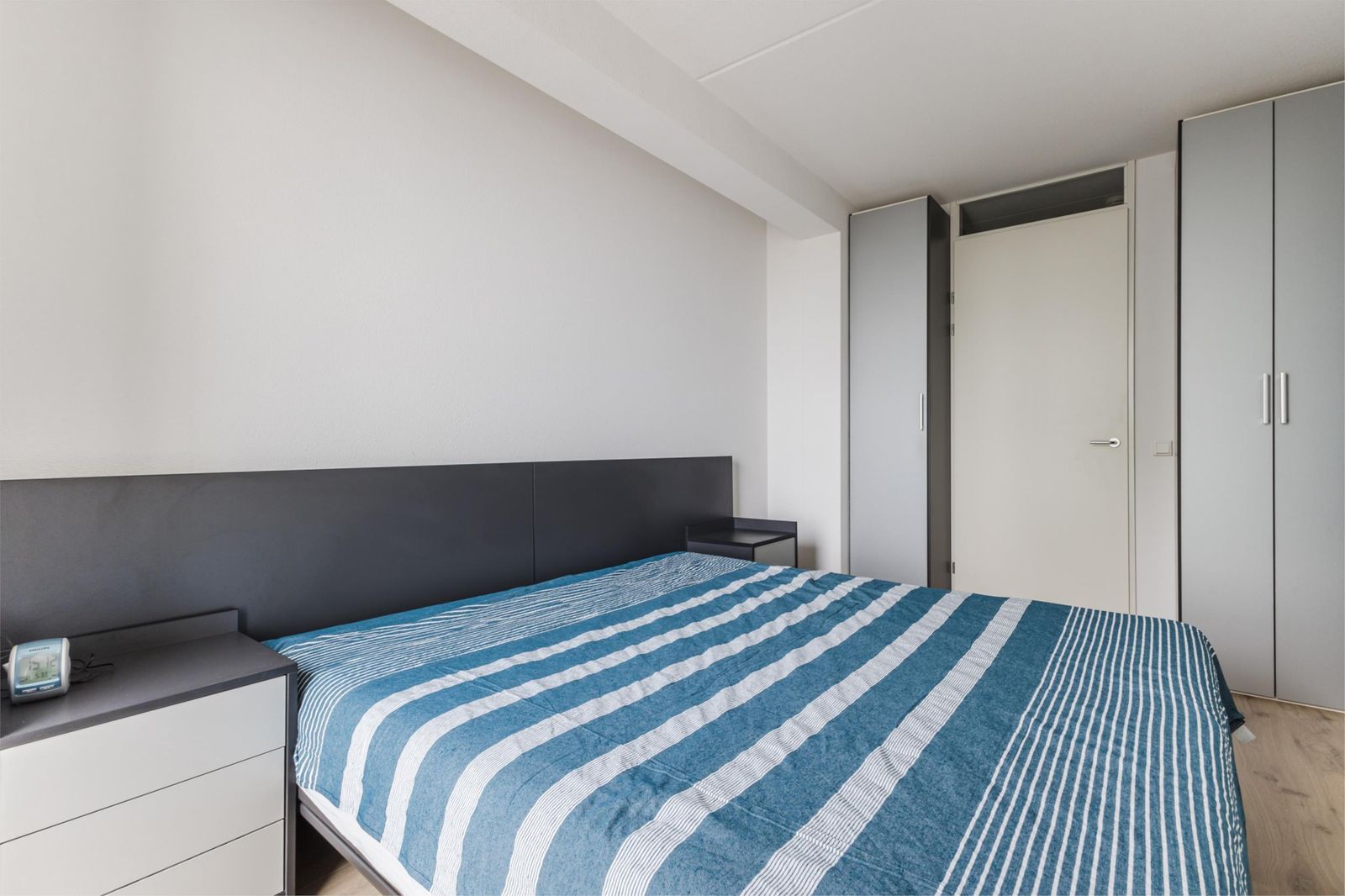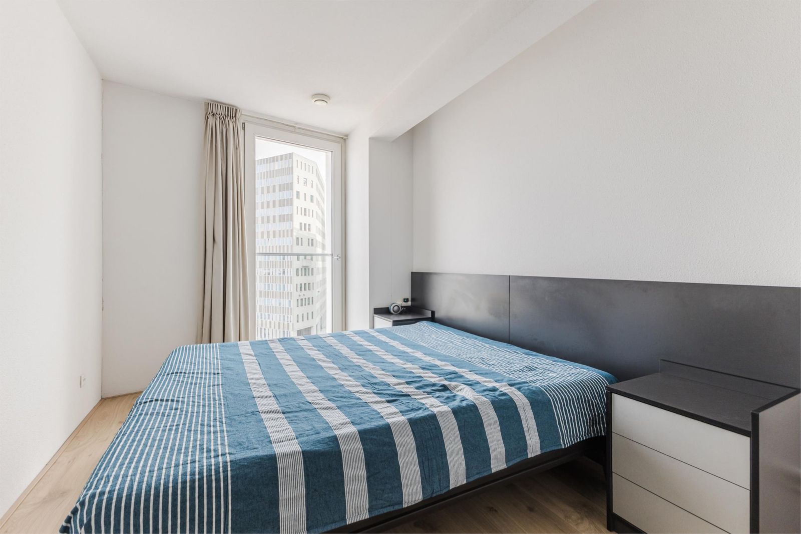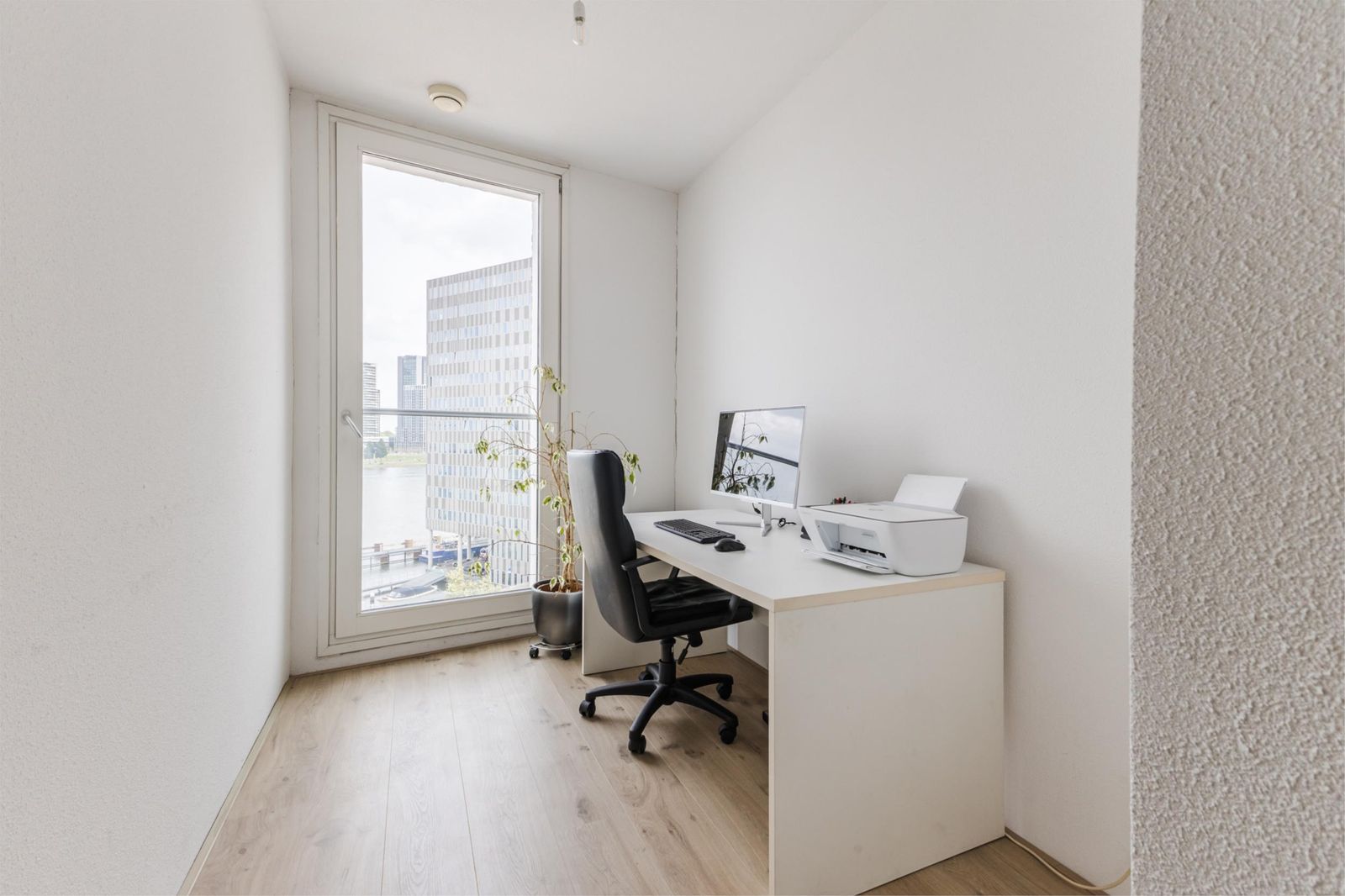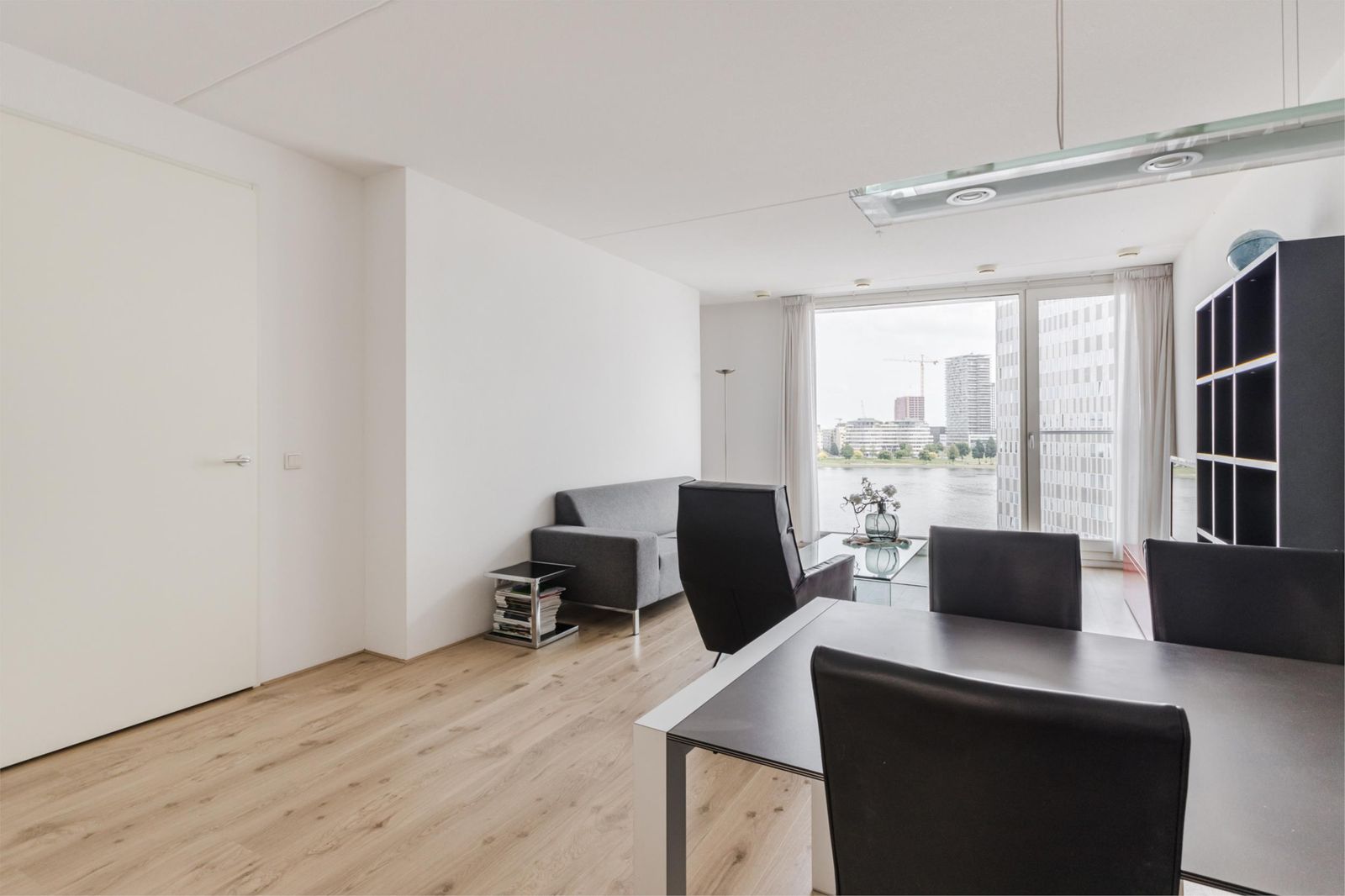 This bright and spacious three-bedroom apartment is situated on the 6th floor of the prestigious IJ View complex, offering unobstructed panoramic views over the IJ river. The generous living room with open kitchen is bathed in natural light, while two comfortable bedrooms also enjoy water views. The modern bathroom features a bathtub, walk-in shower, and washbasin; a separate toilet and utility/storage room with central heating system (2018) and laundry setup complete the layout.