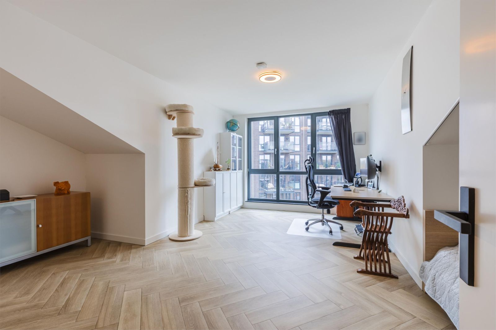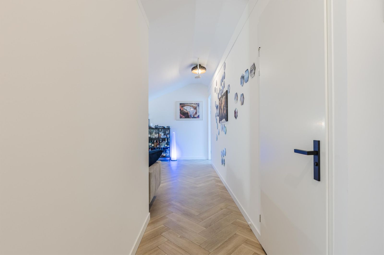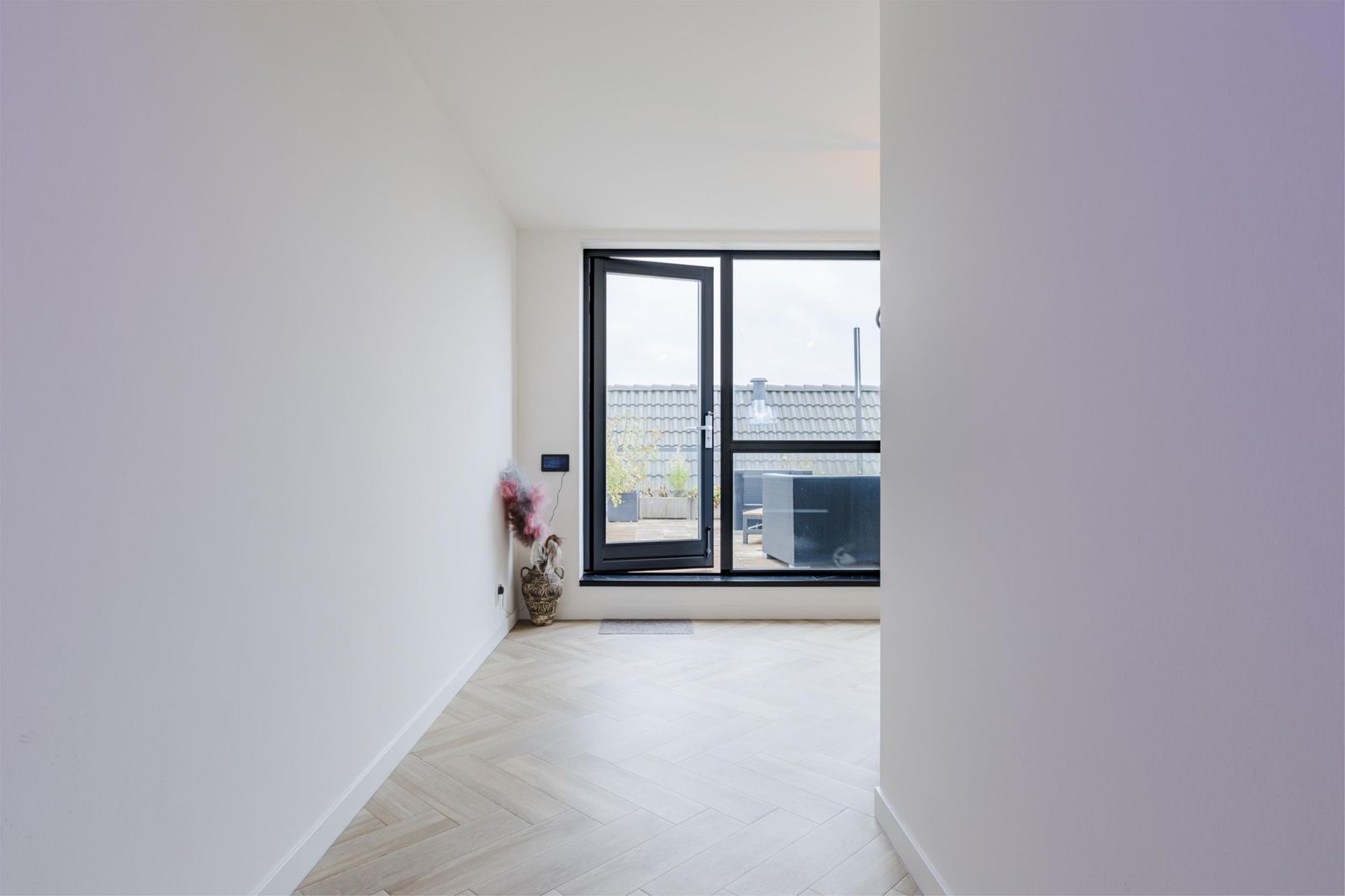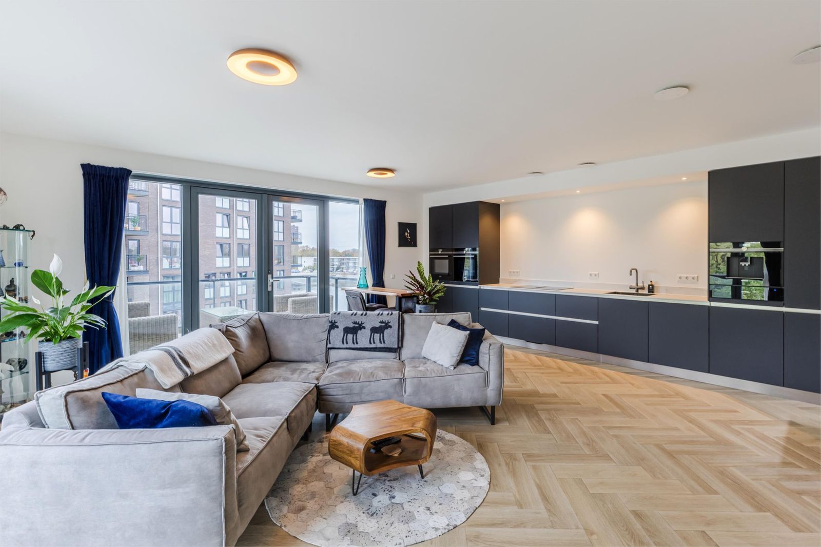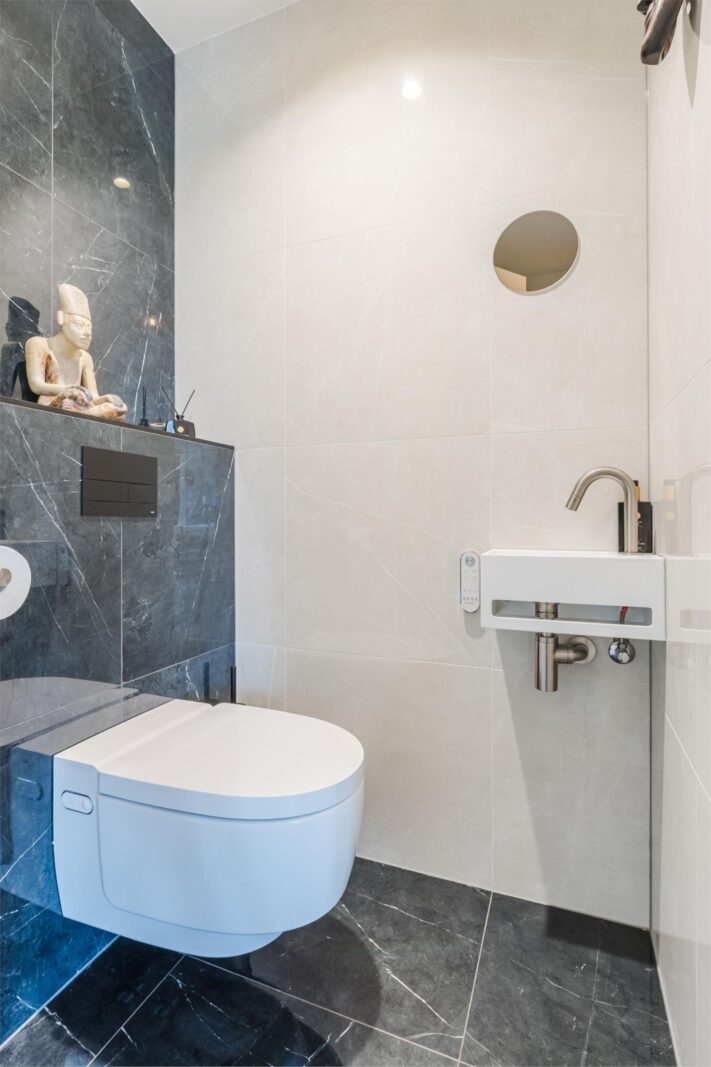 The third floor features a bright living area with wide windows, double French doors with a transparent Juliet balcony and additional doors opening onto the main balcony. The custom-made open kitchen is fitted with high-end appliances, including an induction cooktop with integrated extractor, built-in coffee machine and Quooker instant boiling-water tap. The elegant herringbone PVC flooring with underfloor heating continues seamlessly throughout. From the living room you enjoy views of the Zaan; the master bedroom and walk-in closet (or second bedroom) overlook the skyline of Zaandam. The luxurious bathroom offers a walk-in shower, double washbasin and infrared sauna.