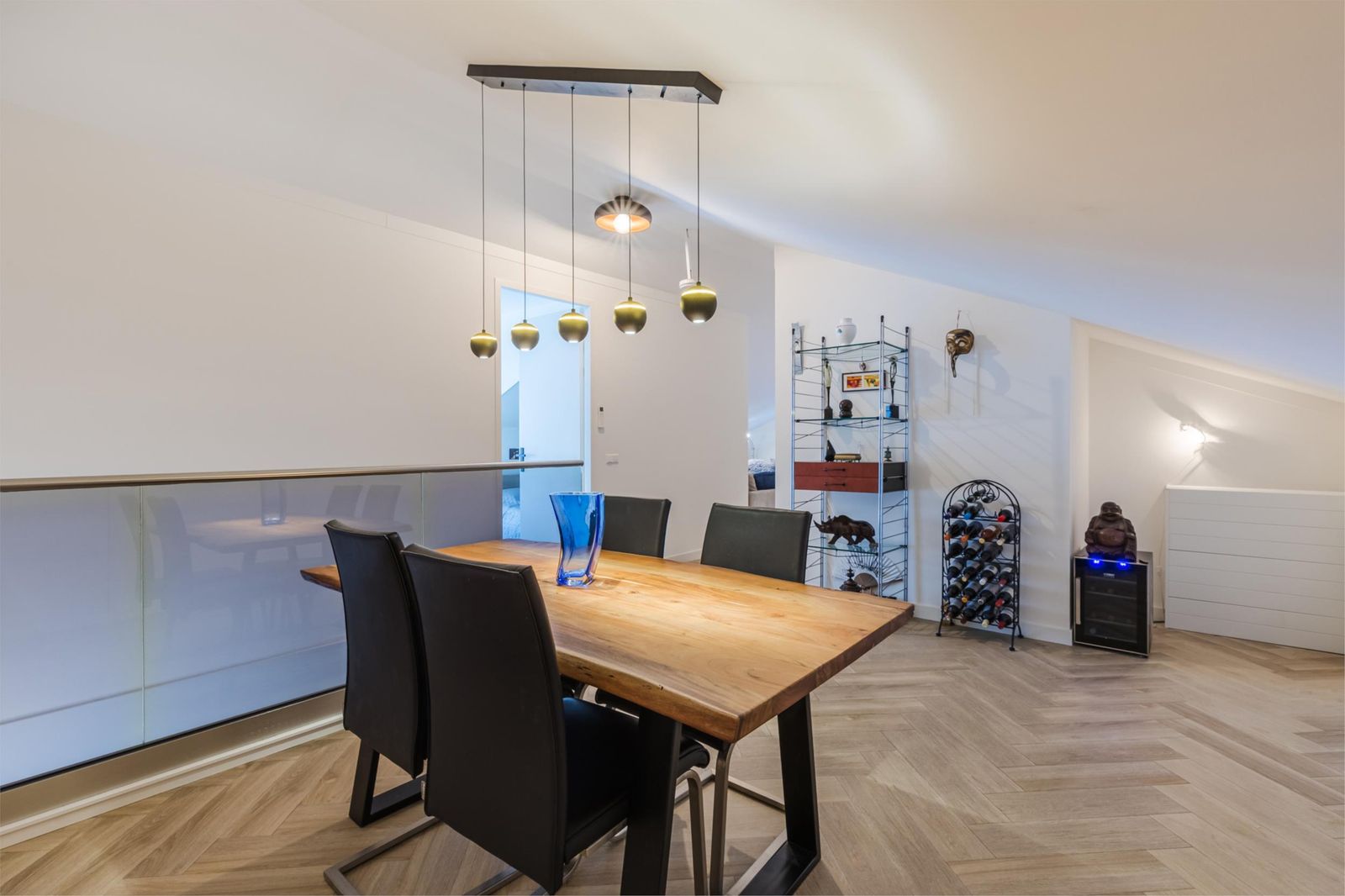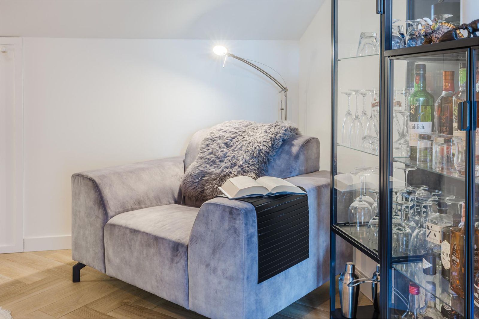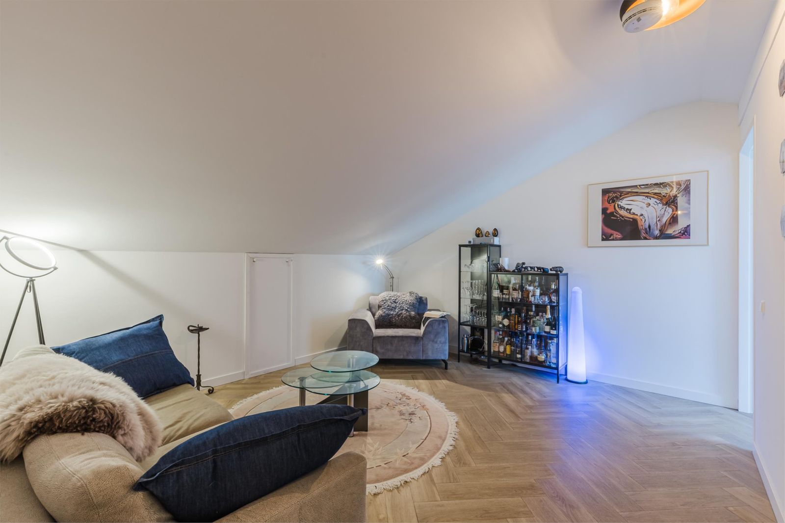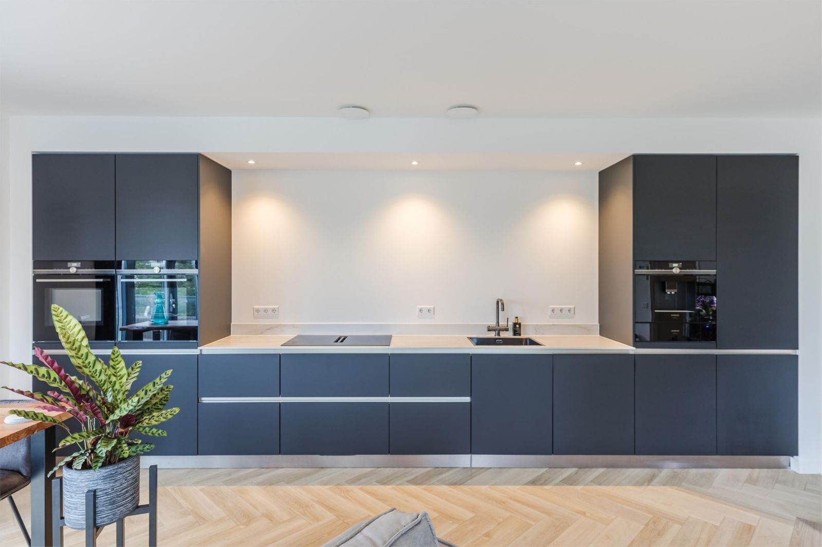 The third floor features a bright living area with wide windows, double French doors with a transparent Juliet balcony and additional doors opening onto the main balcony. The custom-made open kitchen is fitted with high-end appliances, including an induction cooktop with integrated extractor, built-in coffee machine and Quooker instant boiling-water tap. The elegant herringbone PVC flooring with underfloor heating continues seamlessly throughout. From the living room you enjoy views of the Zaan; the master bedroom and walk-in closet (or second bedroom) overlook the skyline of Zaandam. The luxurious bathroom offers a walk-in shower, double washbasin and infrared sauna.