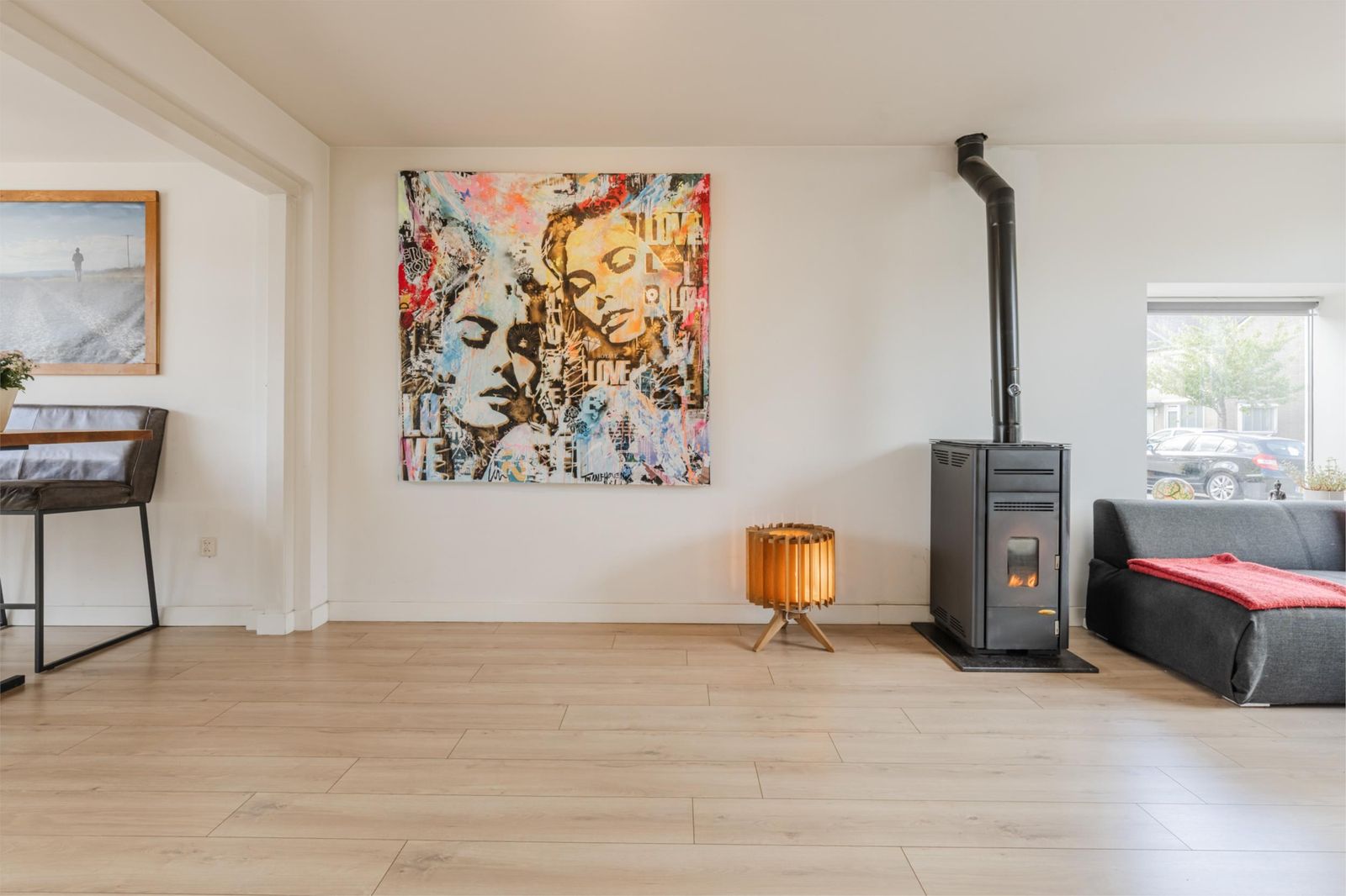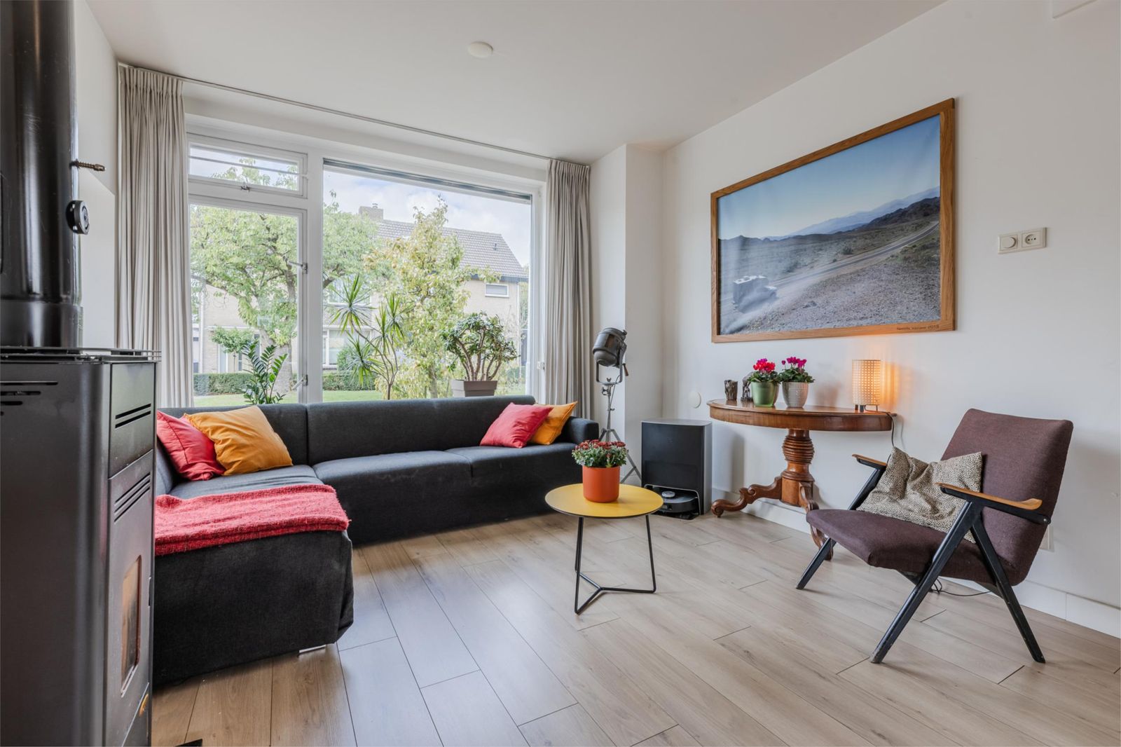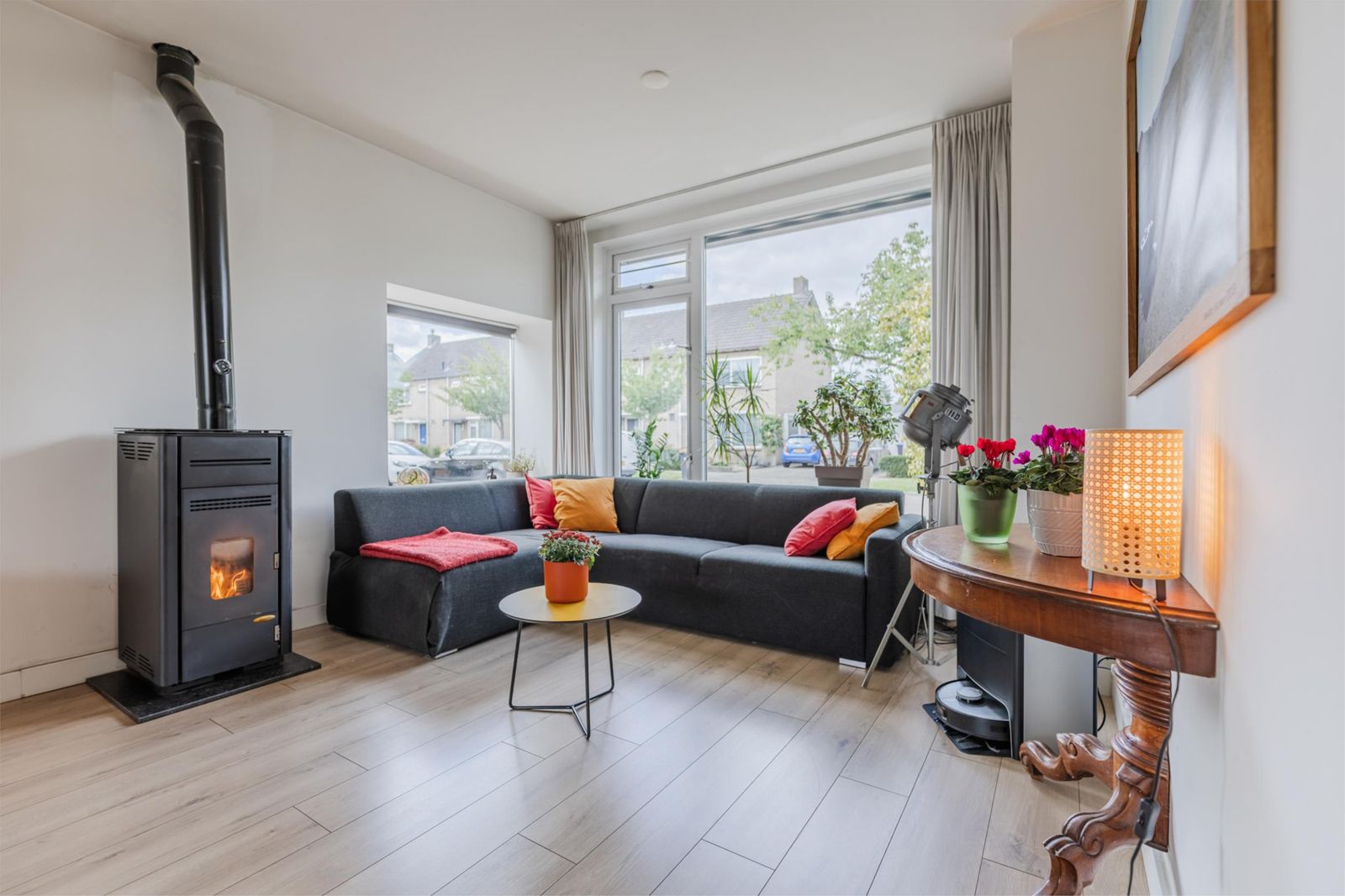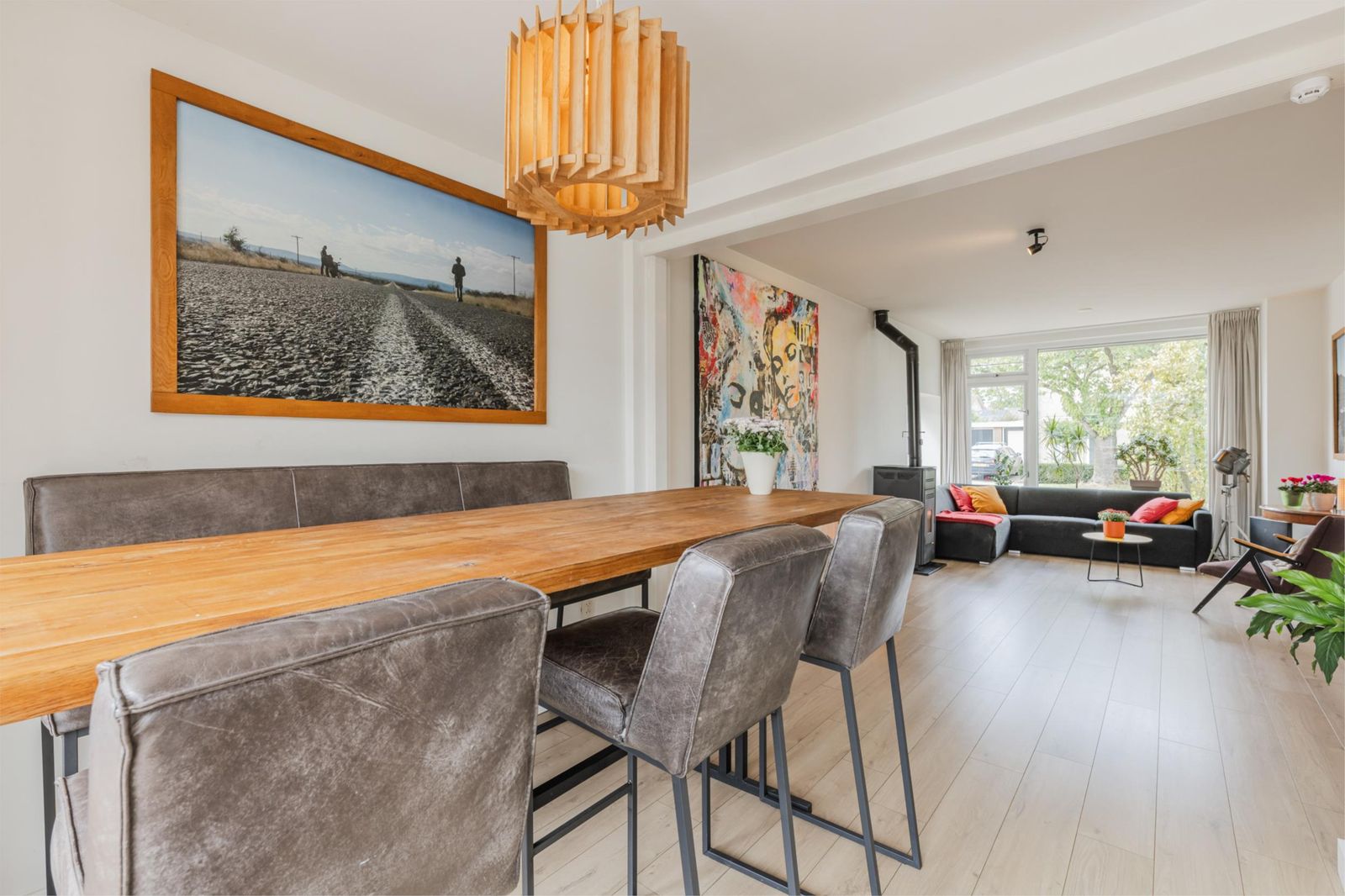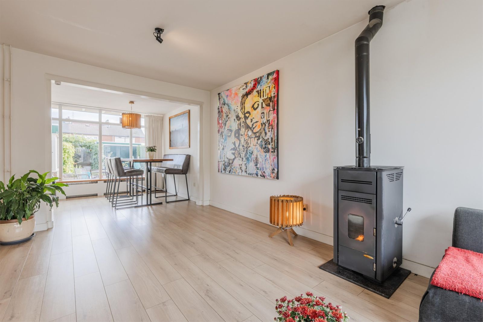 De open keuken sluit direct aan op de lichte woonkamer, waar een grote raampartij over de hele achtergevel zorgt voor veel daglicht en uitzicht op de tuin. De woonkamer aan de voorzijde voelt warm en gezellig. Vanuit de hal bereik je het vernieuwde toilet en de trap naar boven.