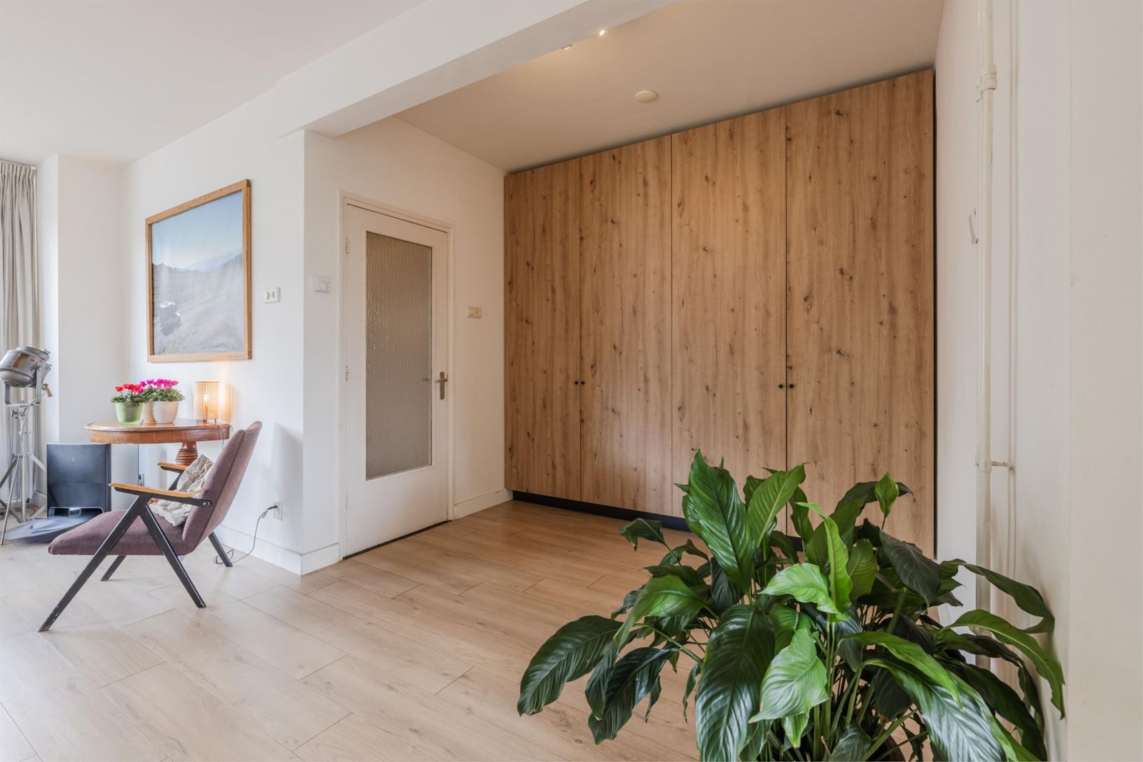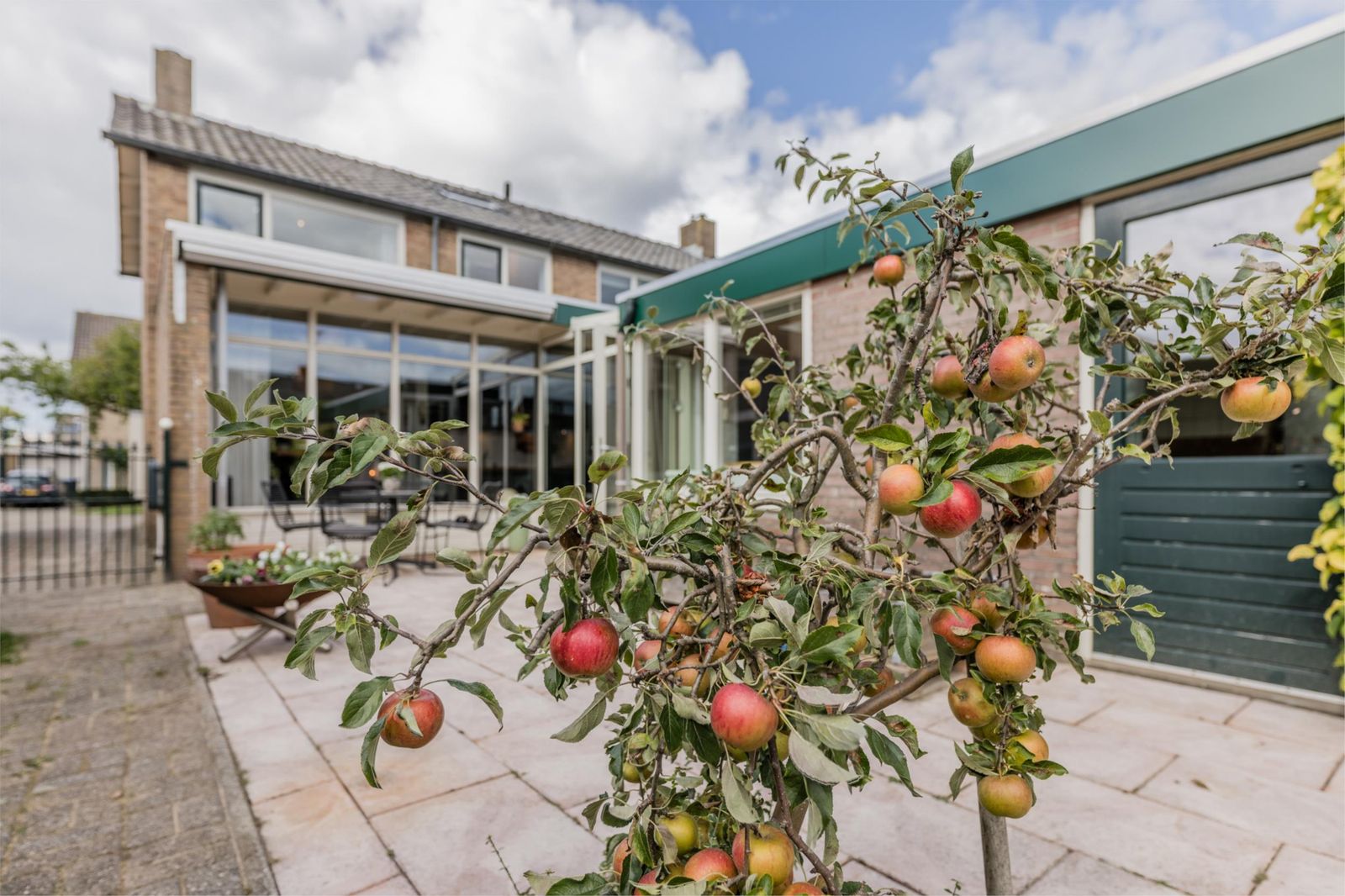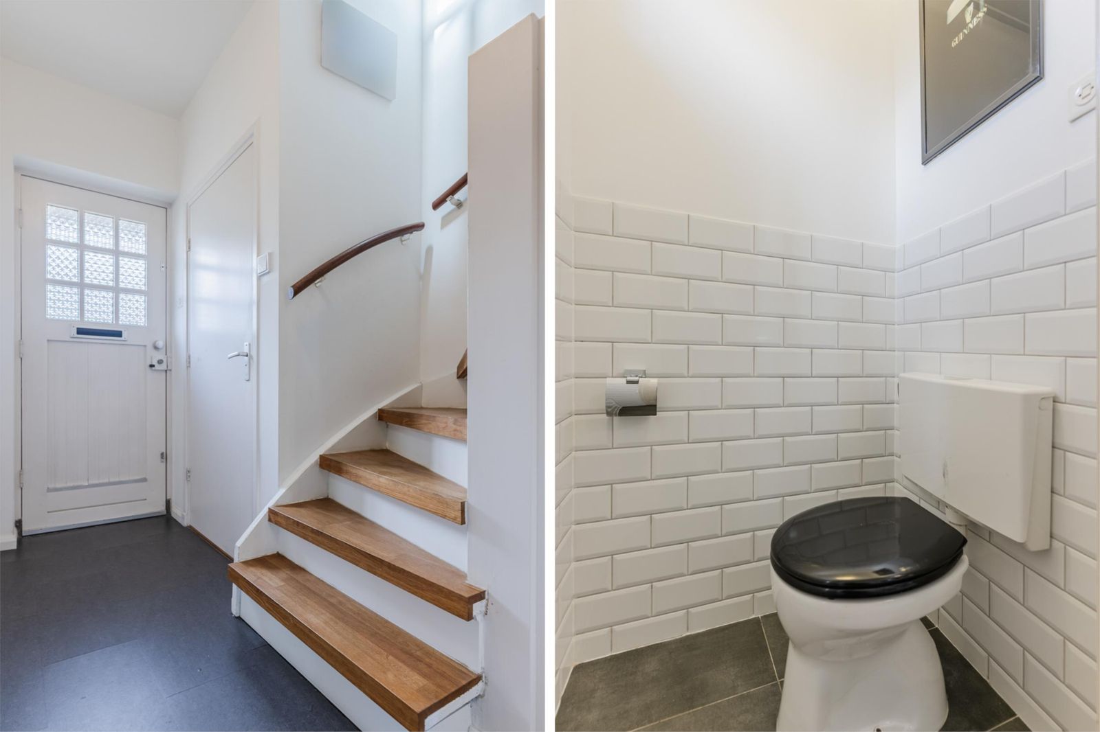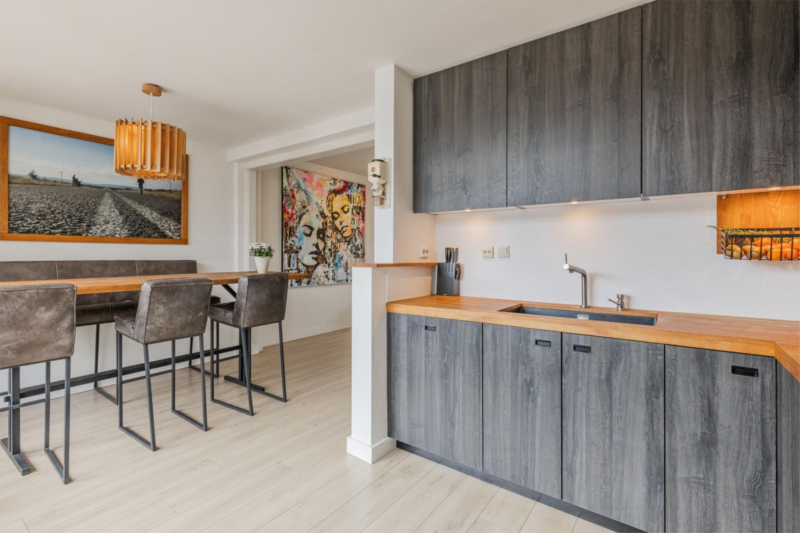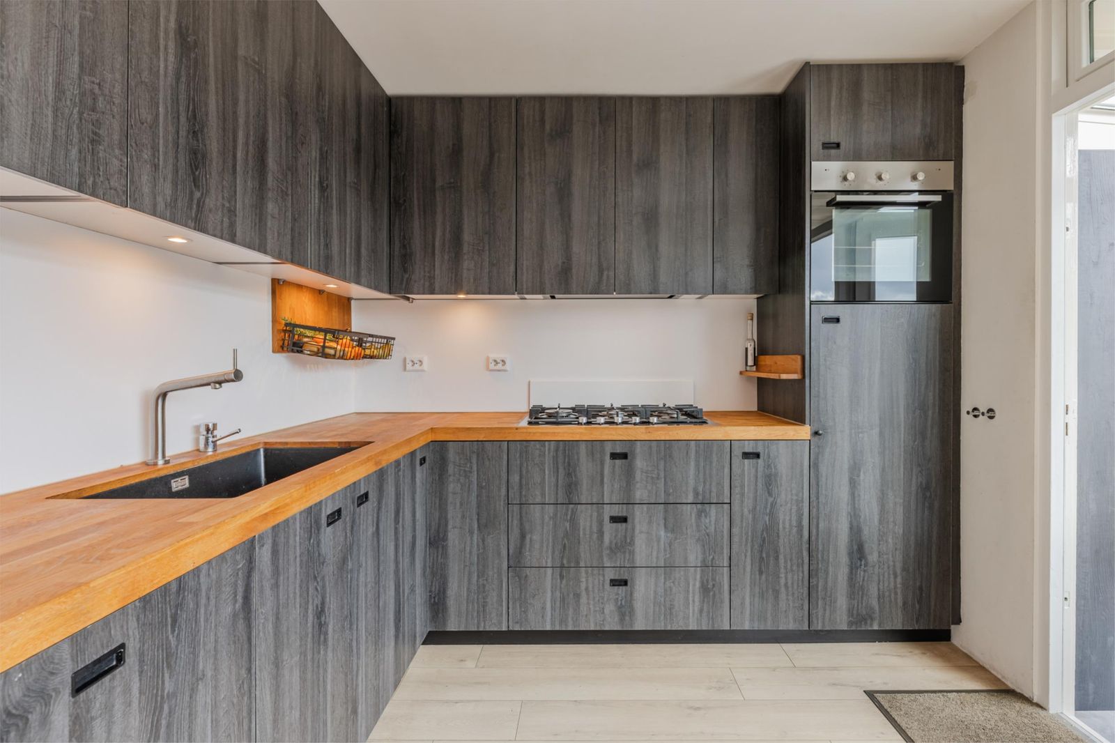 De open keuken sluit direct aan op de lichte woonkamer, waar een grote raampartij over de hele achtergevel zorgt voor veel daglicht en uitzicht op de tuin. De woonkamer aan de voorzijde voelt warm en gezellig. Vanuit de hal bereik je het vernieuwde toilet en de trap naar boven.