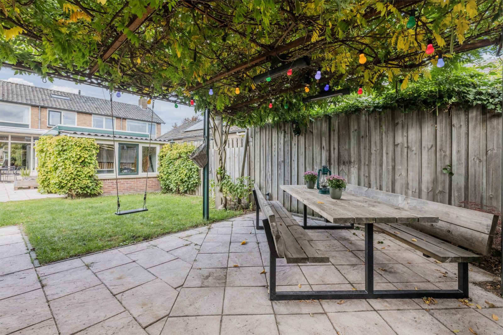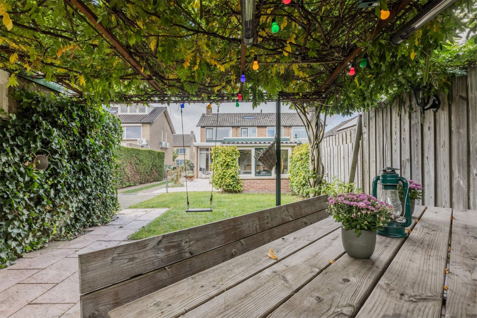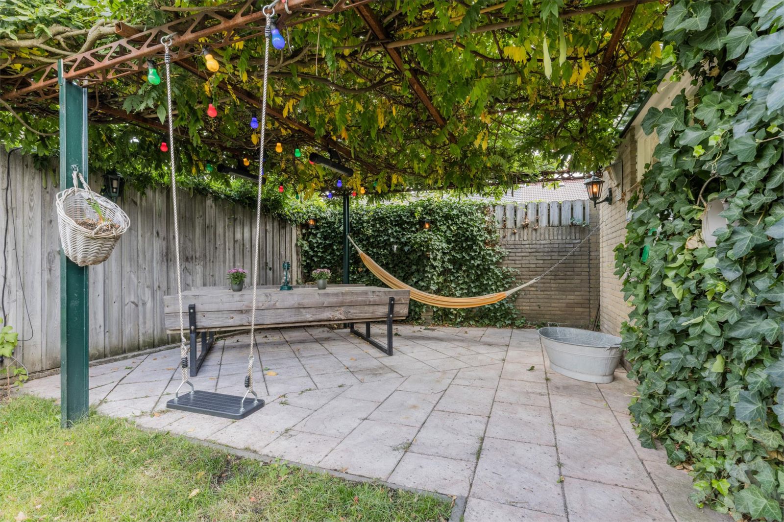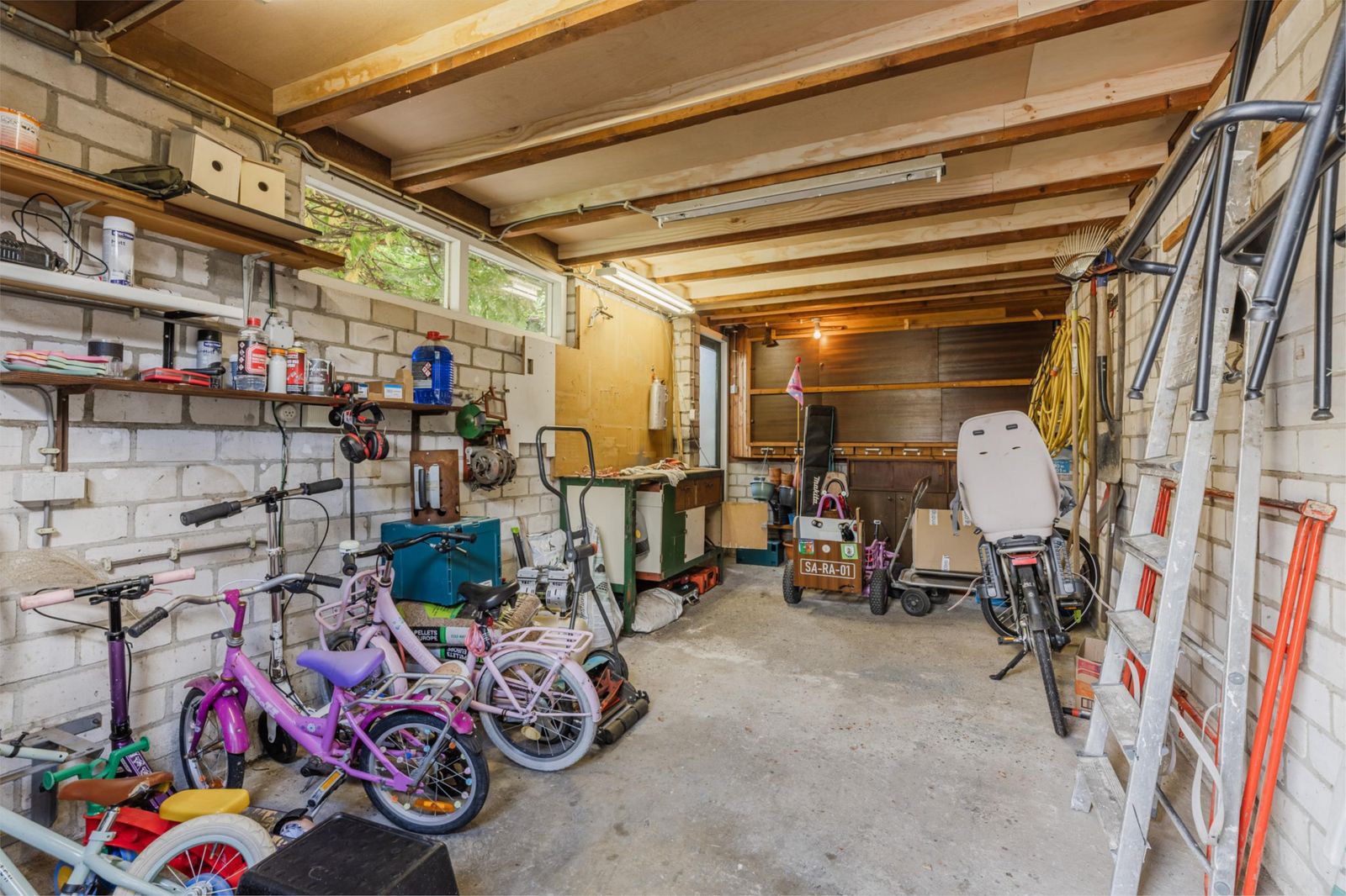 In de achtertuin vind je links een sfeervolle pergola met prachtige blauwe regen voor natuurlijke schaduw. Rechts staat een ruime bakstenen garage van bijna 19 m². Het buitenschilderwerk is professioneel gedaan en vraagt nu om een frisse beurt – een mooie kans om je eigen kleurkeuze door te voeren.
