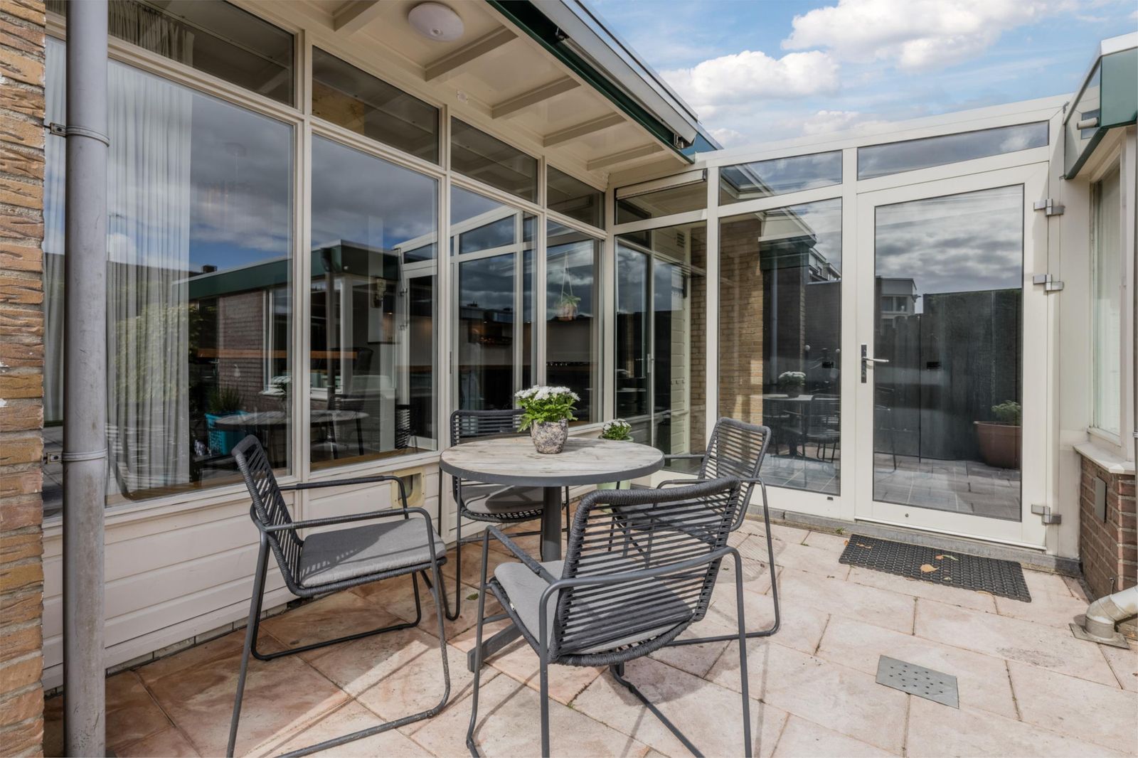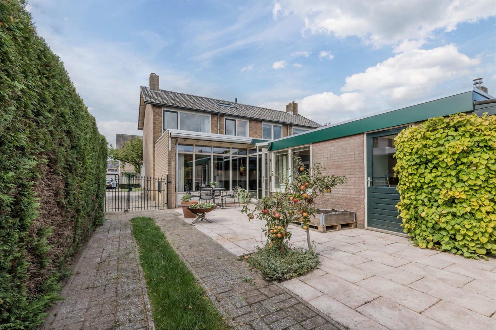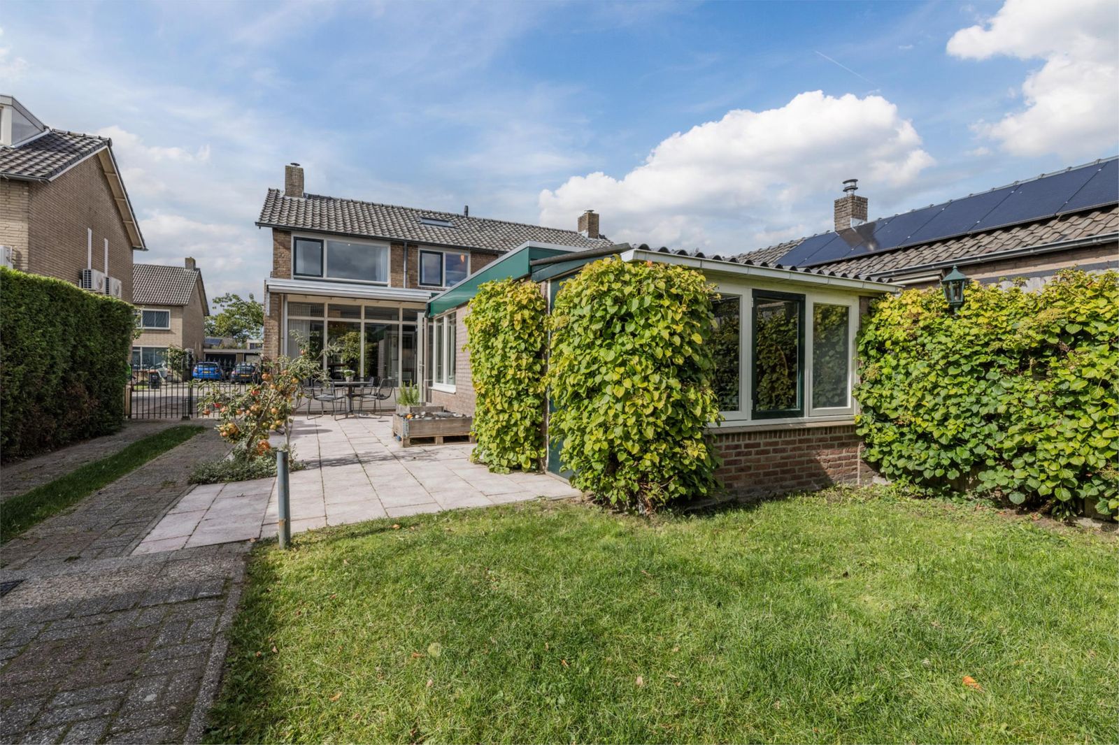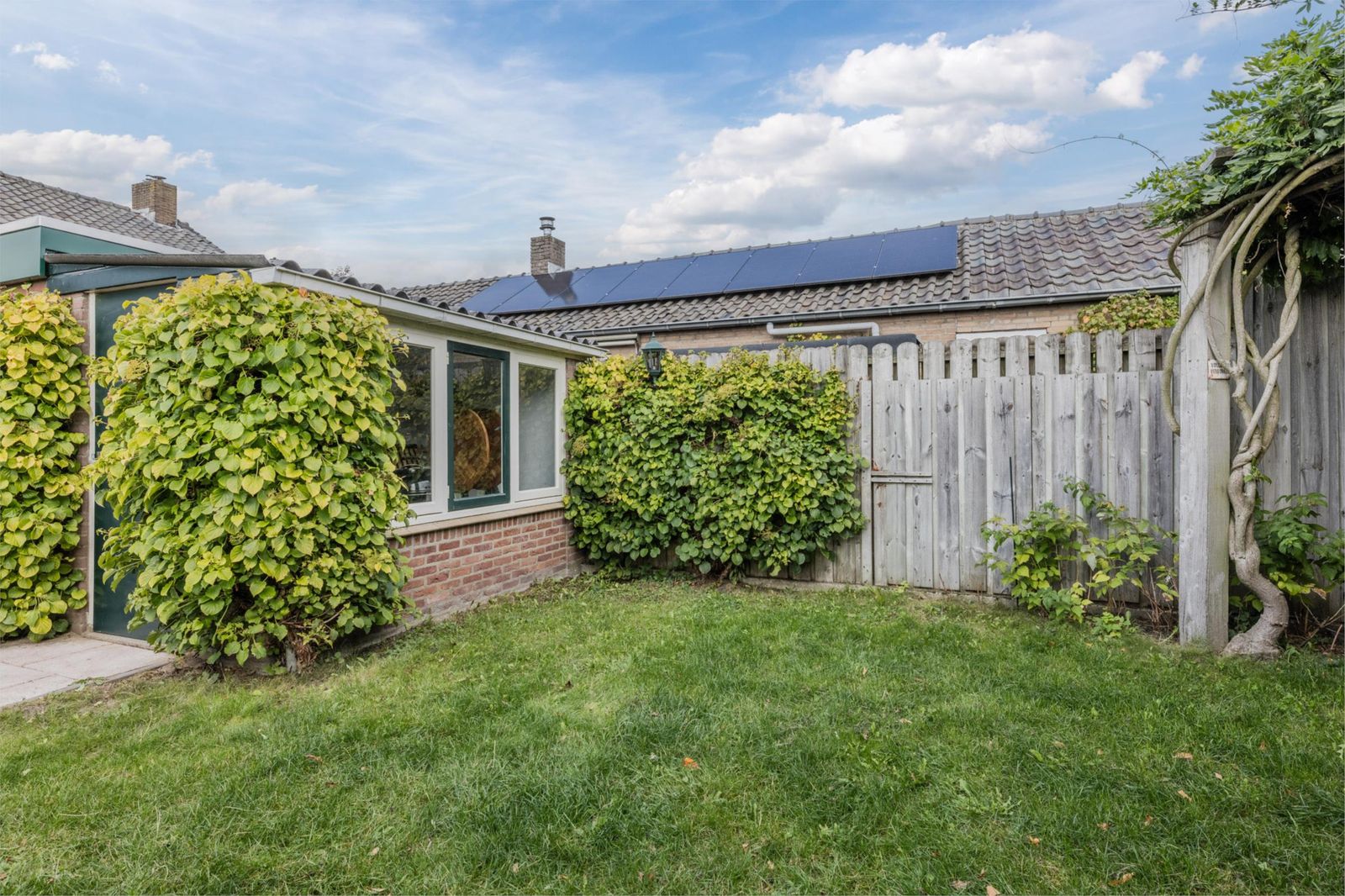 In de achtertuin vind je links een sfeervolle pergola met prachtige blauwe regen voor natuurlijke schaduw. Rechts staat een ruime bakstenen garage van bijna 19 m². Het buitenschilderwerk is professioneel gedaan en vraagt nu om een frisse beurt – een mooie kans om je eigen kleurkeuze door te voeren.