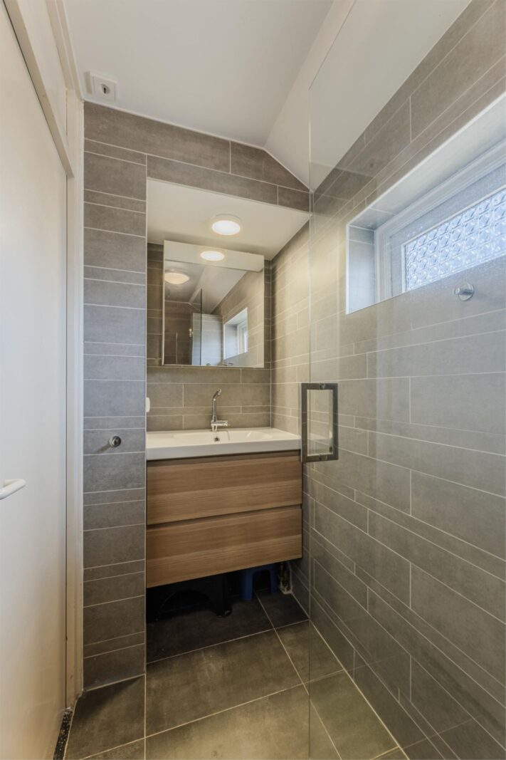De bovenverdieping heeft drie slaapkamers en een moderne badkamer (2021). Bij de twee kleinere slaapkamers is de kruipzolder gedeeltelijk verwijderd, waardoor het plafond verrassend hoog is (ca 4m) en er is een vide gemaakt: ideaal als gezellige speelzolder of praktische opbergruimte. Verder is alles op deze verdieping grondig aangepakt in 2020, plafonds vernieuwd, extra dakramen geplaatst, optimale isolatie en volledig vernieuwde electra.