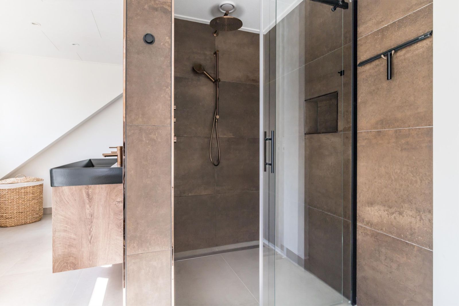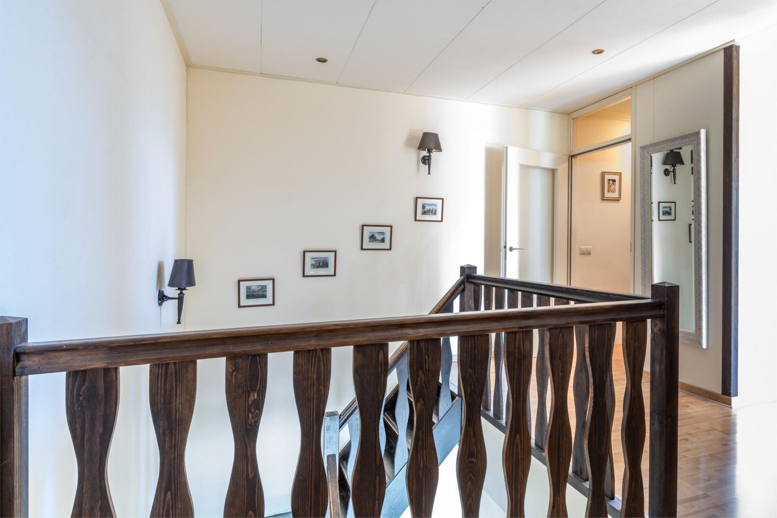 Eerste verdieping: overloop, royale slaapkamer (gerealiseerd door samenvoegen van twee kamers), badkamer voorzien van douche, toilet en wastafel, tweede slaapkamer, doorloopkamer in gebruik als kastenkamer, derde ouderslaapkamer met dakkapel en aangrenzende moderne badkamer voorzien van inloopdouche, toilet, dubbele wastafel met meubel, vloerverwarming en handdoekradiator, hal met trapopgang naar de zolder.
