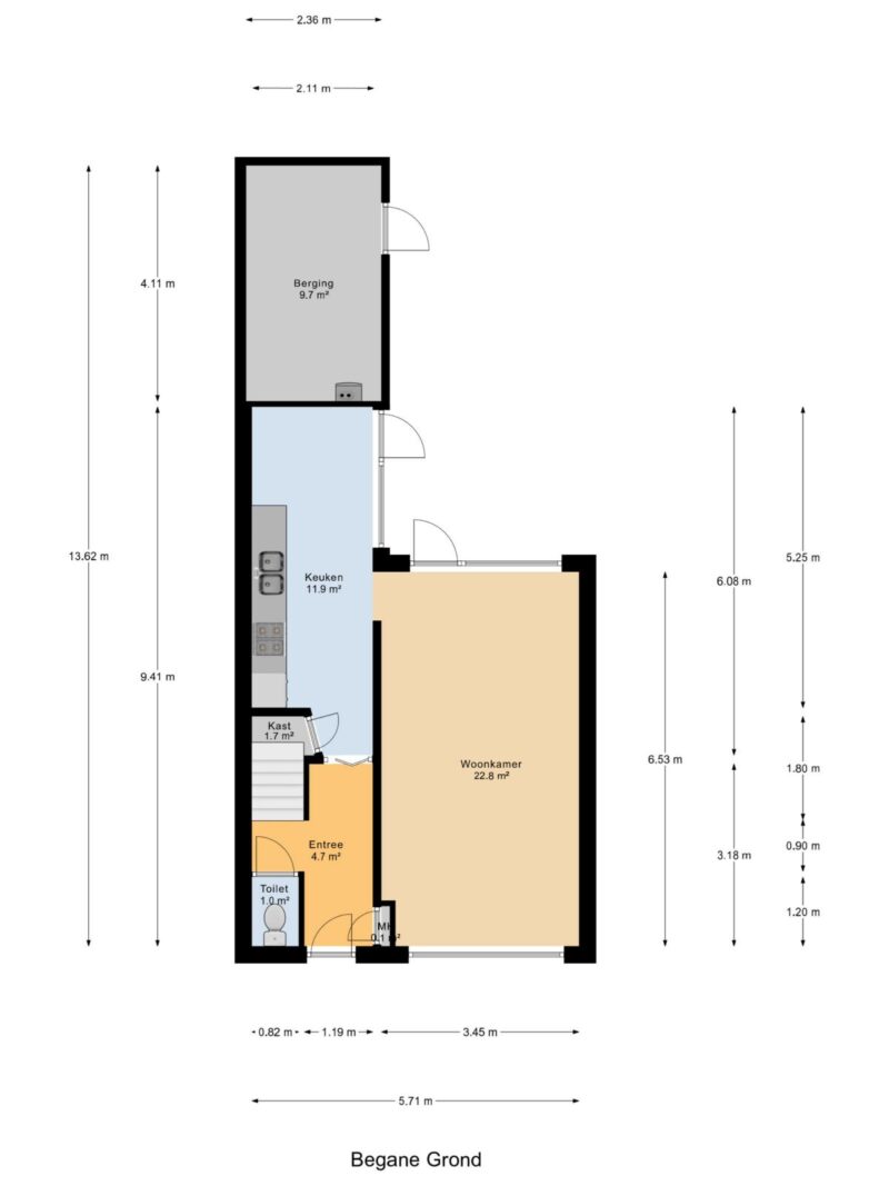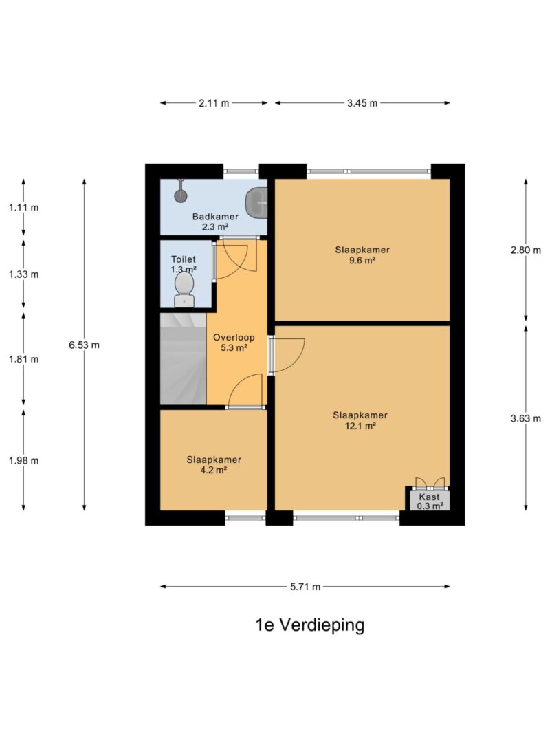 Hal, toilet, bergkast, dichte keuken met inbouwapparatuur te weten: oven, gaskookplaat en afzuigkap en woonkamer. Eerste verdieping: overloop, toilet, badkamer met douche en wastafel en drie slaapkamers . Uitgebouwde slaap/zolderkamer met veel bergruimte