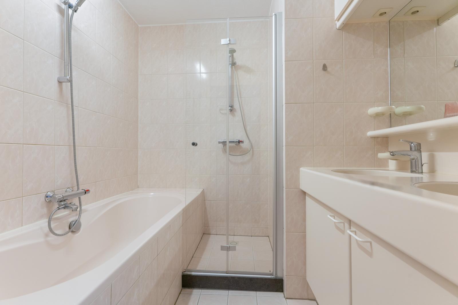 Via de overloop kom je bij de badkamer, het toilet en de tweede slaapkamer. De badkamer is comfortabel ingericht met een ligbad, aparte douche en dubbele wastafelmeubel. Ideaal als je jezelf wat extra luxe gunt. De tweede slaapkamer is net zo licht en prettig als de rest van het appartement. En ook vanuit deze kamer stap je zó het grote balkon op. Dat maakt het balkon echt een verlengstuk van het wonen: binnen en buiten lopen hier heerlijk in elkaar over.