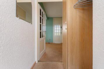 Wanneer je via de voordeur binnenkomt, stap je de hal in en loop je zo de lichte en ruime woonkamer binnen. Door de grote ramen en het vrije uitzicht voelt deze ruimte meteen warm en uitnodigend aan. Er is genoeg plek voor een gezellige zithoek, eethoek én bijvoorbeeld een werkplek of leeshoek waar je je even kunt terugtrekken.