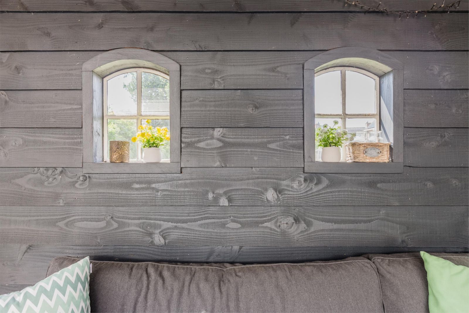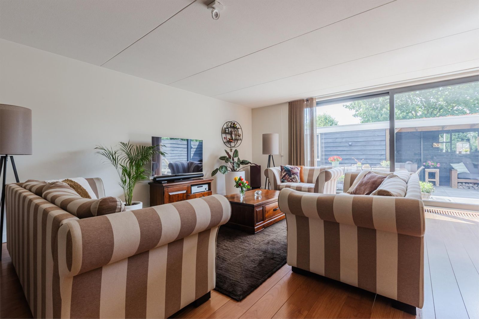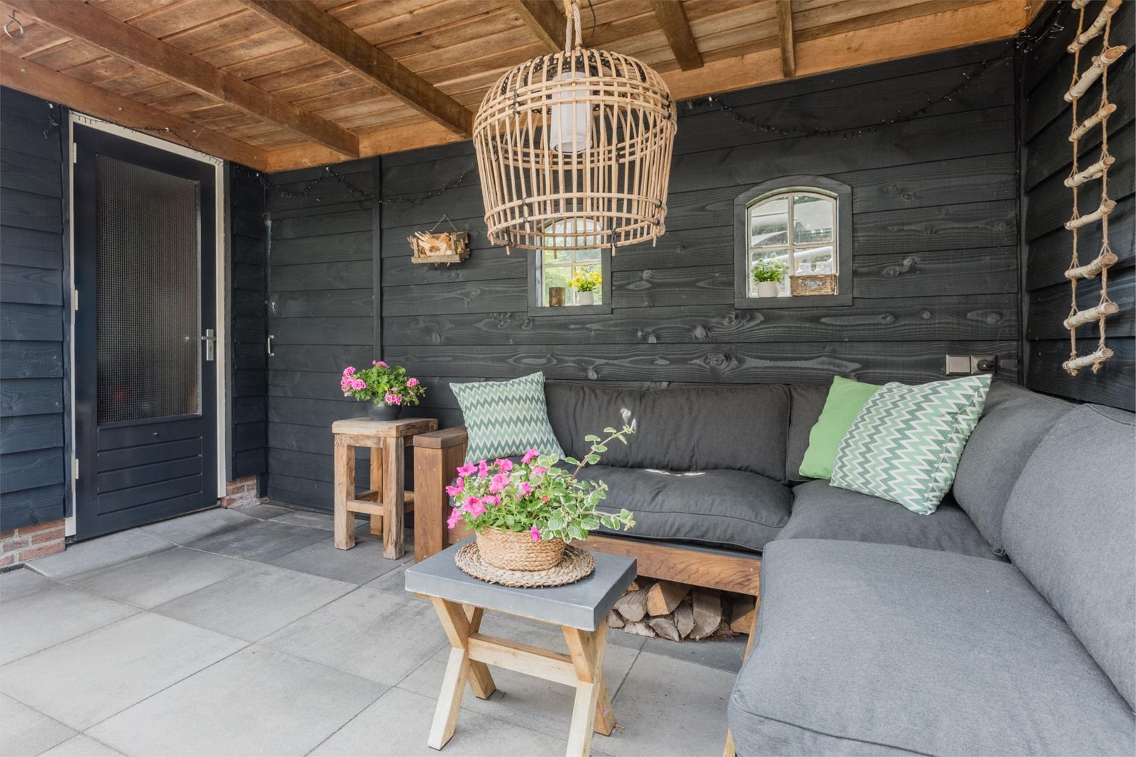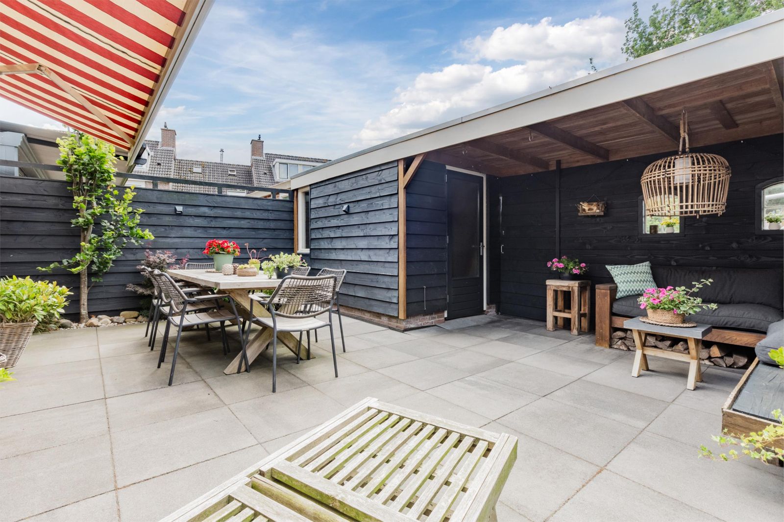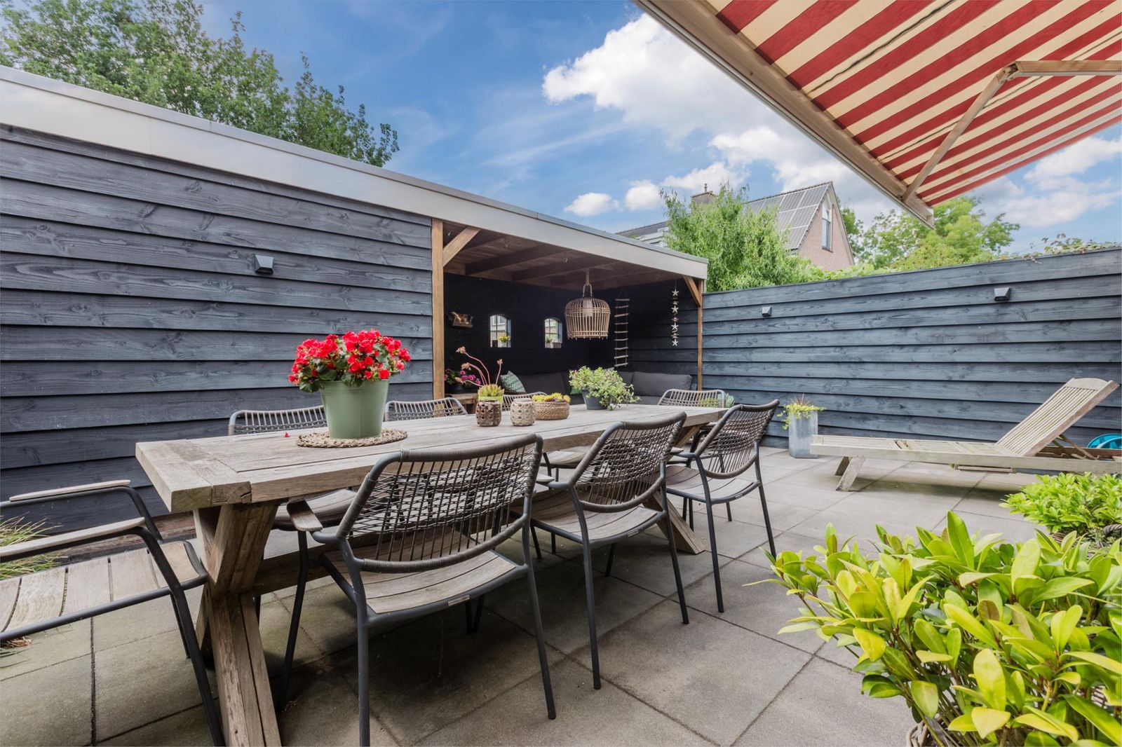 De achtertuin ligt op het zuidwesten en is voorzien van een overkapping met een gezellig zitje. Op het dak van de overkapping is sedum beplanting aangelegd. De schuur staat ook in de achtertuin en er is een schuifdeur zodat men ook achterom kan om bijvoorbeeld het speeltuintje te betreden of naar de geparkeerde (tweede) auto te lopen. Aan de achtergevel is ook een elektrisch bedienbaar zonnescherm bevestigd.