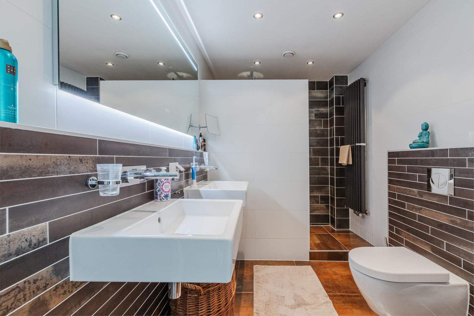 Op de eerste verdieping is de overloop met 4 slaapkamers waarvan er 1 is ingericht als inloopkast en 1 als werkplek met bureau. Eén en ander is, indien gewenst gemakkelijk weer te herstellen als slaapkamer. De badkamer is modern ingericht met een toilet, 2 spoelbakken, een verwarmde spiegel met verlichting, design radiator en een inloopdouche.