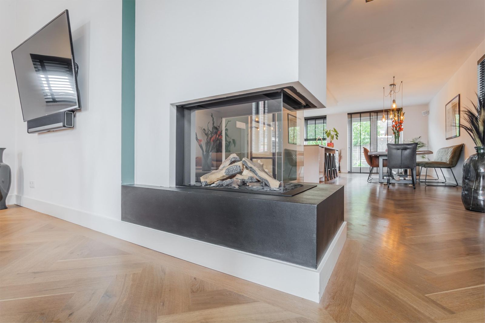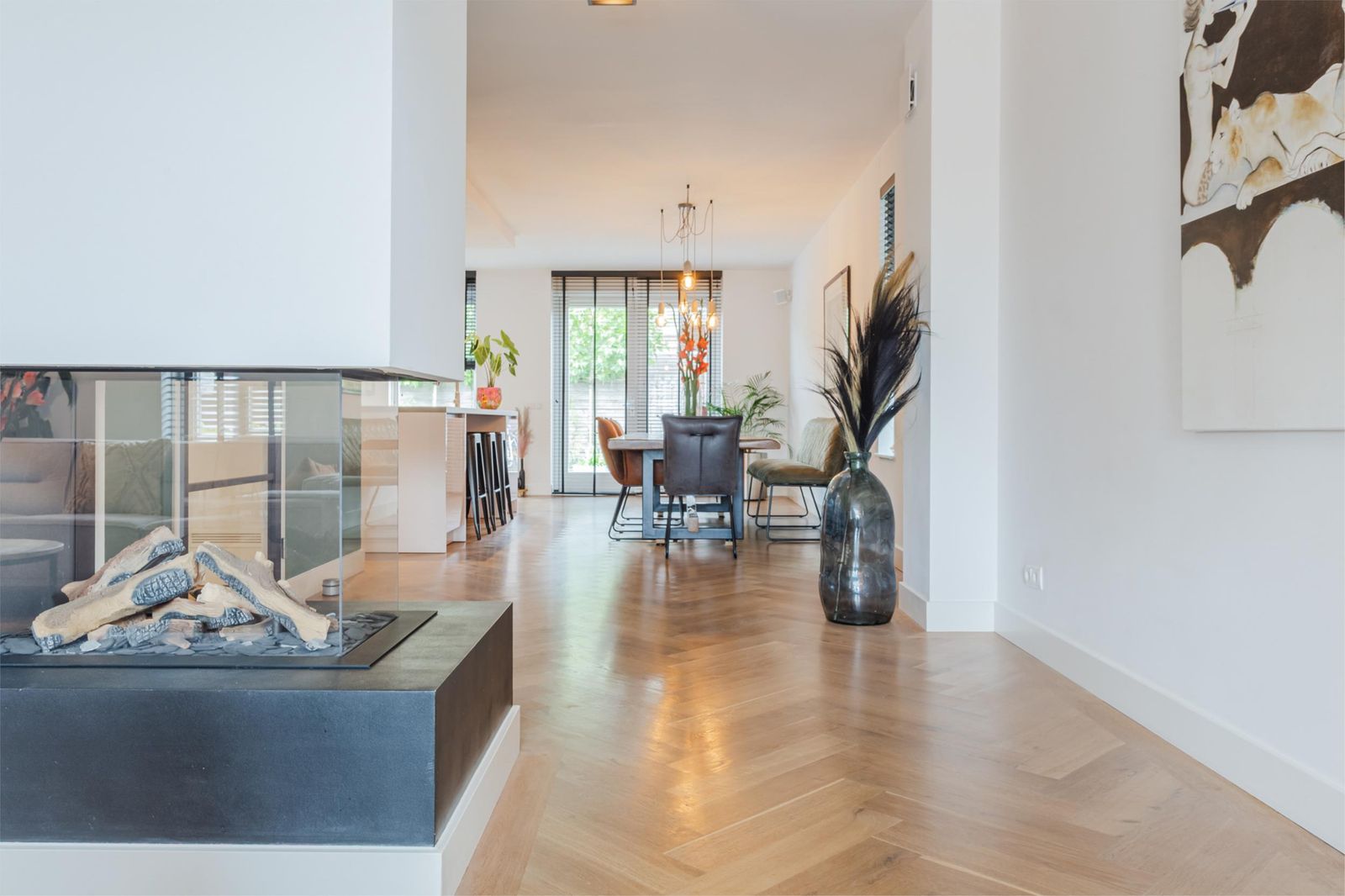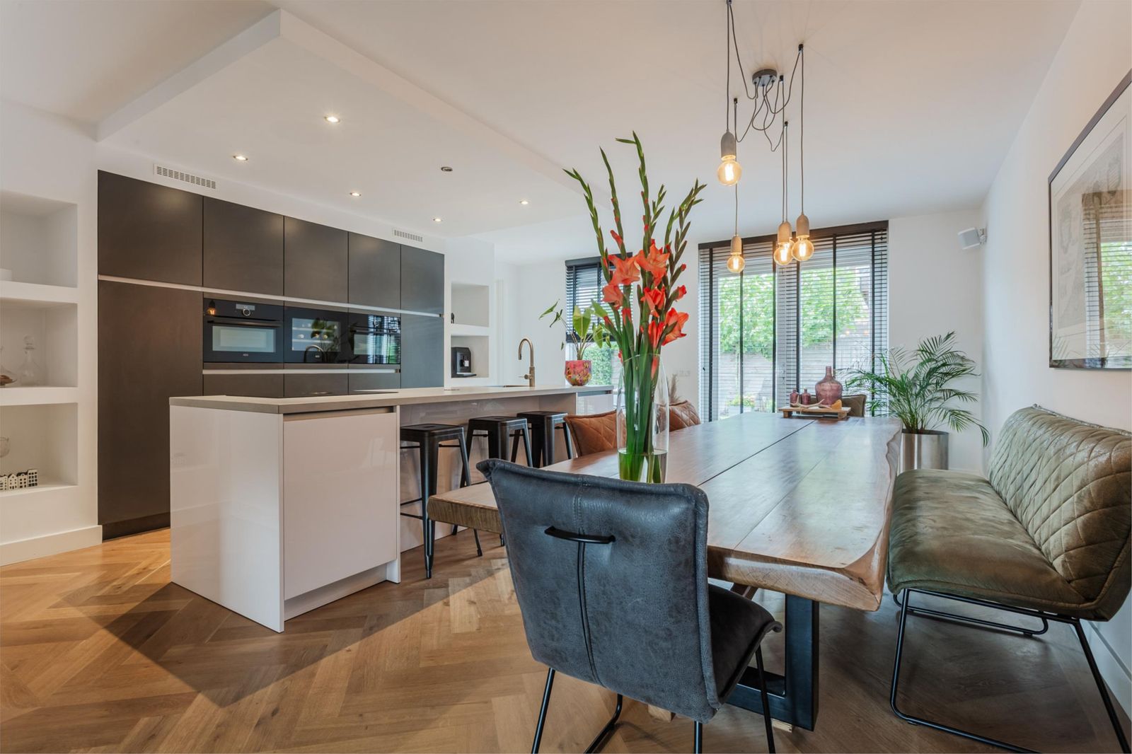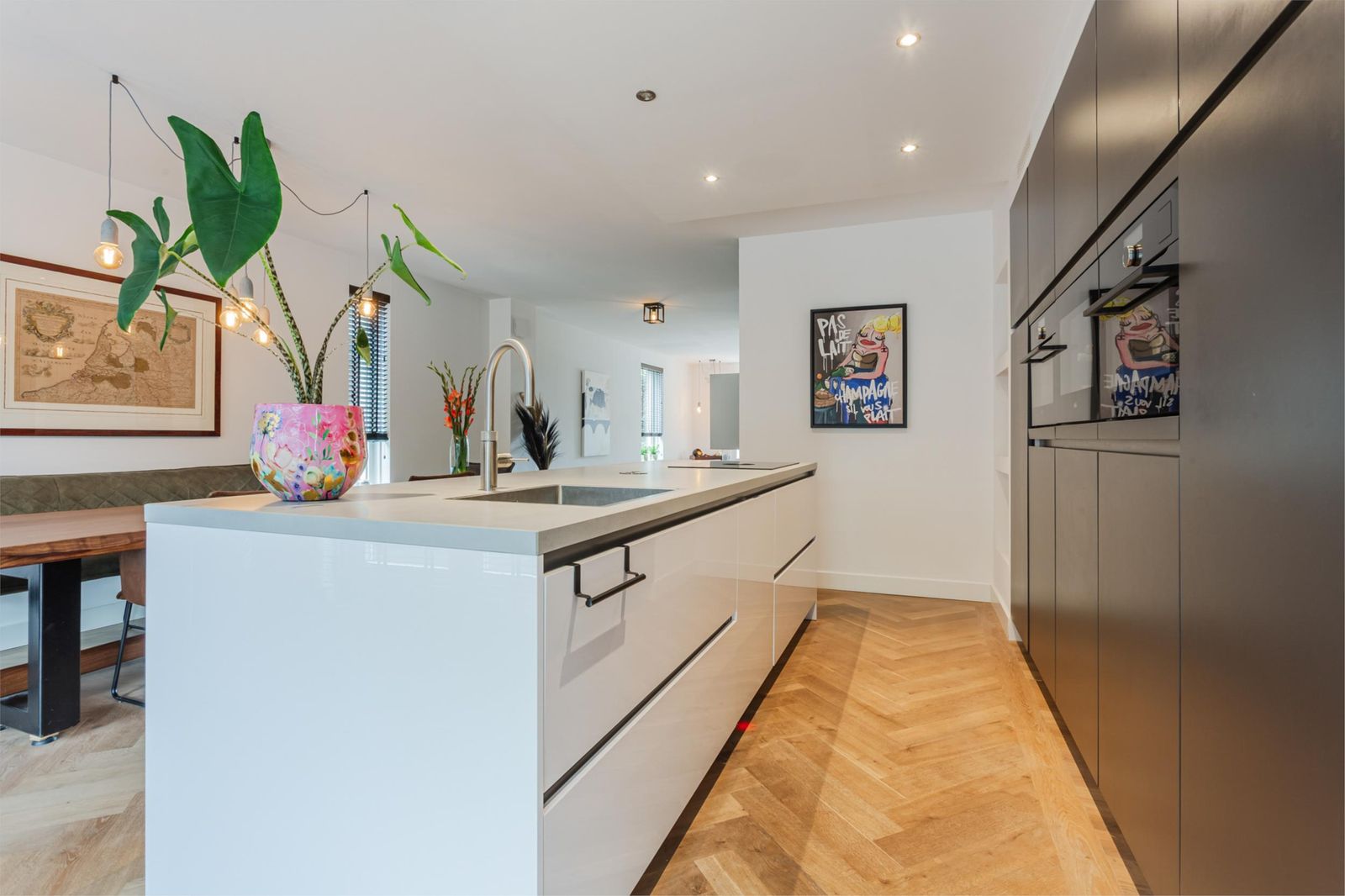 De woonkamer (ca. 30 m²) is licht en uitnodigend, met de gashaard als warme scheiding tussen zit- en eetgedeelte. De woonkeuken (ca. 36 m²) is uitgevoerd met luxe Siematic-keuken, AEG-apparatuur, twee ovens (stoom en combi) en een wijnklimaatkoelkast. Een groot kookeiland met bar maakt dit de perfecte plek voor lange maaltijden en gezellige avonden. Aansluitend ligt de tuinkamer (10 m²) met openslaande deuren naar de tuin, een fijne ruimte voor werk, spel of ontspanning. Vanuit hier bereikt u ook de garage.
