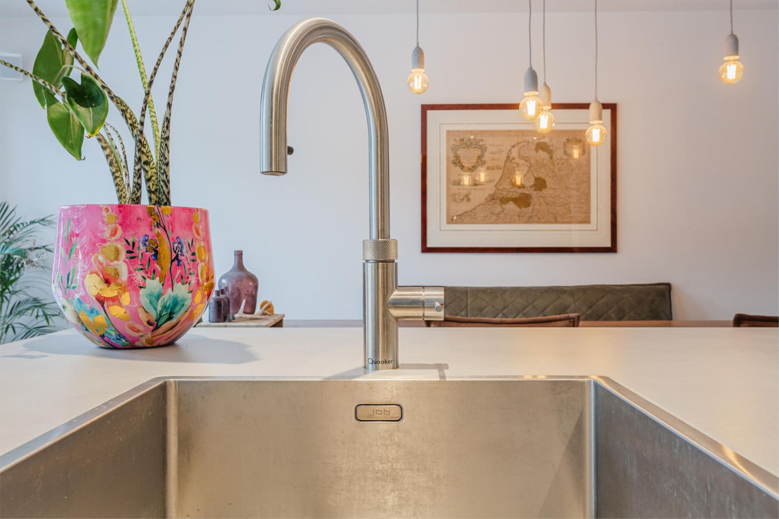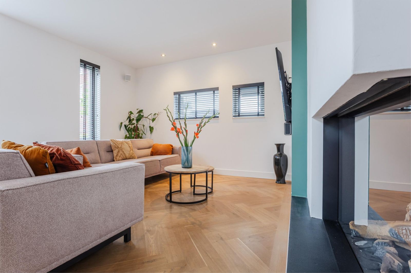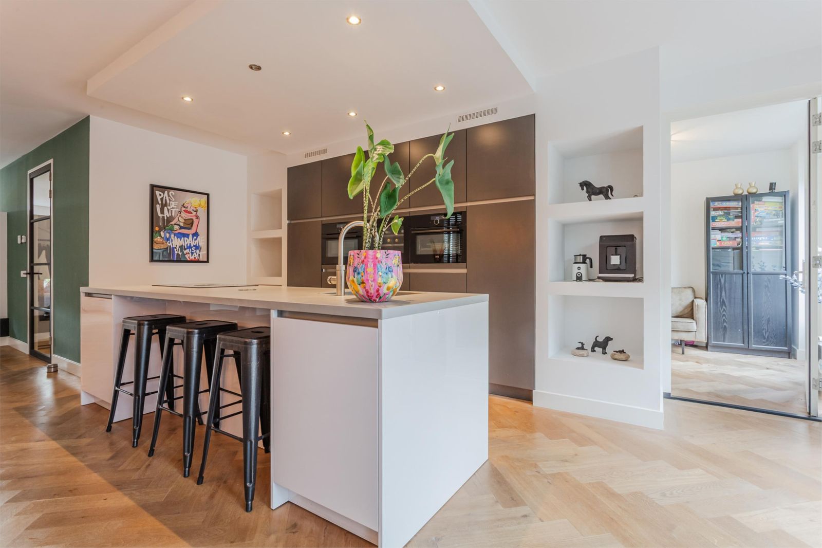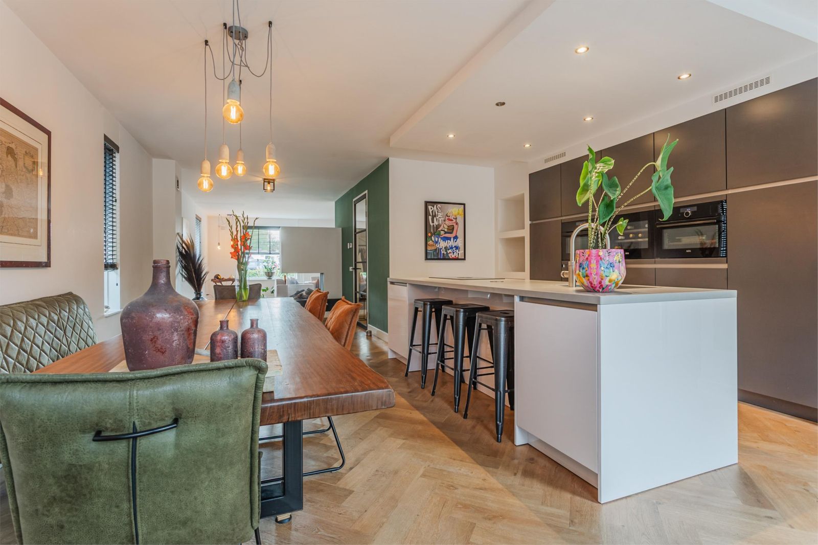 De woonkamer (ca. 30 m²) is licht en uitnodigend, met de gashaard als warme scheiding tussen zit- en eetgedeelte. De woonkeuken (ca. 36 m²) is uitgevoerd met luxe Siematic-keuken, AEG-apparatuur, twee ovens (stoom en combi) en een wijnklimaatkoelkast. Een groot kookeiland met bar maakt dit de perfecte plek voor lange maaltijden en gezellige avonden. Aansluitend ligt de tuinkamer (10 m²) met openslaande deuren naar de tuin, een fijne ruimte voor werk, spel of ontspanning. Vanuit hier bereikt u ook de garage.