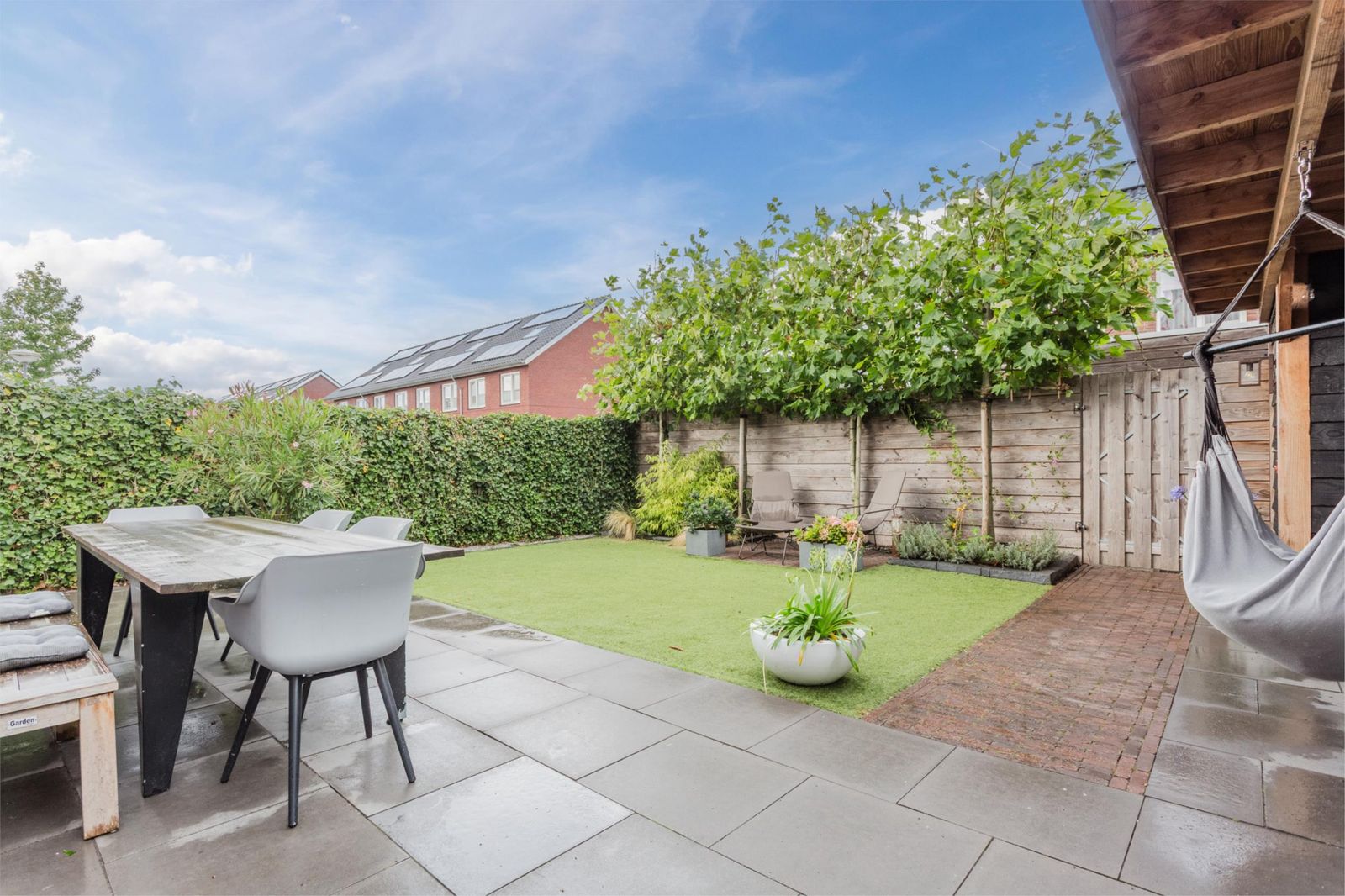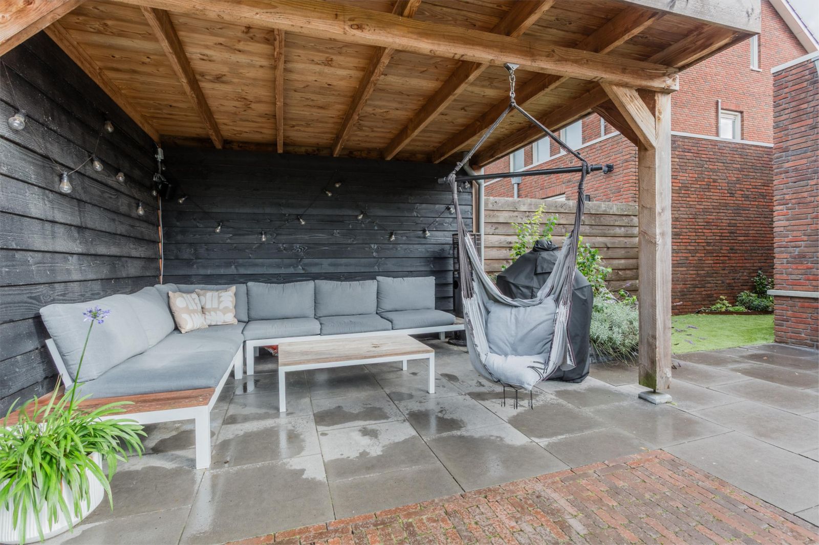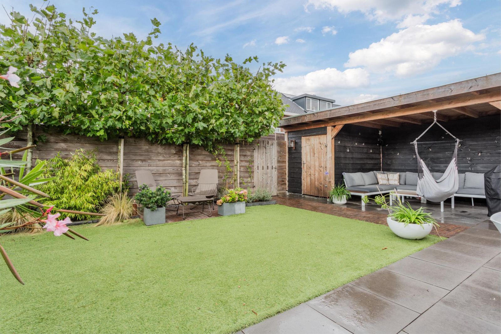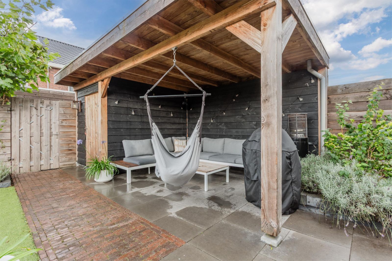 De tuin op het noordwesten is royaal en zonnig. Achterin staat een grote schuur met overkapping, een plek waar u ook in het voor- en najaar buiten kunt zitten. Het ligterras vangt de zon de hele dag en is ideaal om te ontspannen. Hier is ruimte voor spel, tuinieren en lange avonden met vrienden of familie. Aan de voorzijde is ruime parkeergelegenheid op eigen terrein.