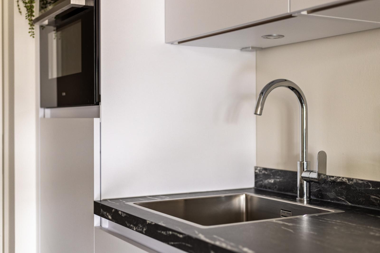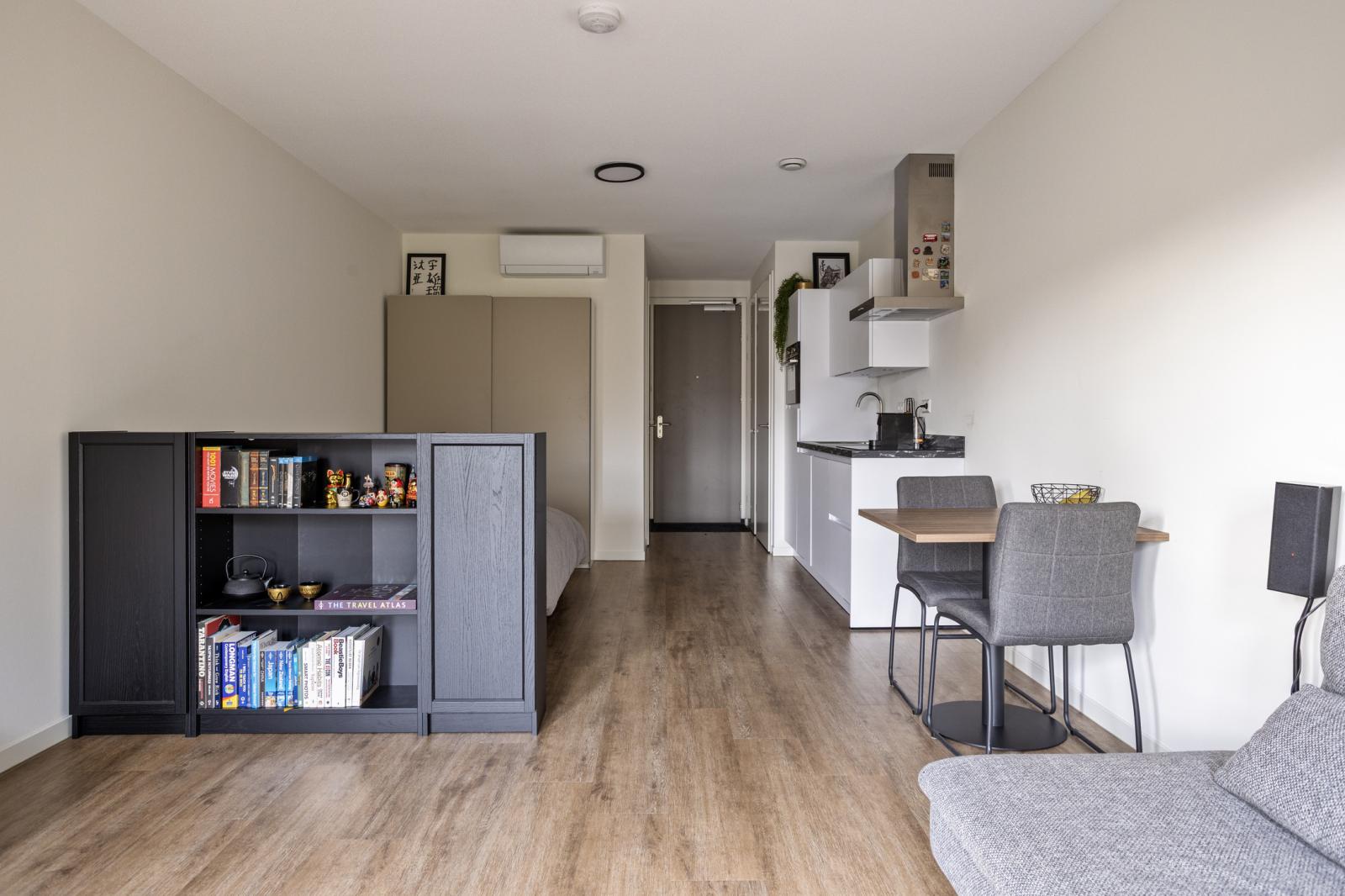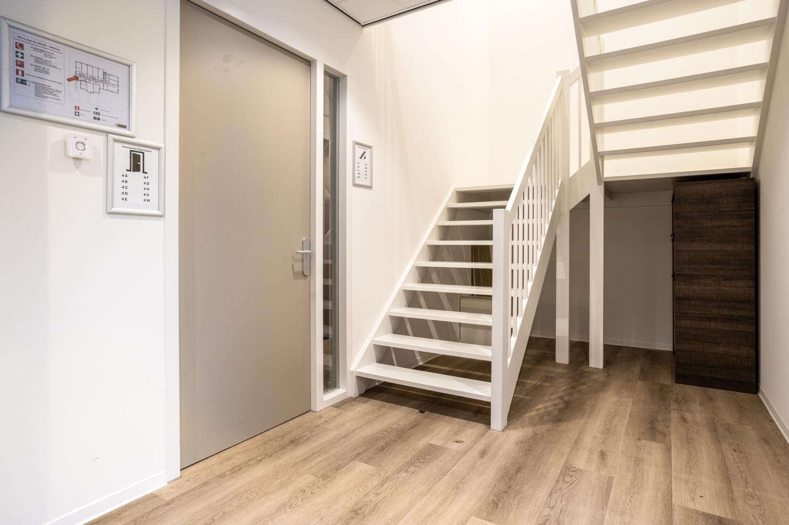 Je komt binnen via je eigen voordeur in de hal met meterkast. Vanuit hier heb je toegang tot de moderne badkamer en de lichte woon-/slaapkamer met open keuken.