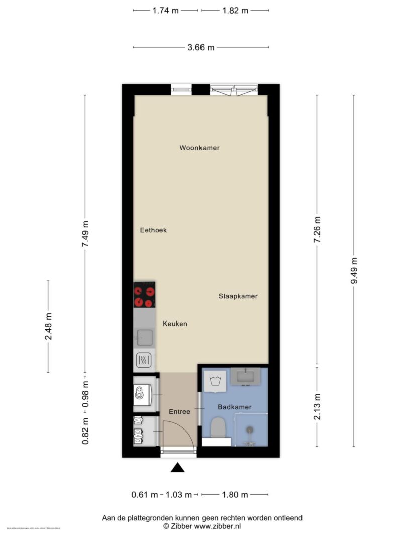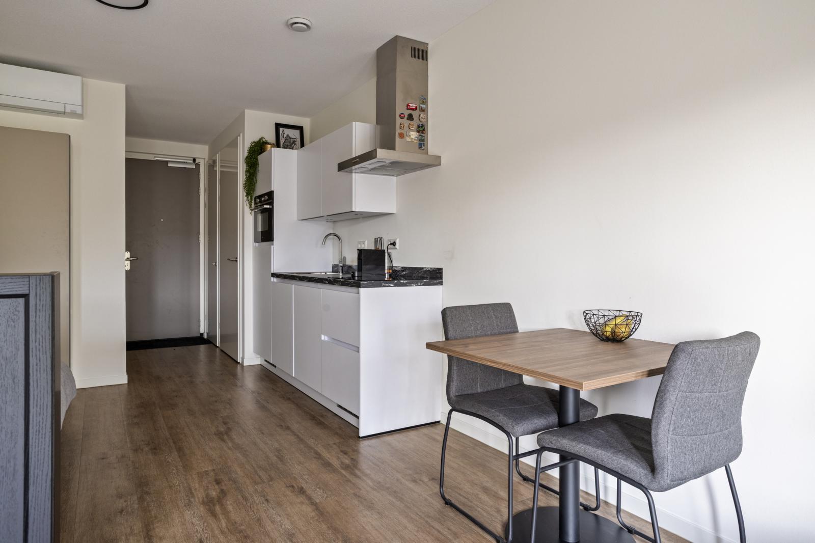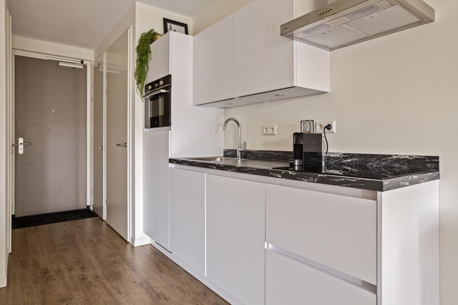 Je komt binnen via je eigen voordeur in de hal met meterkast. Vanuit hier heb je toegang tot de moderne badkamer en de lichte woon-/slaapkamer met open keuken.