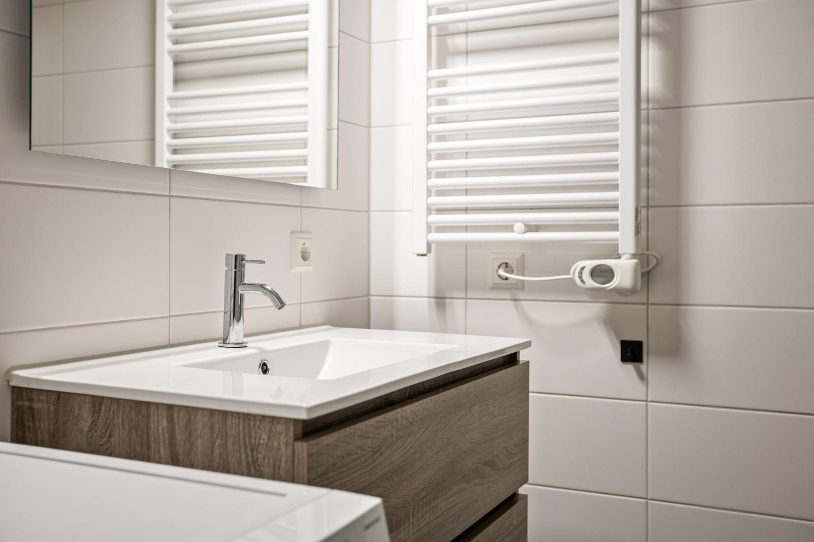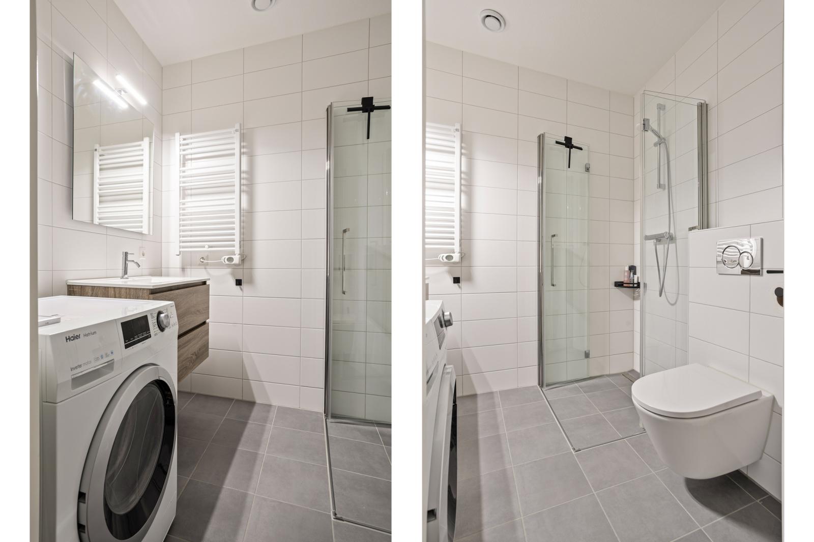 De badkamer is modern afgewerkt in neutrale tinten en uitgerust met een wastafelmeubel, toilet, douche met inklapbare wand, mechanische ventilatie en aansluiting voor de wasmachine.