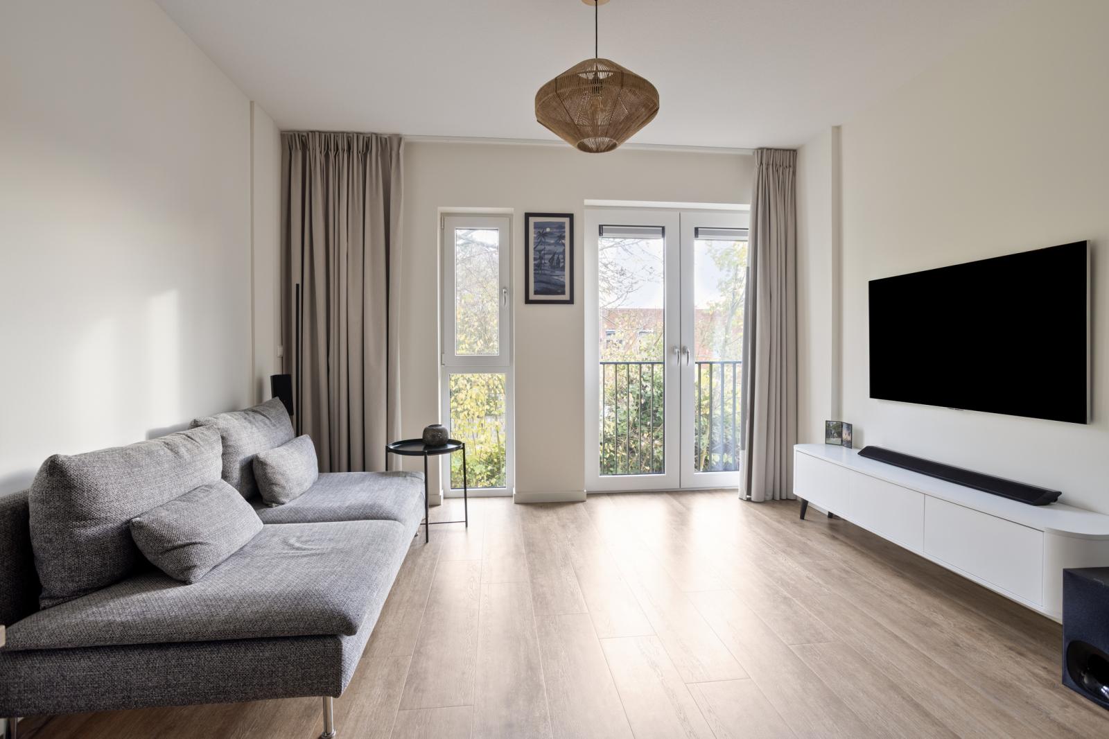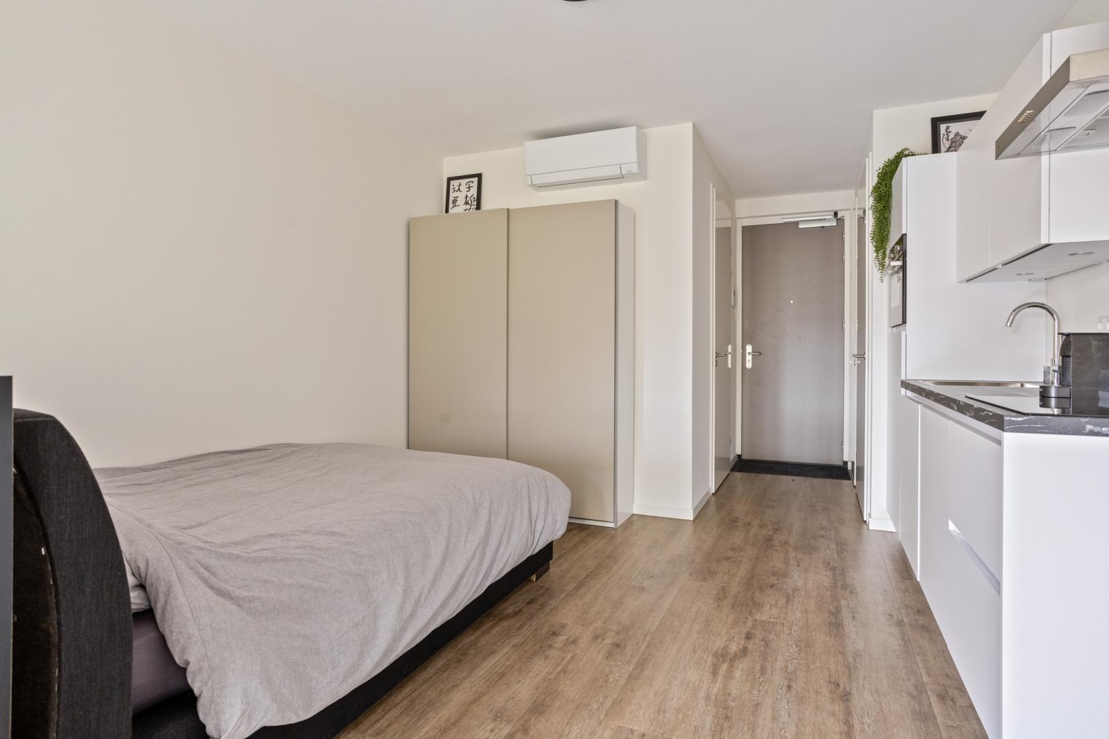 De woon-/slaapkamer (ca. 27 m²) ligt aan de achterzijde van het gebouw en biedt volop privacy. Grote raampartijen met een Frans balkon zorgen voor een fijne lichtinval en een ruimtelijk gevoel.