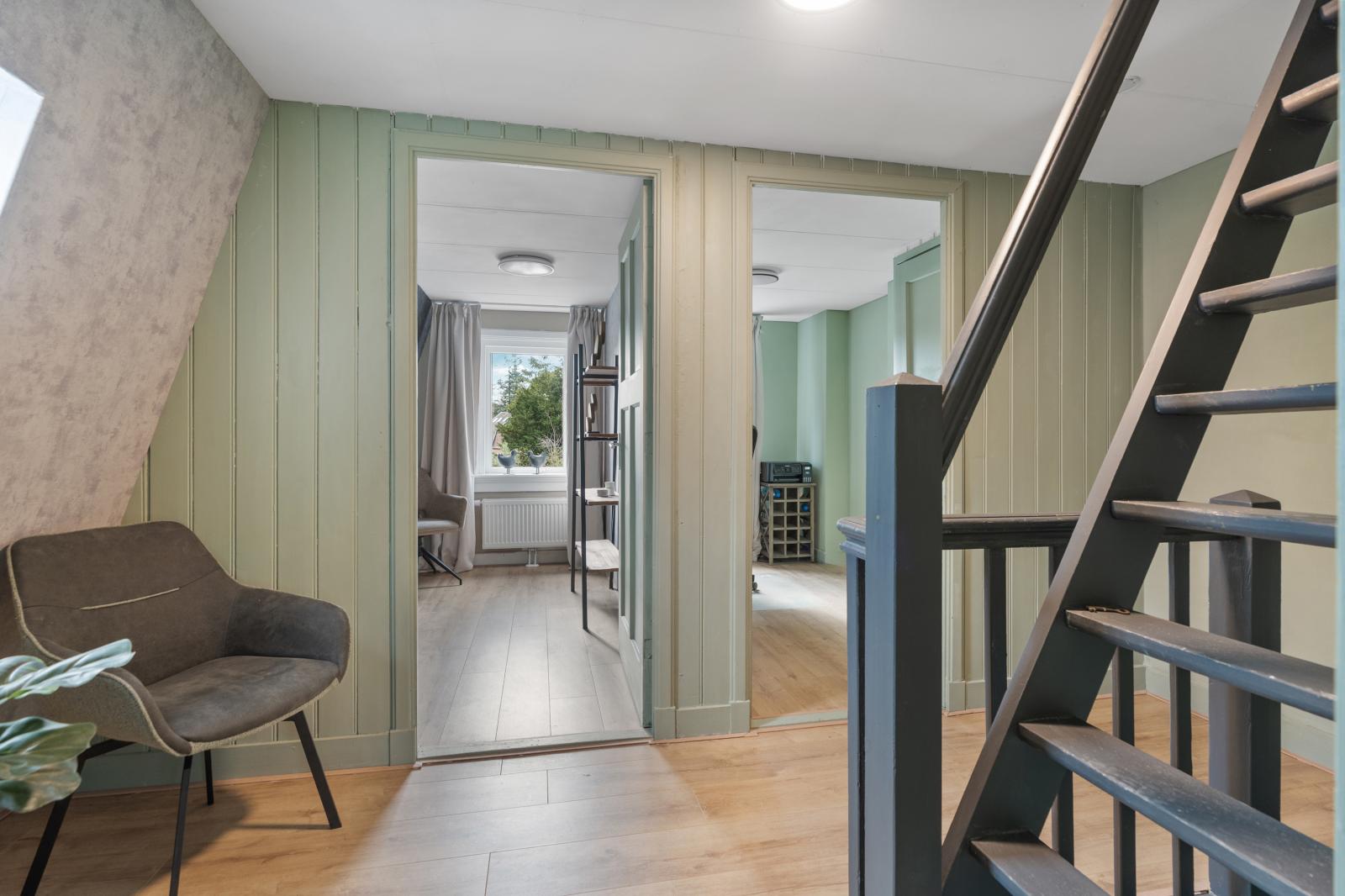 Via de trapopgang bereik je de eerste verdieping. Hier bevinden zich drie slaapkamers, ieder met een fijne lichtinval. De kamers zijn praktisch ingedeeld en geschikt als slaapkamer, werkkamer of hobbyruimte. Hierdoor is de woning geschikt voor verschillende woonwensen en levensfasen.