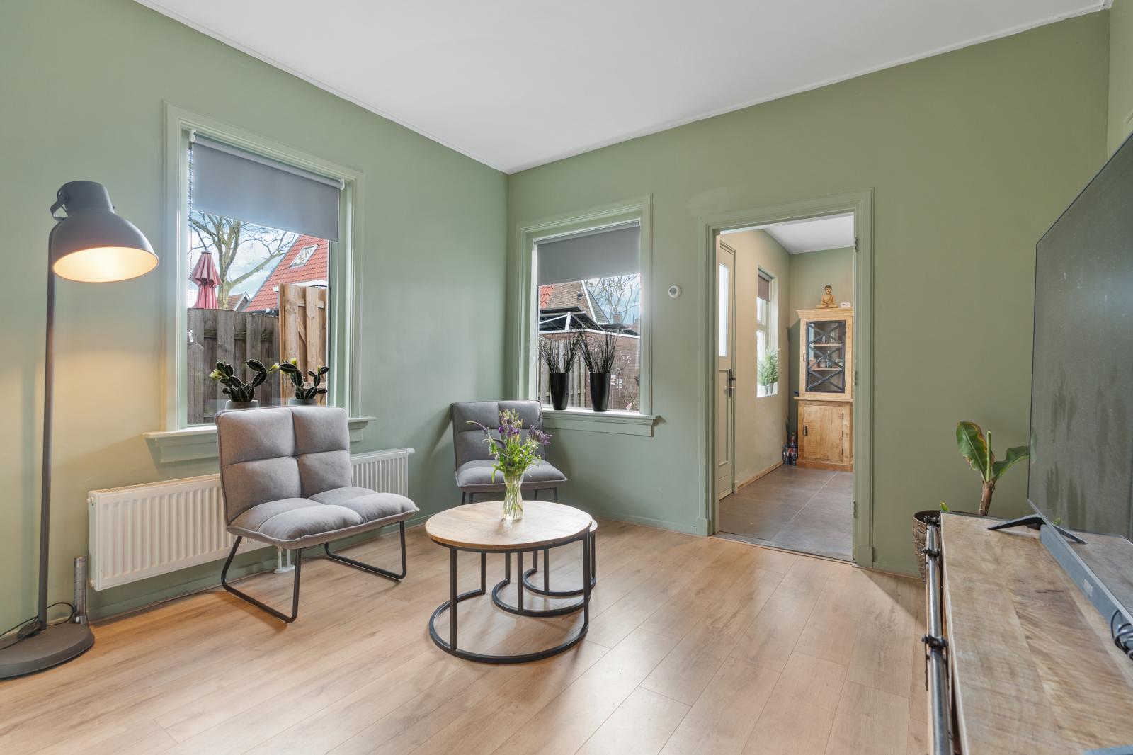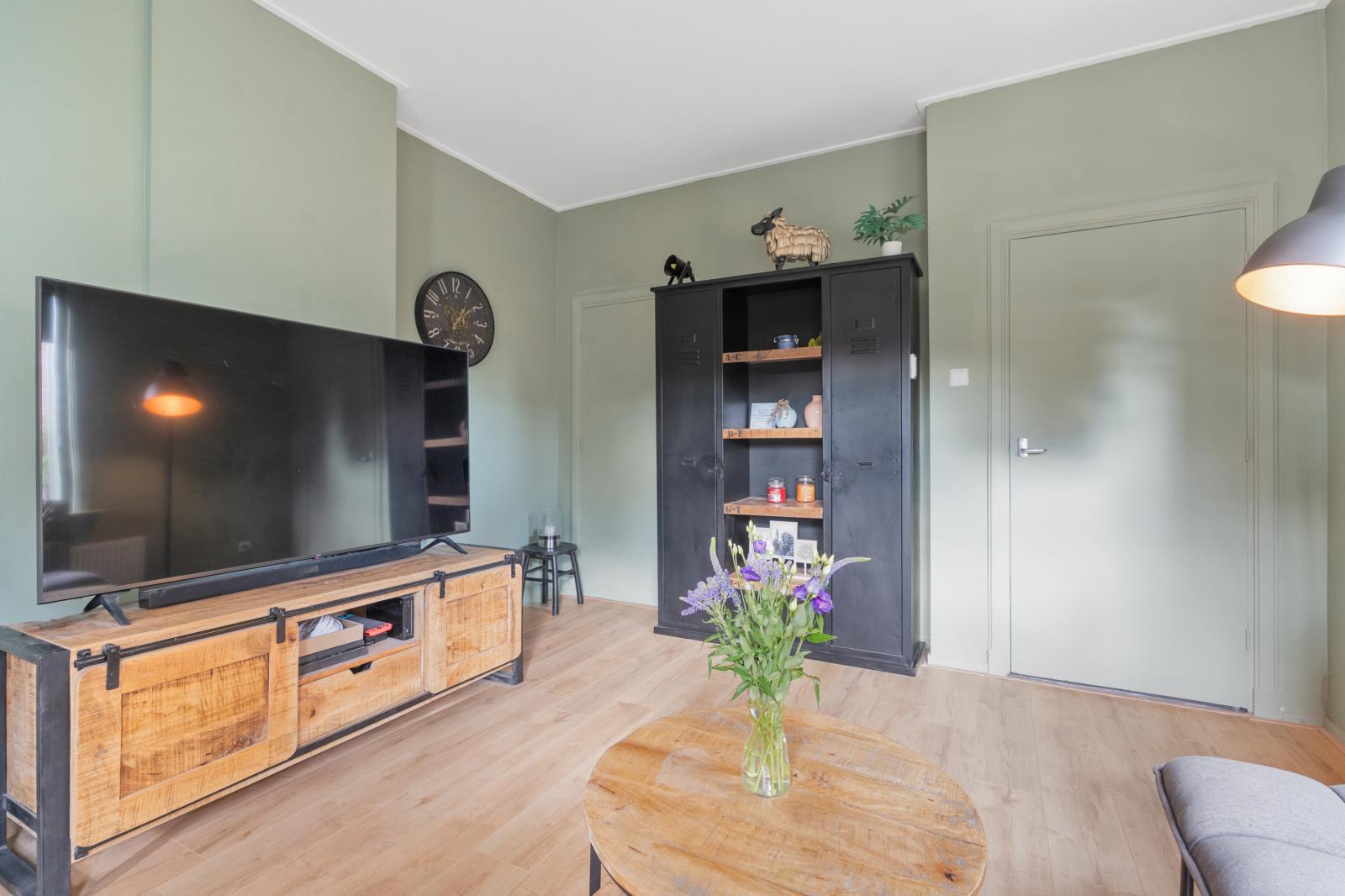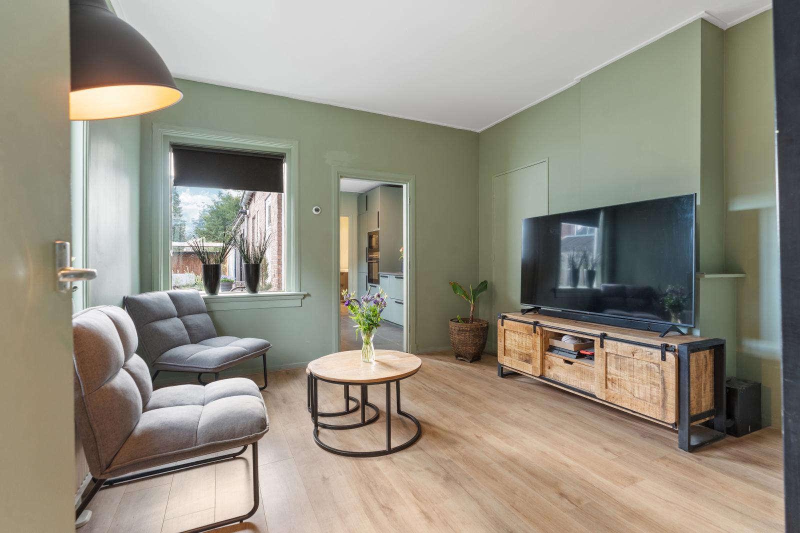 Via de entree kom je binnen in de hal met toegang tot de voorkamer, woonkamer en de trap naar de verdieping. Zodra je de woonkamer binnenstapt, valt direct het prettige licht op. De ruimte voelt warm en gezellig aan en biedt volop mogelijkheden voor een comfortabele zithoek. Vanuit de woonkamer loop je door naar de moderne keuken uit 2025. De keuken heeft een strakke en eigentijdse uitstraling en is praktisch ingericht, waardoor koken hier een plezier wordt.