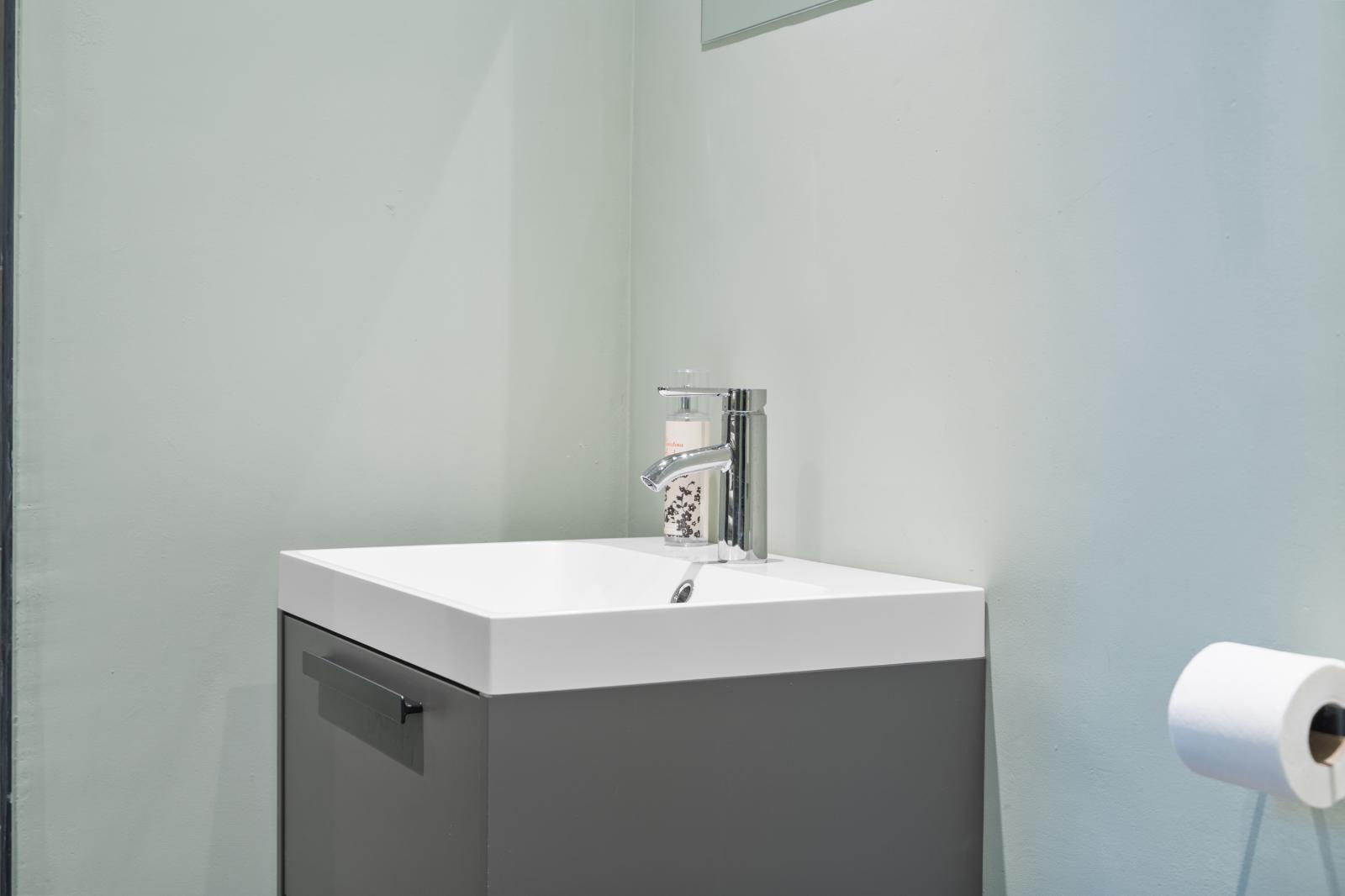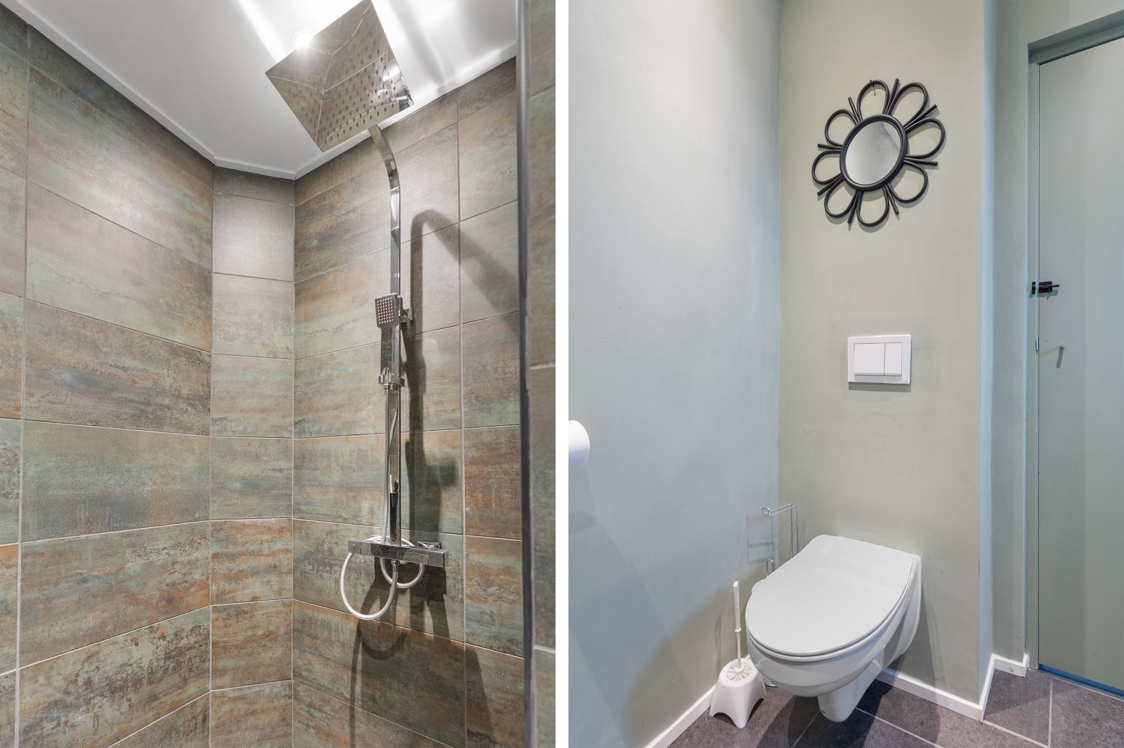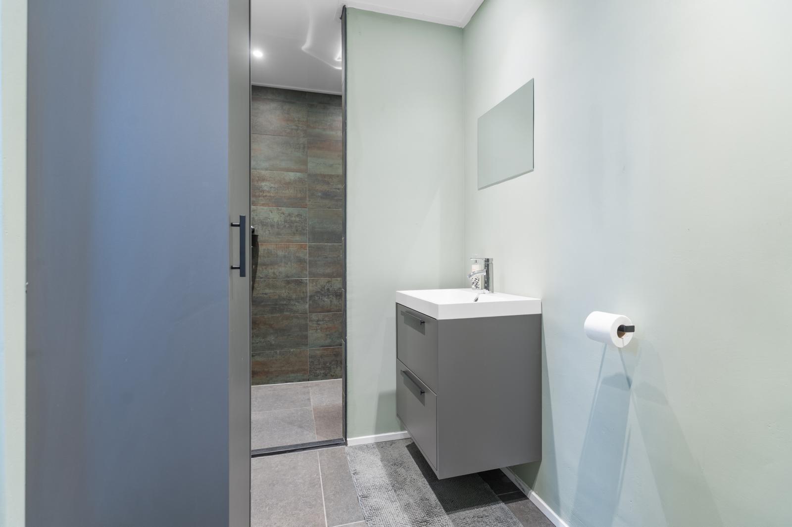 Vanuit de keuken is er toegang tot de badkamer op de begane grond. Bij binnenkomst in de badkamer vind je een strak wastafelmeubel met opbergruimte en een moderne wastafel. Daarnaast beschikt de badkamer over een toilet en een ruime inloopdouche. De kleurstellingen zorgen voor een rustige en verzorgde uitstraling, waardoor het een comfortabele plek is voor de dagelijkse verzorging.