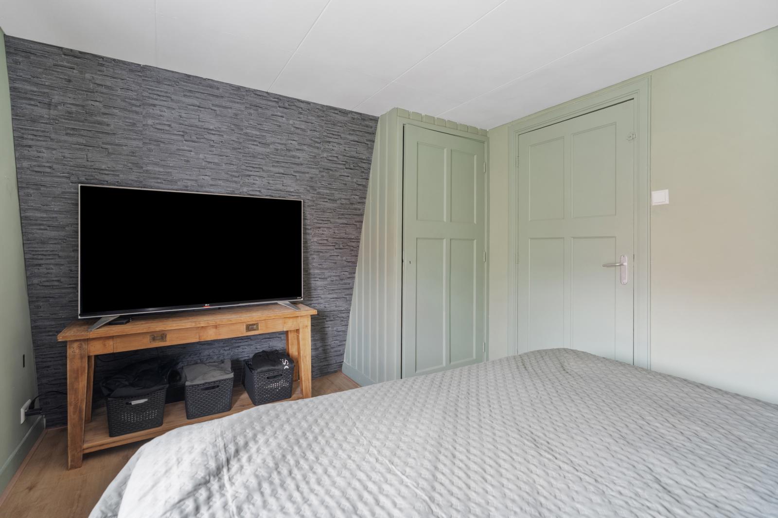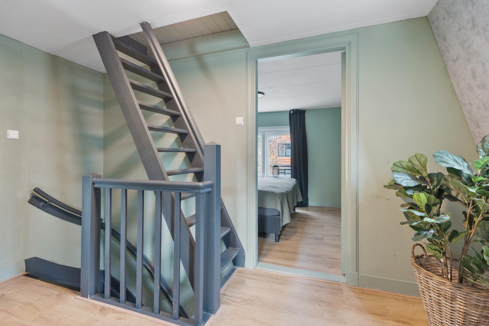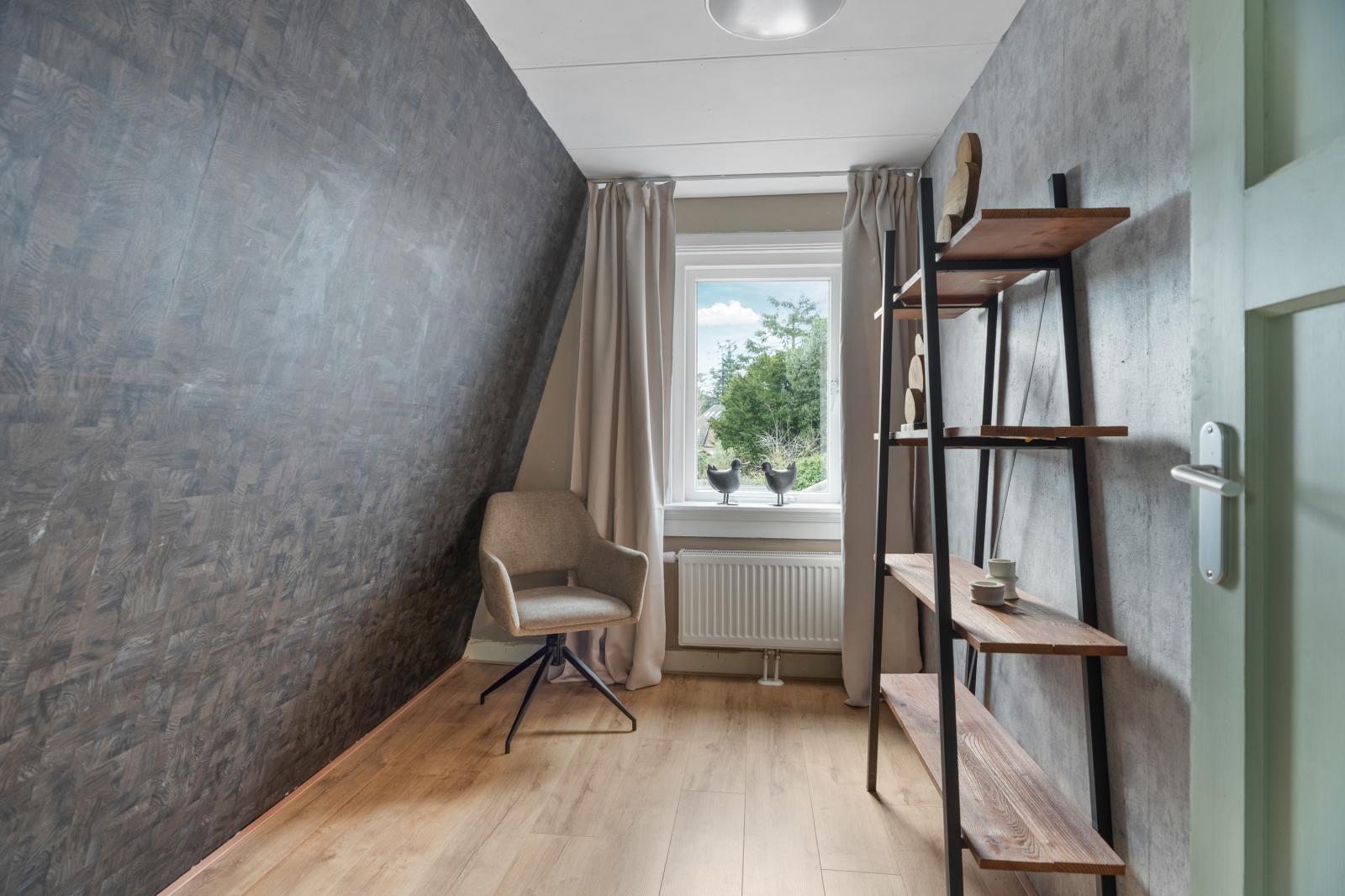 Via een vaste trap bereik je de zolderverdieping. Deze verdieping bestaat uit een open ruimte met een verrassend goede stahoogte en biedt volop mogelijkheden. Hier is voldoende plek voor het opbergen van seizoensspullen of het creëren van een praktische opslagruimte. Door de open indeling is de verdieping bovendien naar eigen wens in te delen, bijvoorbeeld met een extra kamer of een werkplek.