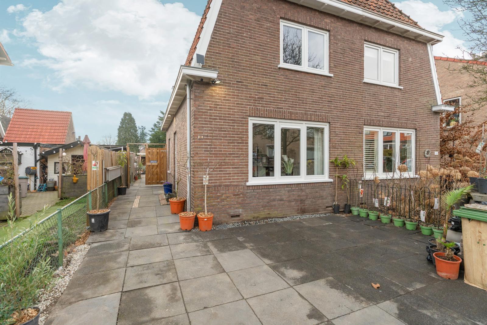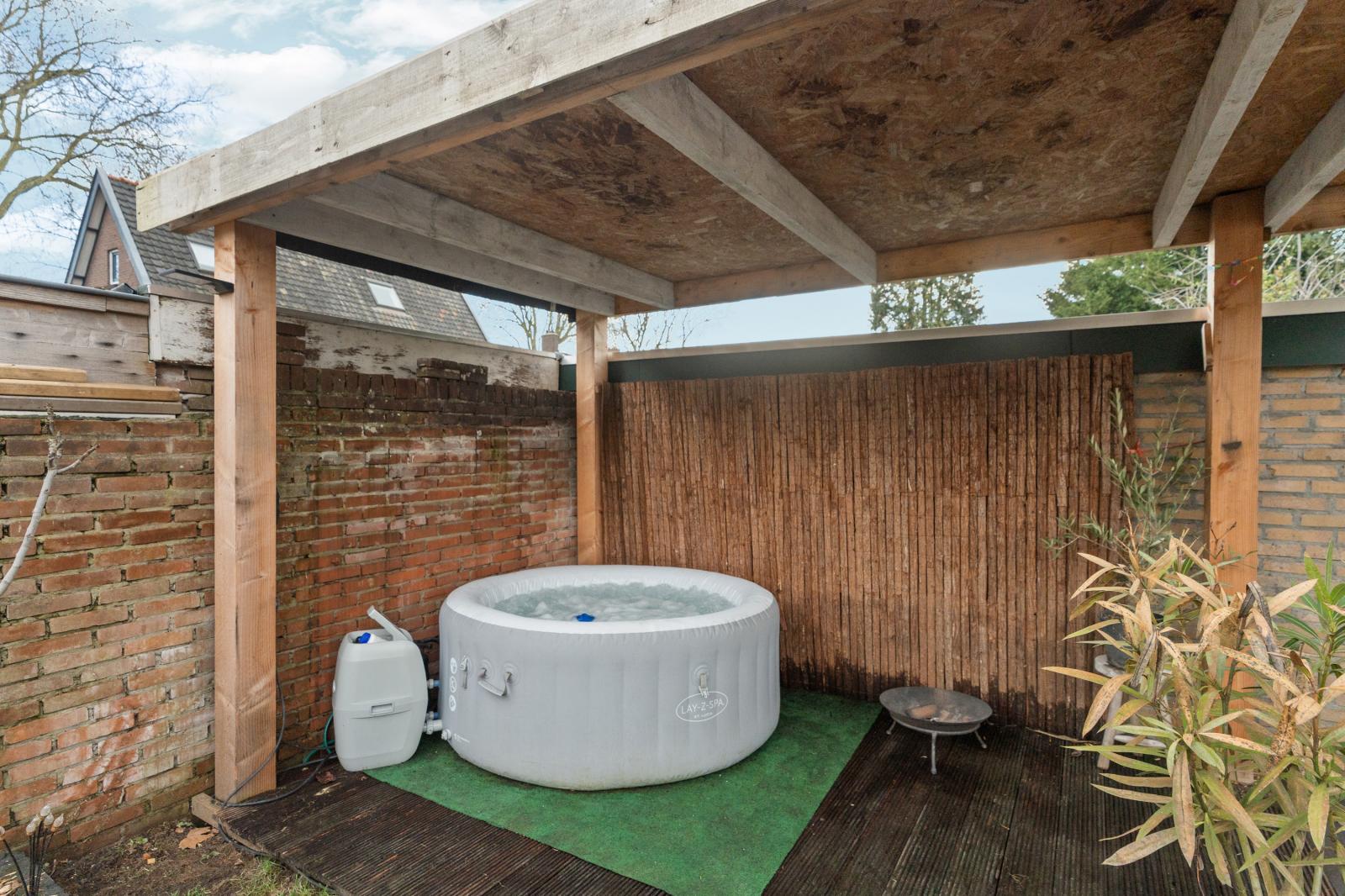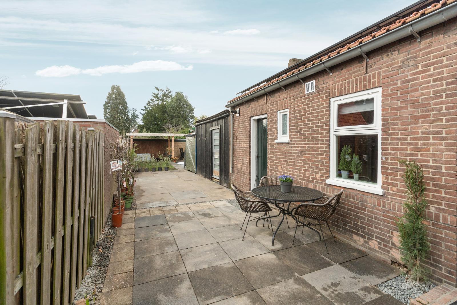 Via de achterzijde van de woning stap je de diepe, zonnige achtertuin in. Hier kun je op verschillende plekken heerlijk zitten en genieten van het buitenleven. Het zwembad zorgt voor een extra luxe en maakt deze tuin een perfecte plek voor warme zomerdagen. Achterin de tuin bevindt zich een overkapping waar je ook op minder zonnige dagen comfortabel buiten kunt zitten. Hier geniet je van rust, groen en privacy.