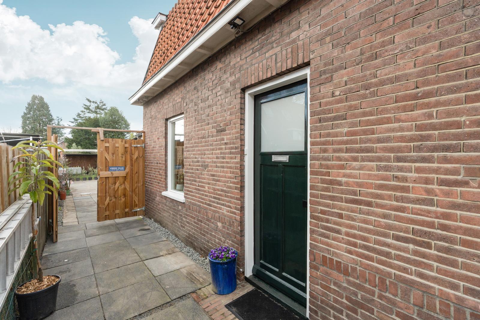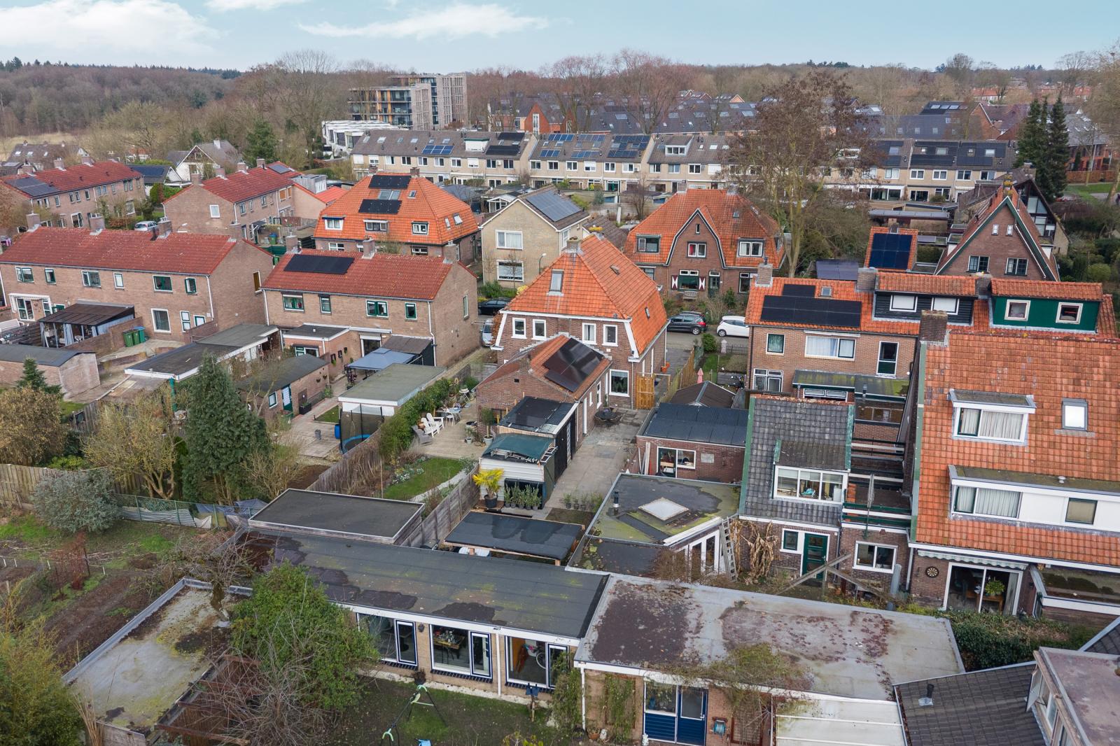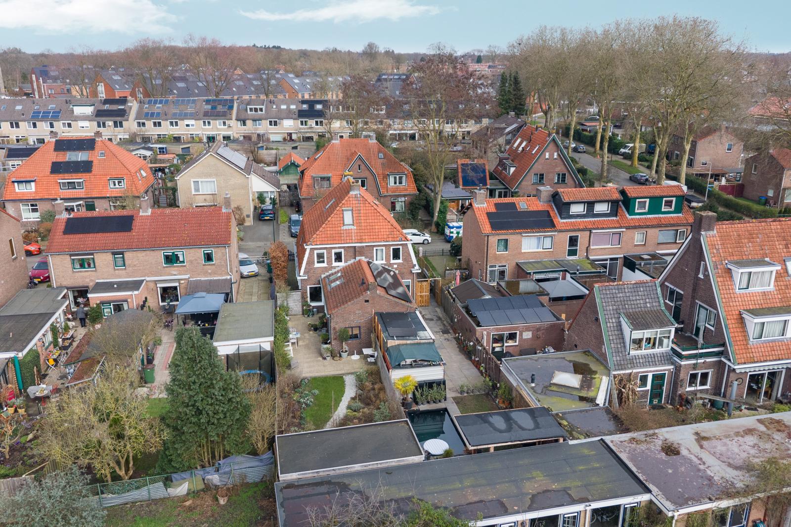 Via de achterzijde van de woning stap je de diepe, zonnige achtertuin in. Hier kun je op verschillende plekken heerlijk zitten en genieten van het buitenleven. Het zwembad zorgt voor een extra luxe en maakt deze tuin een perfecte plek voor warme zomerdagen. Achterin de tuin bevindt zich een overkapping waar je ook op minder zonnige dagen comfortabel buiten kunt zitten. Hier geniet je van rust, groen en privacy.