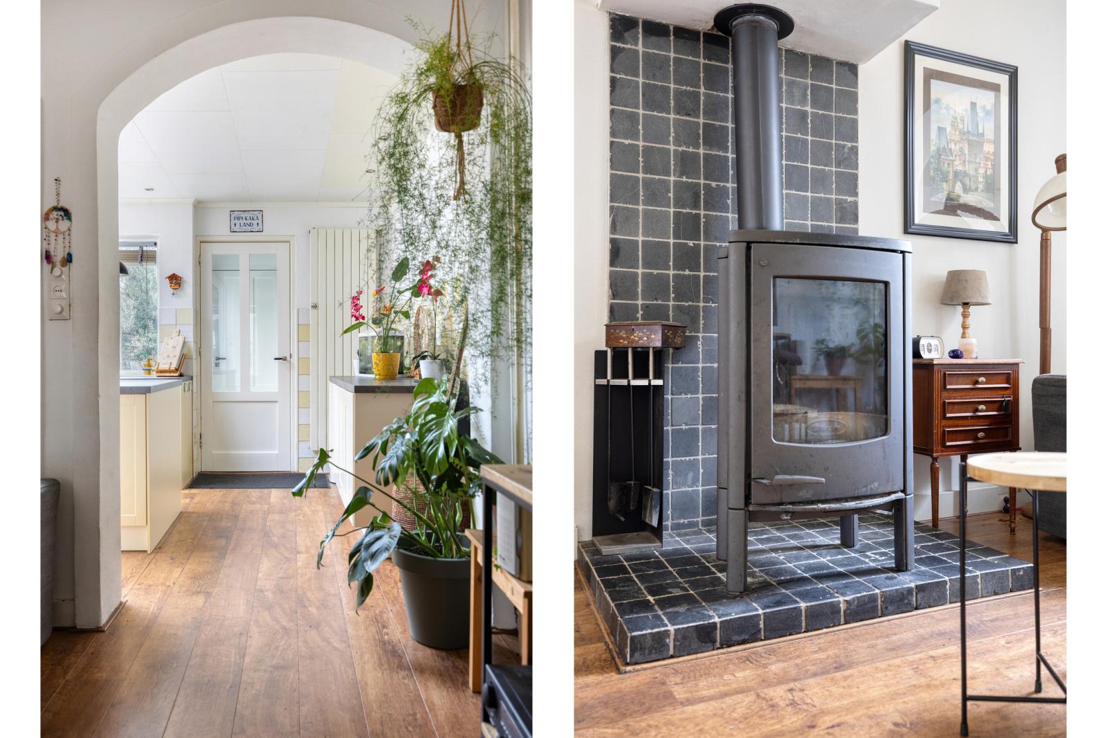 U stapt binnen in de hal, daar bevindt zich de trapopgang naar de verdieping en de toegang tot de woonkamer. Vanuit de hal hebt u toegang tot de sfeervolle woonkamer met prettige ruime afmetingen met aansluitend de uitgebouwde halfopen keuken. De woonkamer is een heerlijke plek om tot rust te komen. Deze is netjes afgewerkt met een laminaatvloer en heeft een sfeervolle schouw met een gezellige houtkachel. Er is volop ruimte voor een leuke zithoek en een grote eettafel. In de woonkamer bevindt zich een vaste trapkast en er is een leuke doorkijk vanuit de woonkamer naar de open keuken. De keuken is zondermeer ruim te noemen en heeft een praktisch werkeiland voorzien van een groot blad en diverse opbergmogelijkheden. De keuken is voorzien van inbouwapparatuur en een 6-pits gasfornuis met grote oven. De keuken is prettig licht met een lichtkoepel en een raam met een mooi zicht op het achtererf. Door de grote raampartijen stroomt het daglicht hier rijkelijk binnen en dit maakt de woonkamer en keuken prettig licht. Via de gang bereikt u vanuit de keuken de achterdeur naar het achtererf, het toilet en de badkamer. De gang, badkamer en douche zijn voorzien van vloerverwarming. De badkamer heeft een wastafelmeubel en een moderne inloopdouche met regensproeier. Tevens is de badkamer voorzien van een elektrisch verwarmingspaneel.