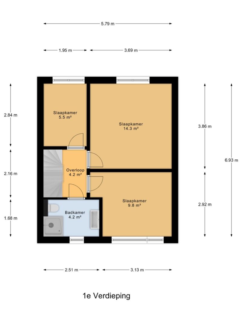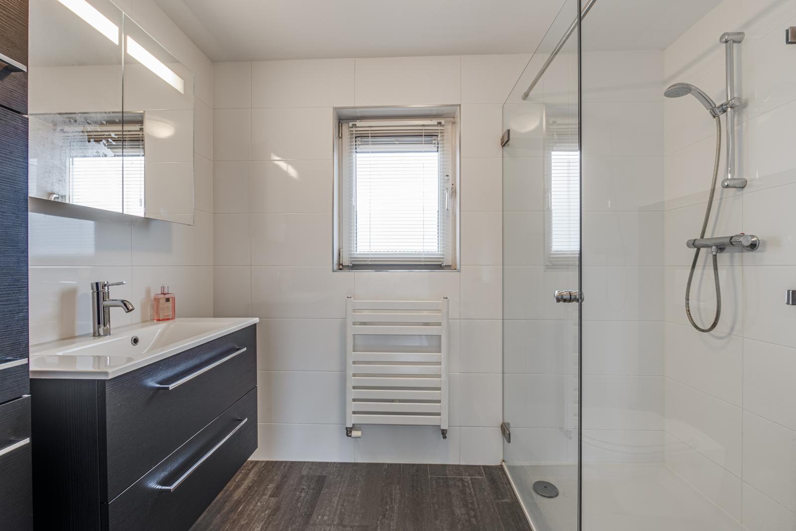 Eerste verdieping: ruime overloop, drie in grootte variërende slaapkamers, badkamer met ruime douche, wastafel en een tweede toilet.