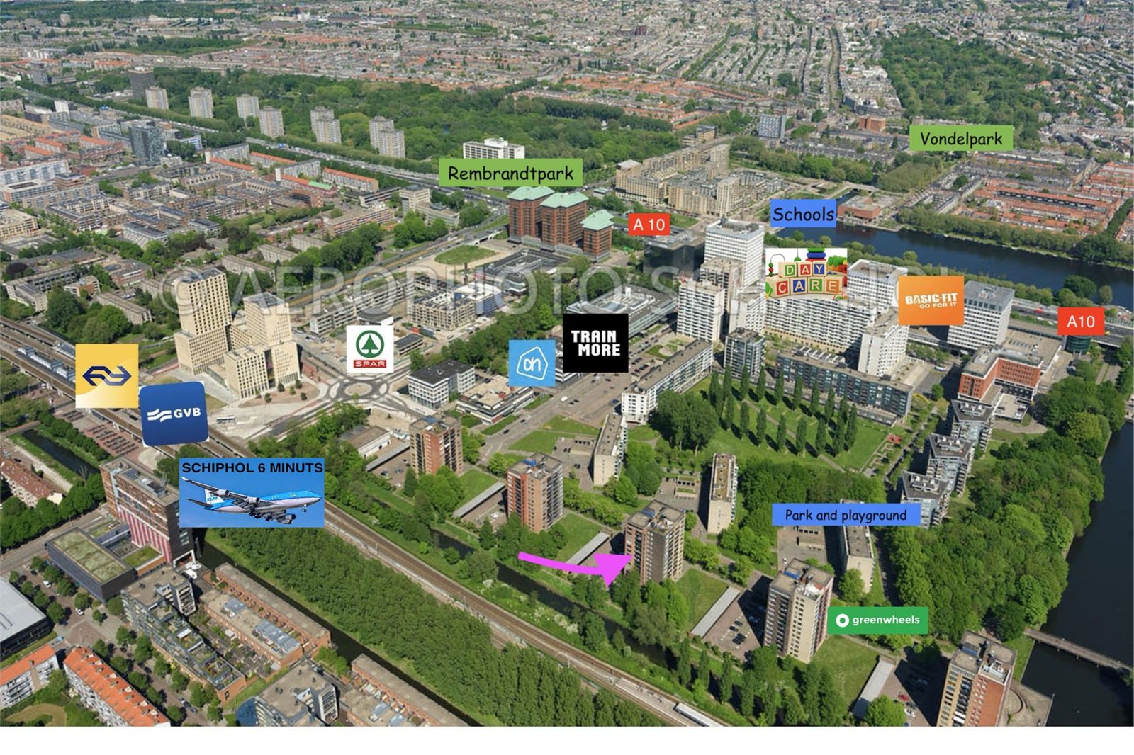 Dicht bij de uitvalswegen A10, A4, Zuidas en Schiphol. Dit appartement is zeer gunstig gelegen ten opzichte van trein, tram, bus en metro. Vlakbij het Vondelpark, het Rembrandtpark, Koningin Wilhelminapark, winkels, scholen en kinderopvang. Het appartementencomplex staat in een ruim opgezette wijk en ligt aan een rustige, doodlopende straat.