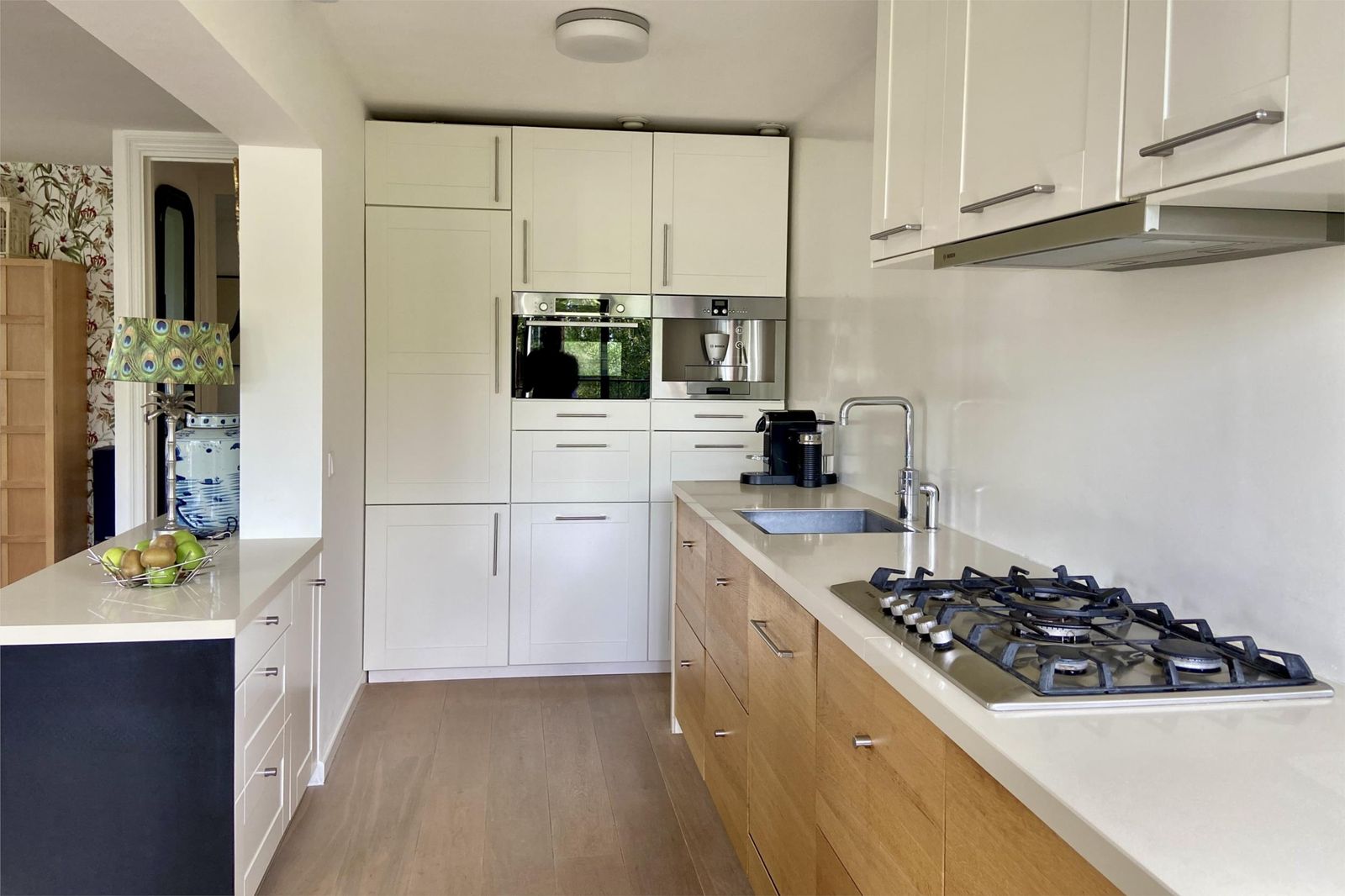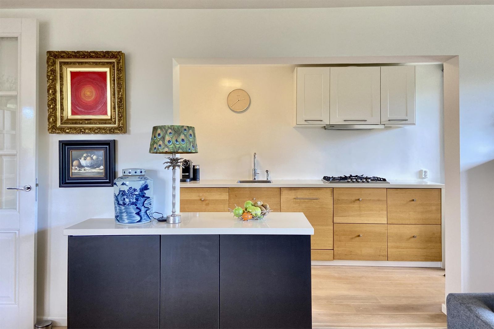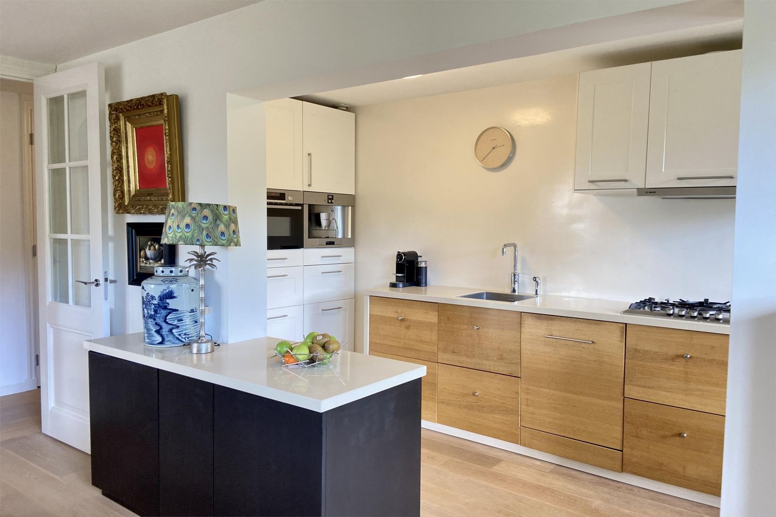 De woonkamer geeft toegang tot een plezierige keuken van 9 vierkante meter, met een grote kastenwand en een aanrechtblad van meer dan 3 meter lengte. Recentelijk is de combimagnetron vervangen. De keukenapparatuur is van Bosch. In de doorgang naar de keuken bevindt zich een handig eiland voor extra opbergruimte. De keuken geeft toegang tot het balkon op het zuiden en westen.