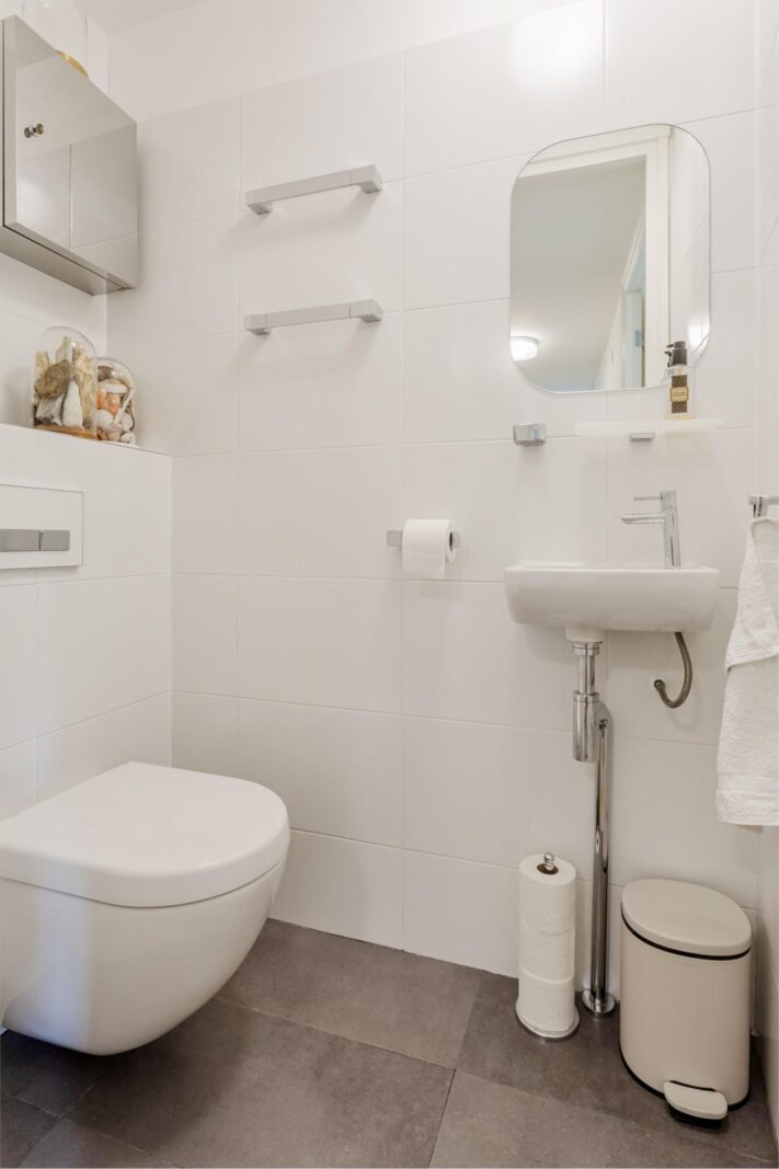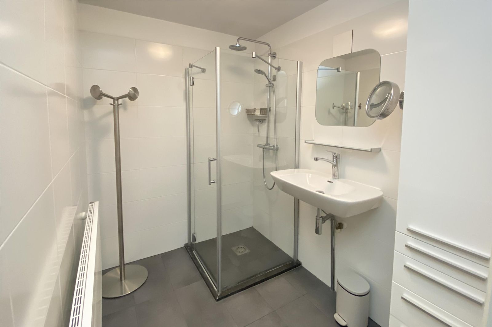 De badkamer is voorzien van een douche, een wastafel en een kolomkast die is voorzien van extra stopcontacten. Het appartement is voorzien van een separaat ruim toilet.