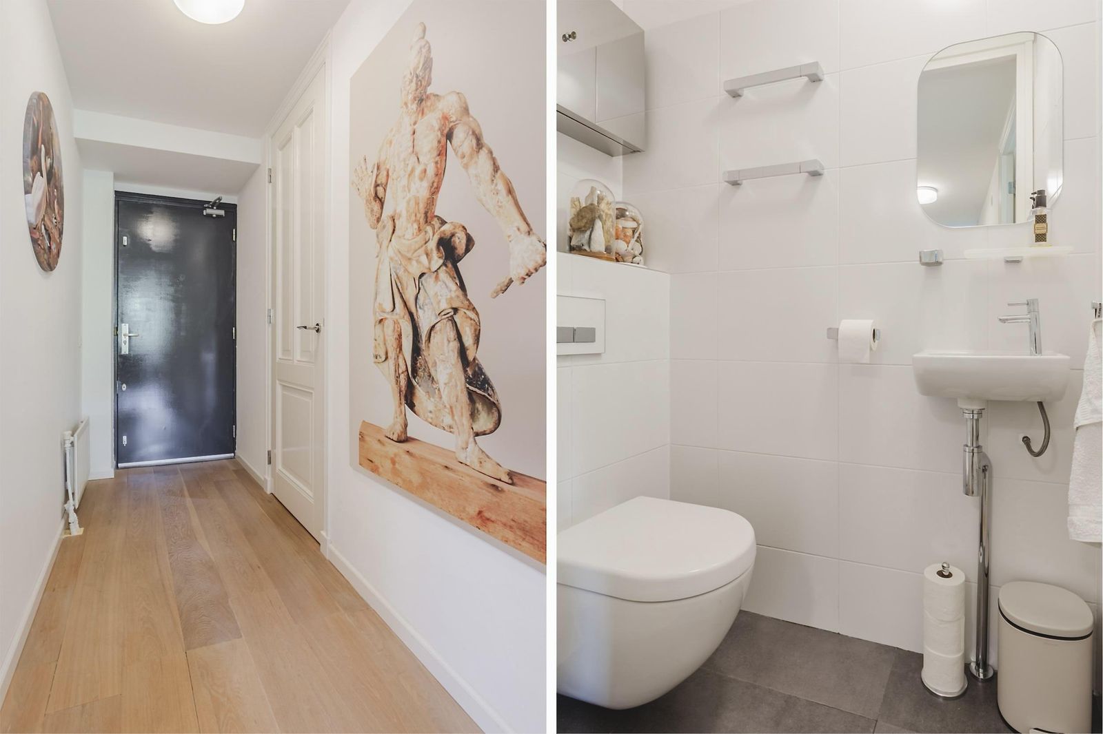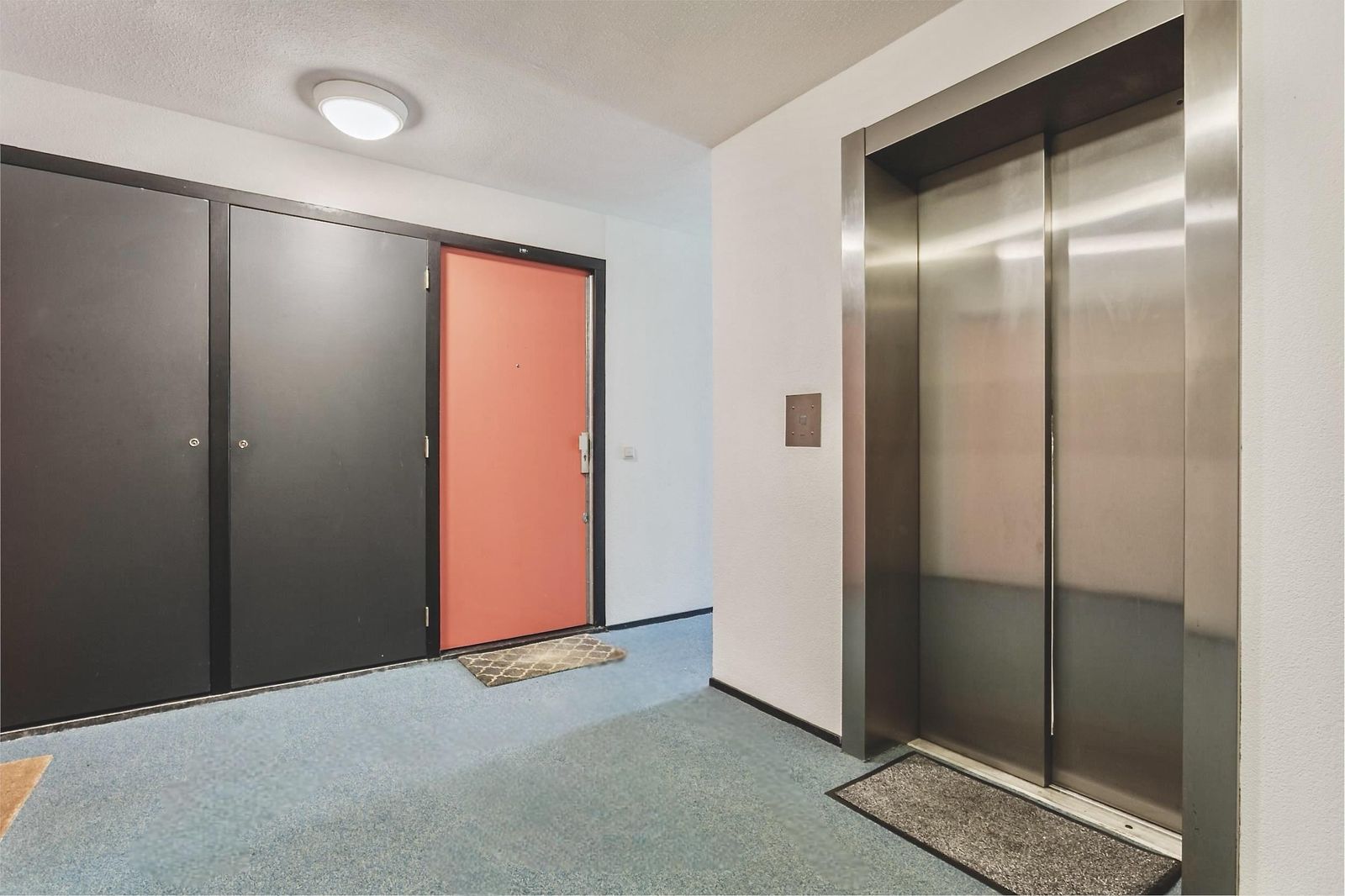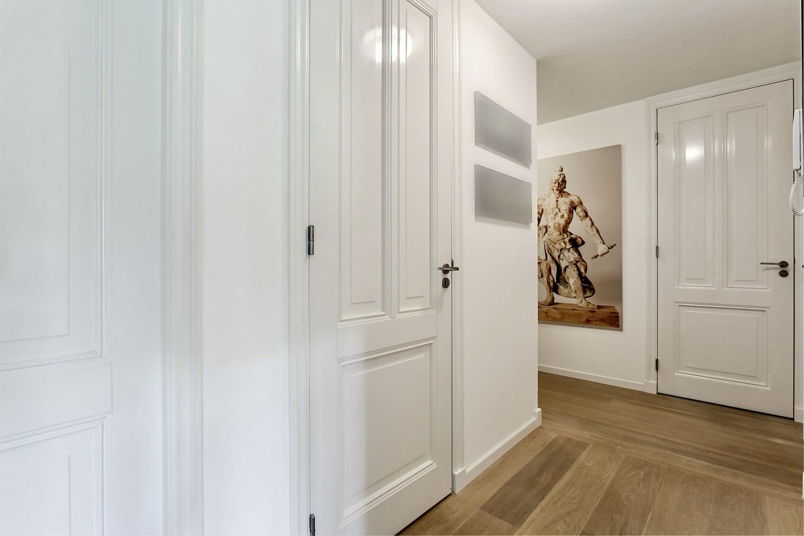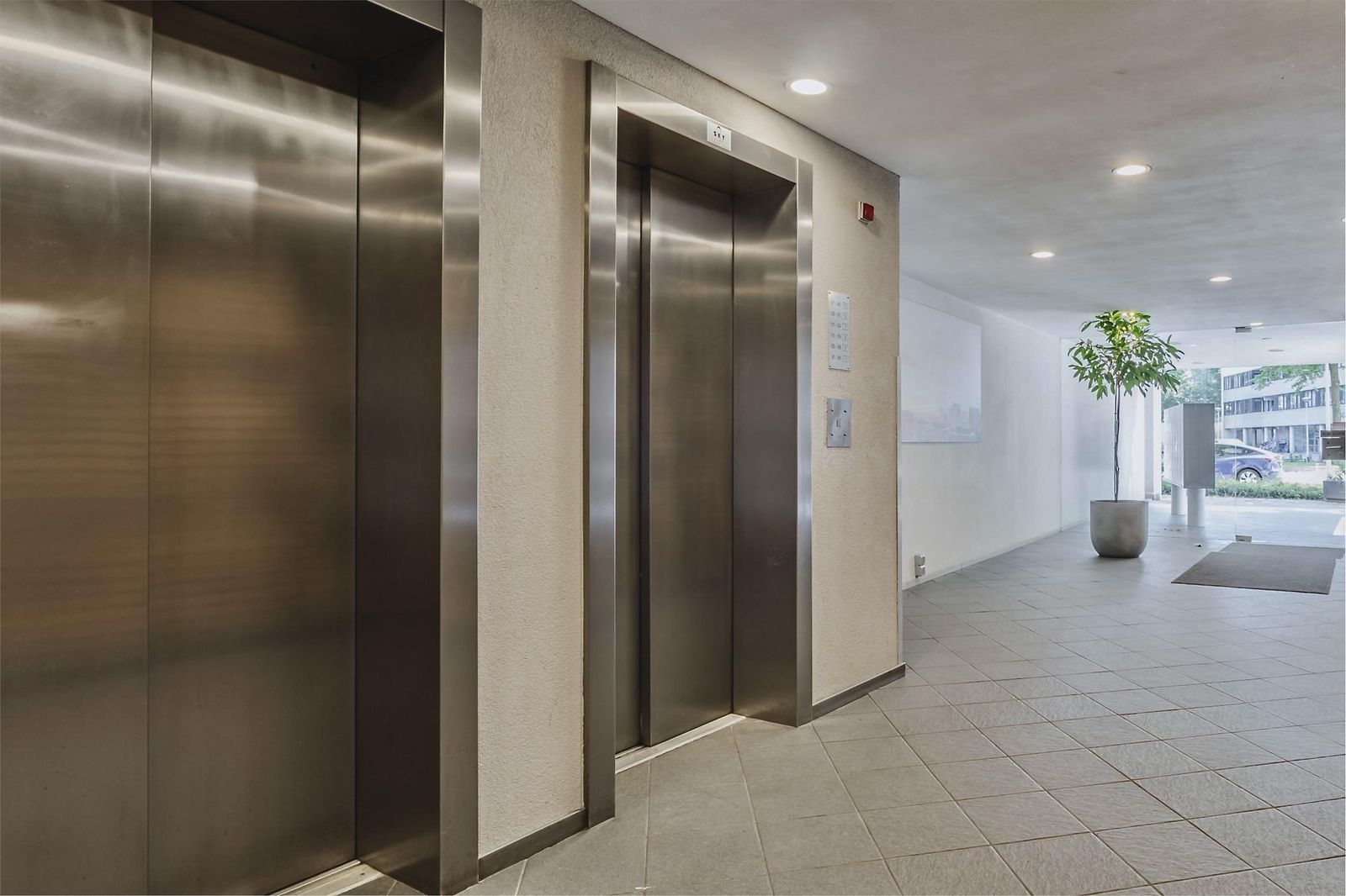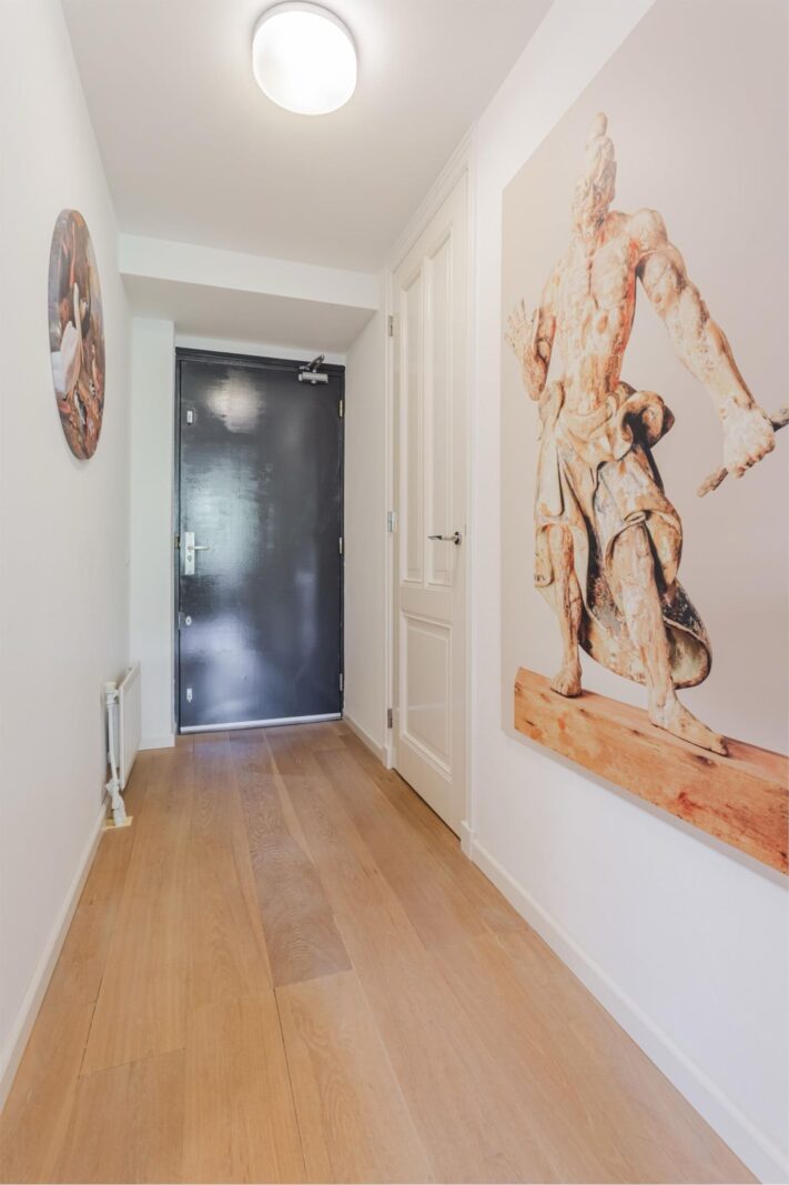 Je komt het gebouw binnen via een ruime hal met twee liften. Het appartement bevindt zich op de zesde etage. Ook hier bevindt zich een ruime hal, die toegang biedt tot het appartement. Wat prettig is, is dat er maar 4 appartementen per etage zijn, met ieder een eigen hoek van het gebouw. Dit geeft een gevoel van privacy.