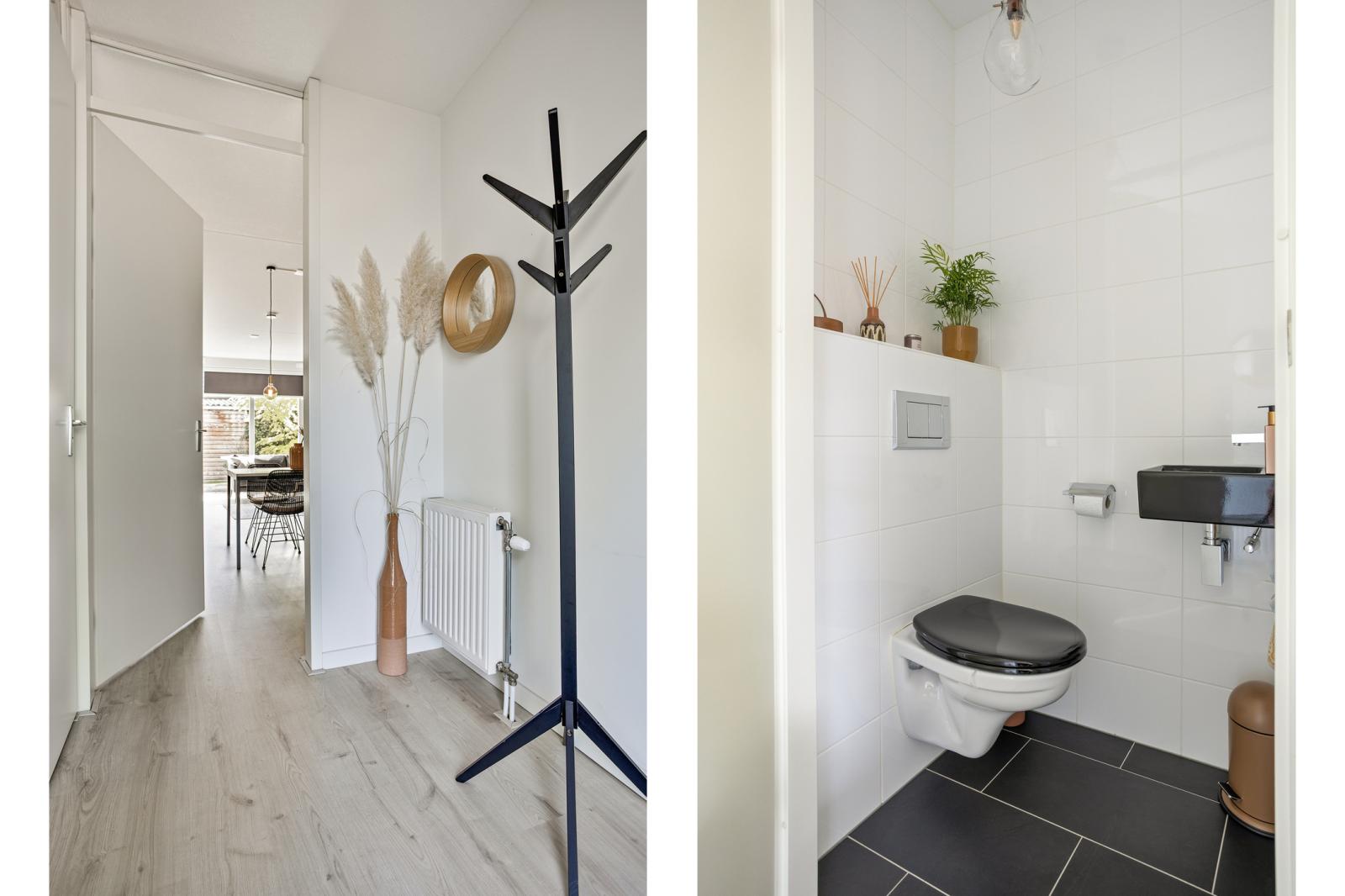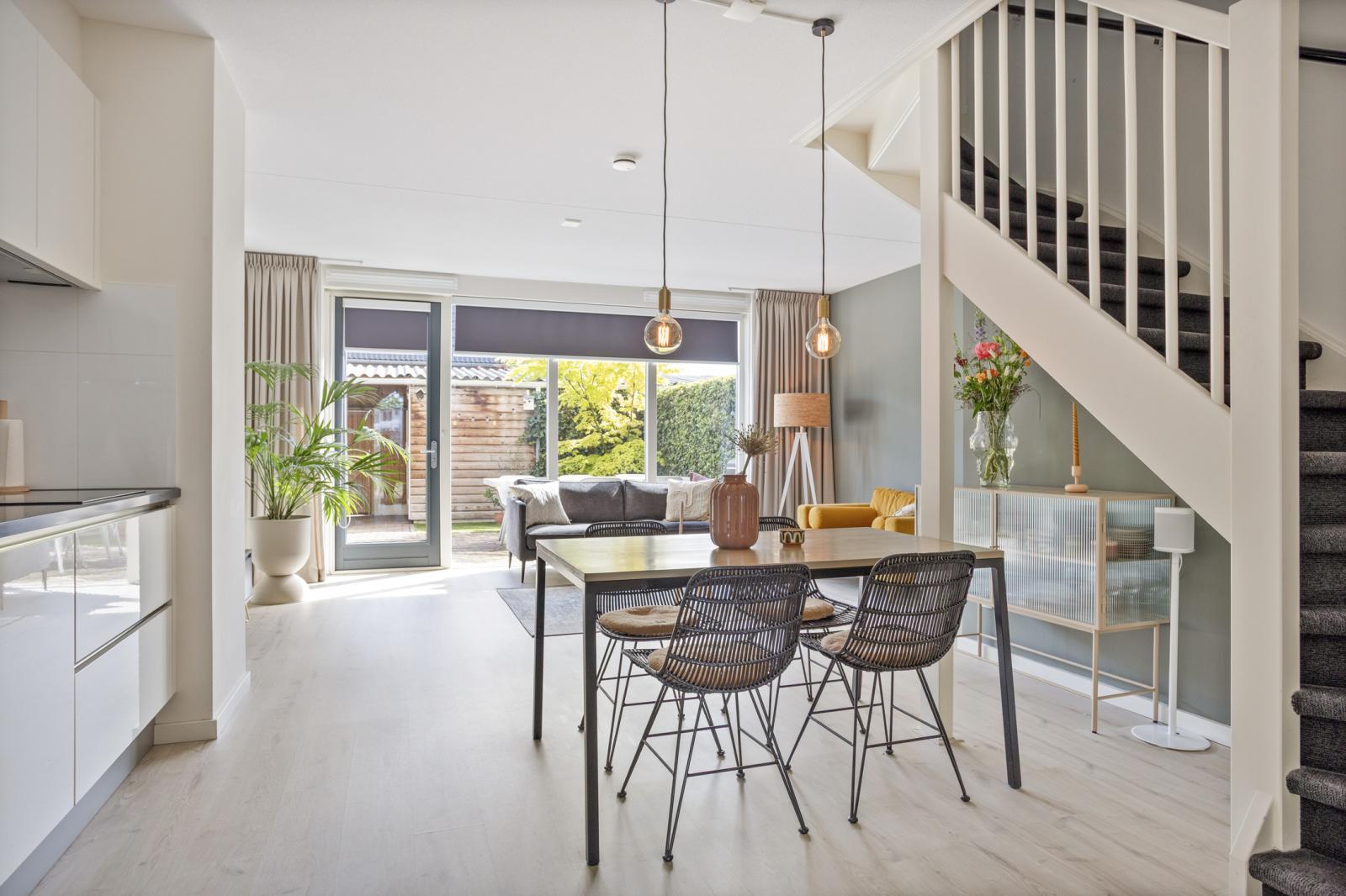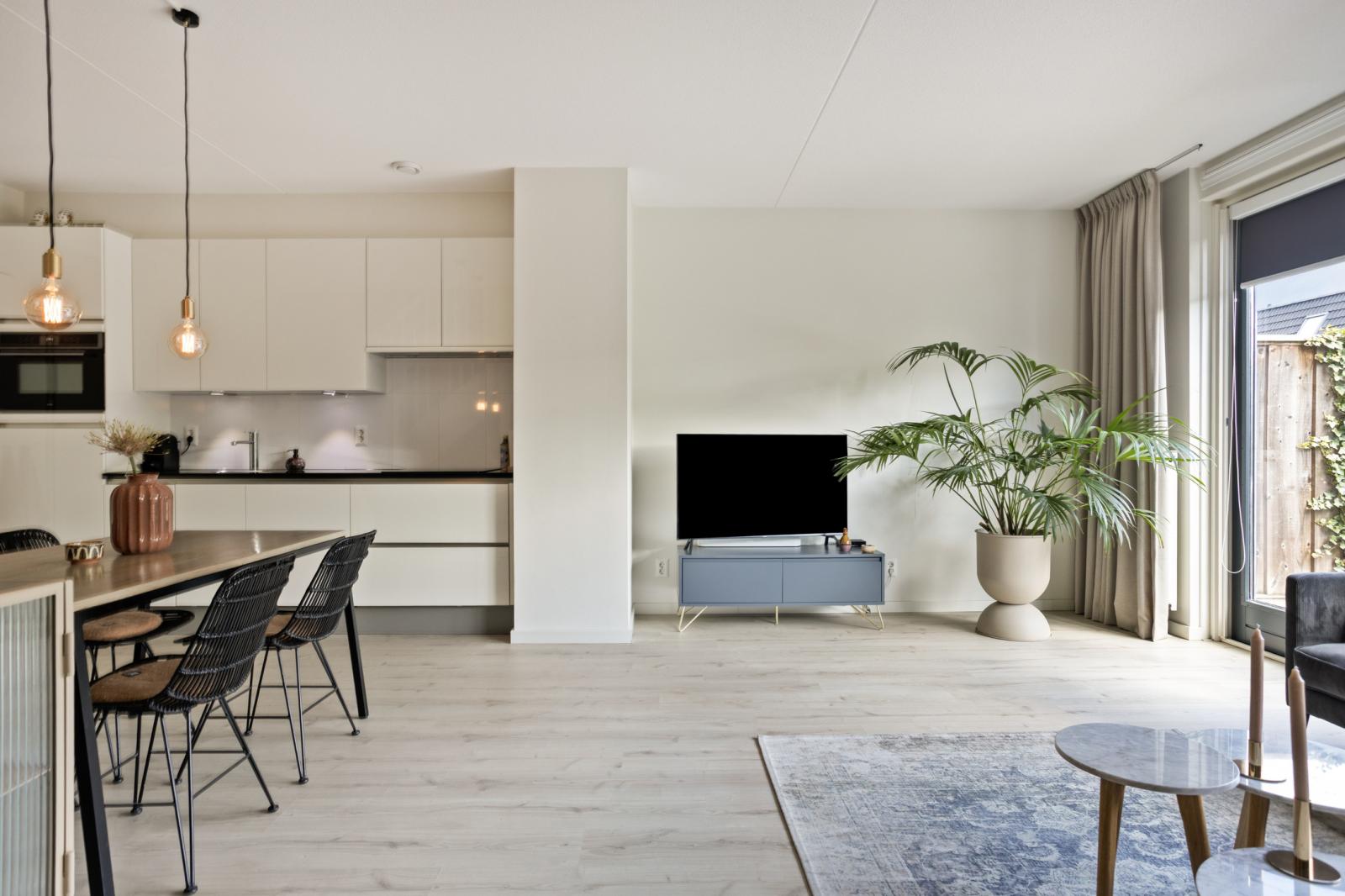 Entree/hal met meterkast en toiletruimte. Vanuit de hal bereik je zowel de keuken als de woonkamer. De keuken bevindt zich aan de voorzijde van het appartement en is modern en praktisch ingericht. De keuken is voorzien van een inductiekookplaat, koelkast, combimagnetron (2024) en vaatwasser (2024). De woonkamer ligt aan de achterzijde en strekt zich uit over de volledige breedte van het appartement. Dankzij de grote raampartijen tot aan de vloer is dit een heerlijke lichte leefruimte. Via de woonkamer heb je direct toegang tot de op het oosten gelegen achtertuin, welke is voorzien van een achterom en een vrijstaande geïsoleerde houten berging.