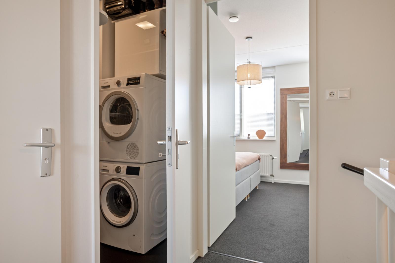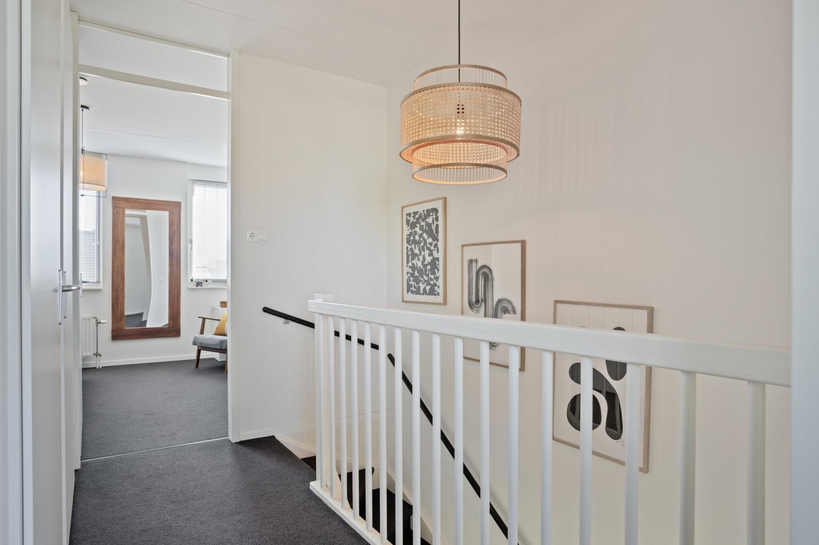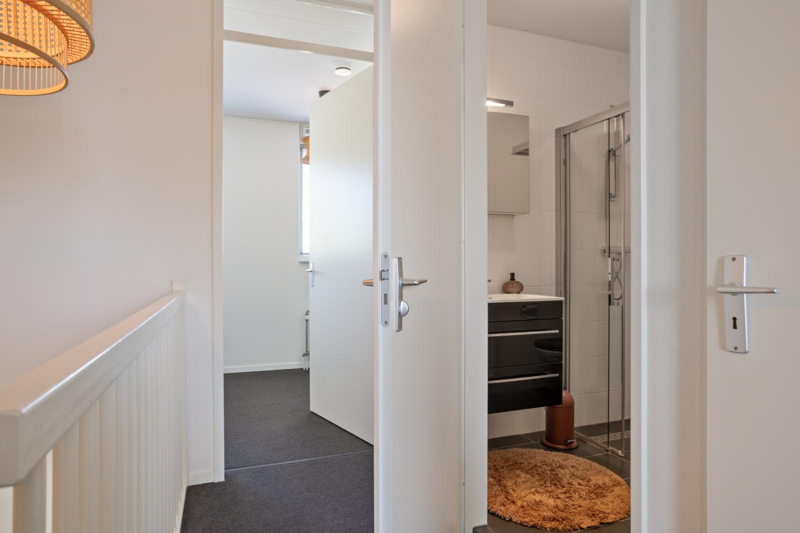 Overloop met toegang tot alle vertrekken. Aan zowel de voor- als achterzijde bevinden zich twee ruime slaapkamers, beide voorzien van kastenwanden. De badkamer is netjes afgewerkt en beschikt over een toilet, inloopdouche en wastafelmeubel. Daarnaast is er een praktische wasruimte met was- en droogopstelling en de opstelplaats van de cv ketel.
