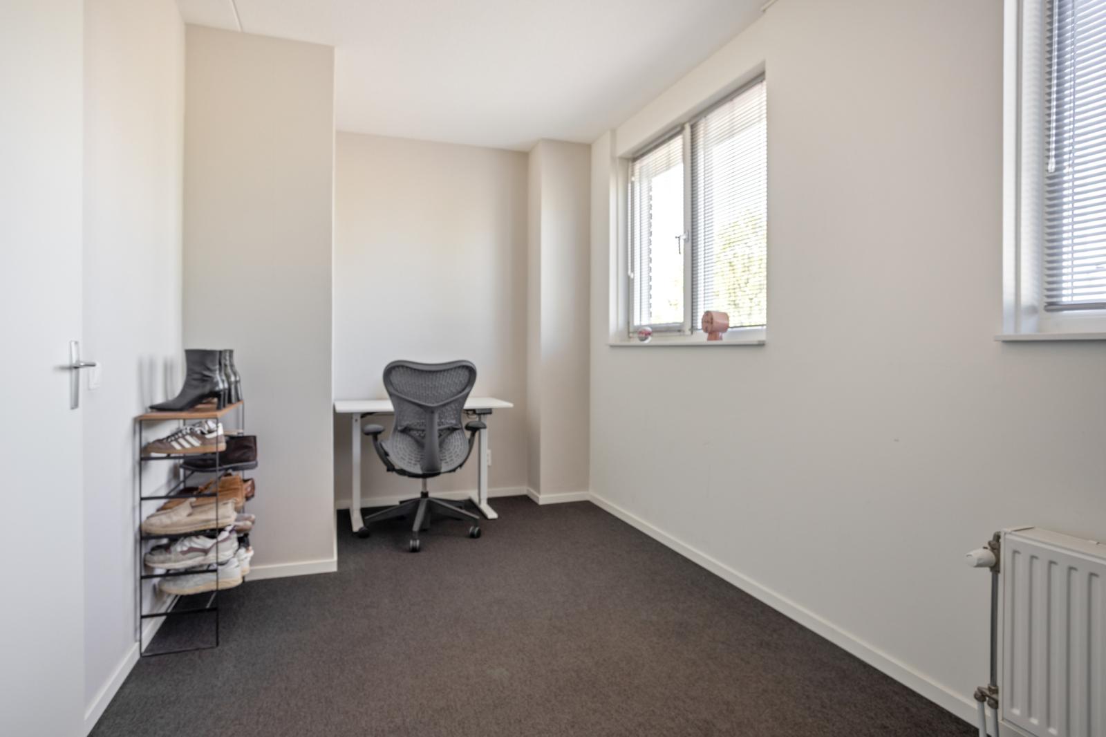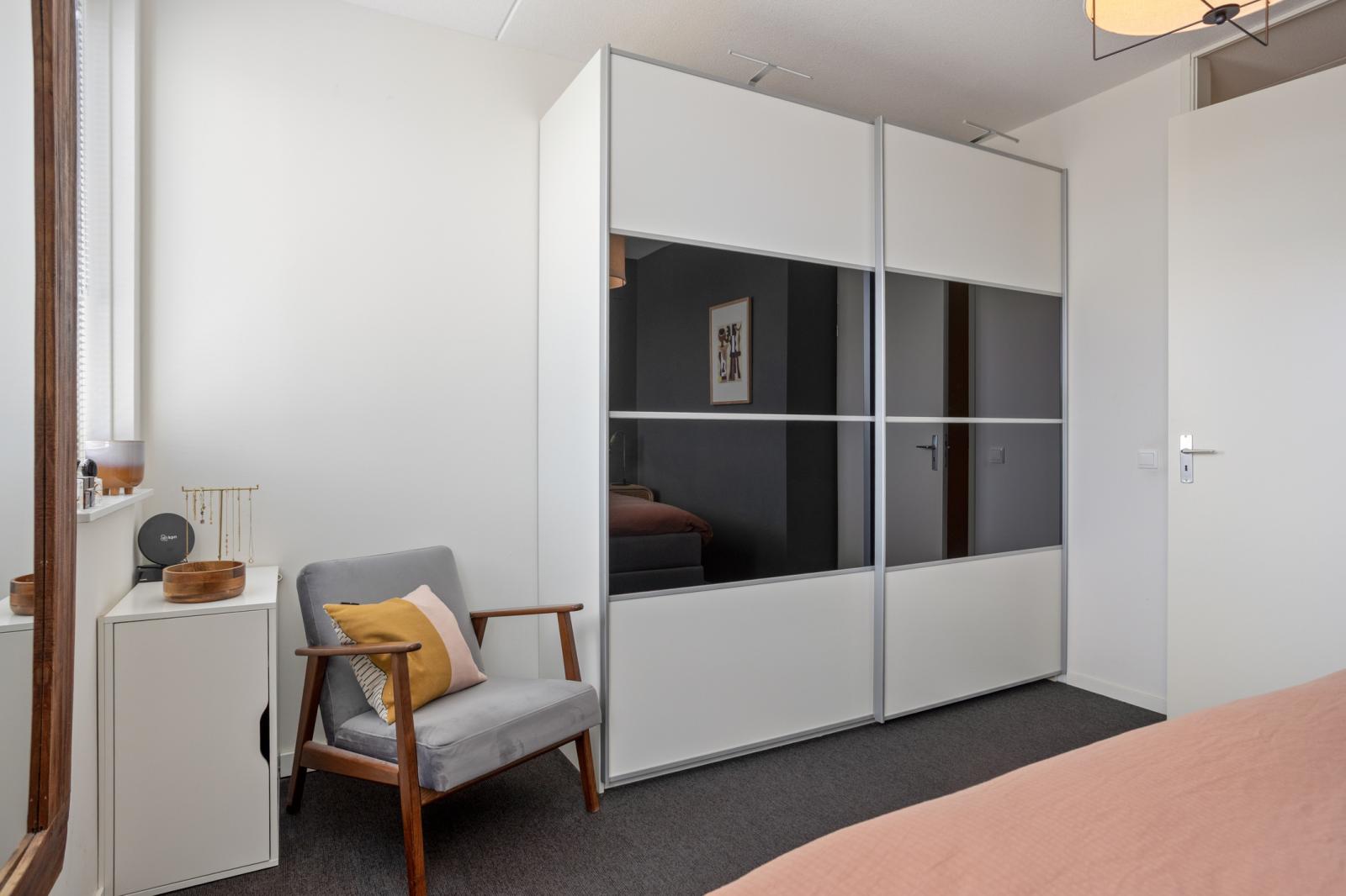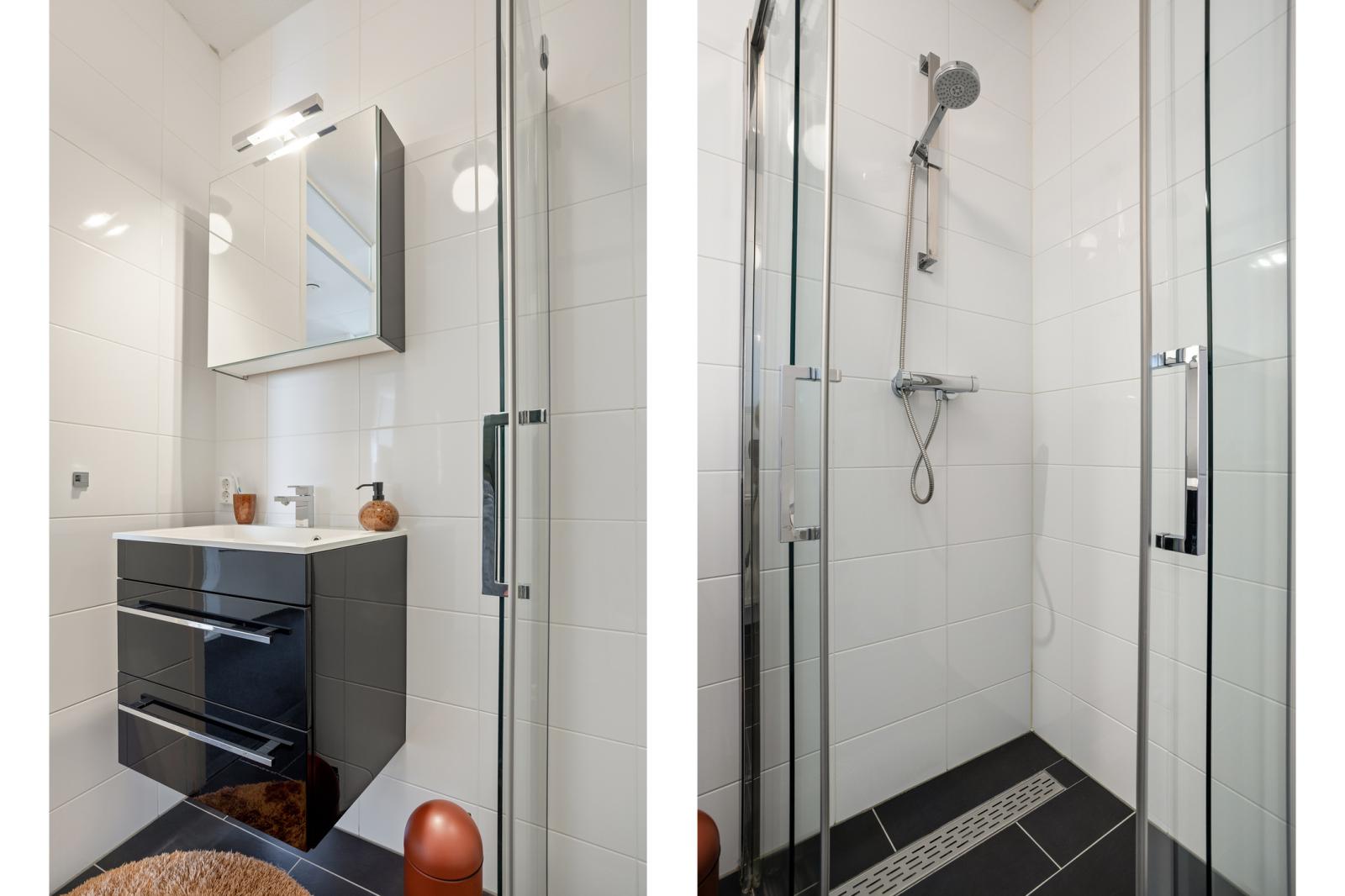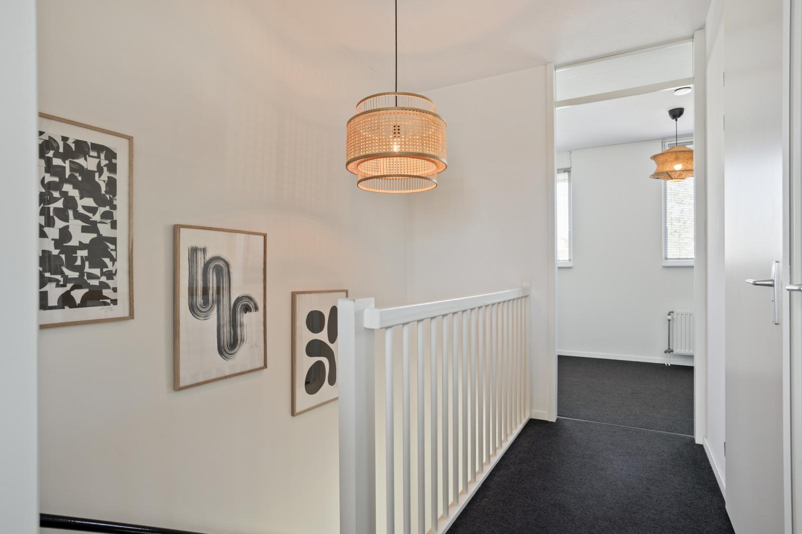 Overloop met toegang tot alle vertrekken. Aan zowel de voor- als achterzijde bevinden zich twee ruime slaapkamers, beide voorzien van kastenwanden. De badkamer is netjes afgewerkt en beschikt over een toilet, inloopdouche en wastafelmeubel. Daarnaast is er een praktische wasruimte met was- en droogopstelling en de opstelplaats van de cv ketel.