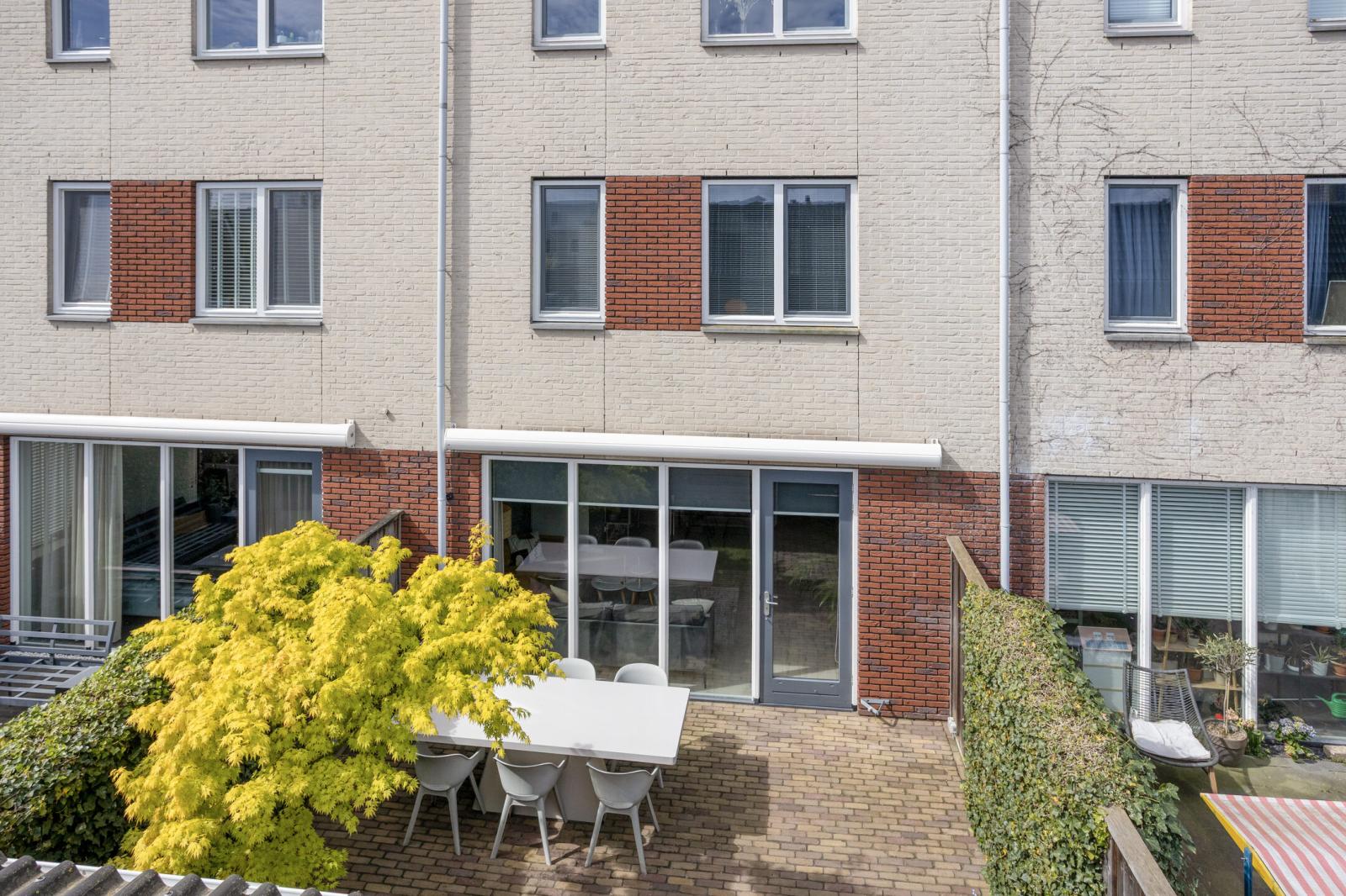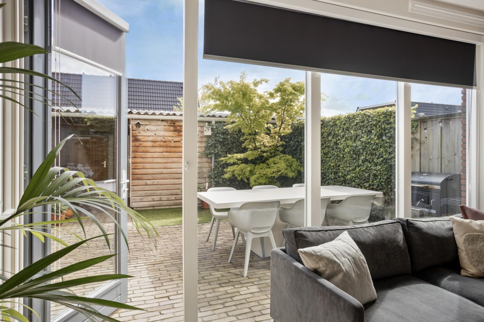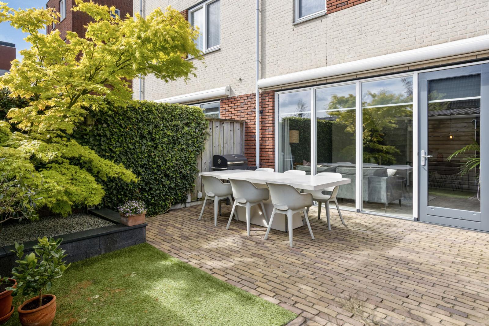 De achtertuin is zonnig gelegen op het oosten en biedt een fijne combinatie van privacy en ruimte. De tuin beschikt over een achterom en een vrijstaande geïsoleerde houten berging, ideaal voor fietsen en opslag.