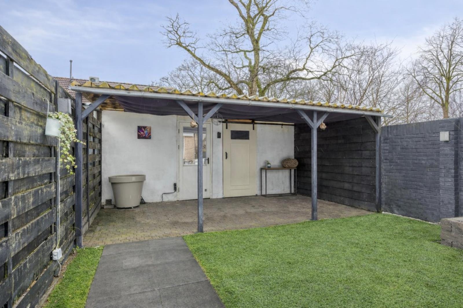 berging en overkapping/veranda. Fijn is de vrije ligging aan de zijkant.