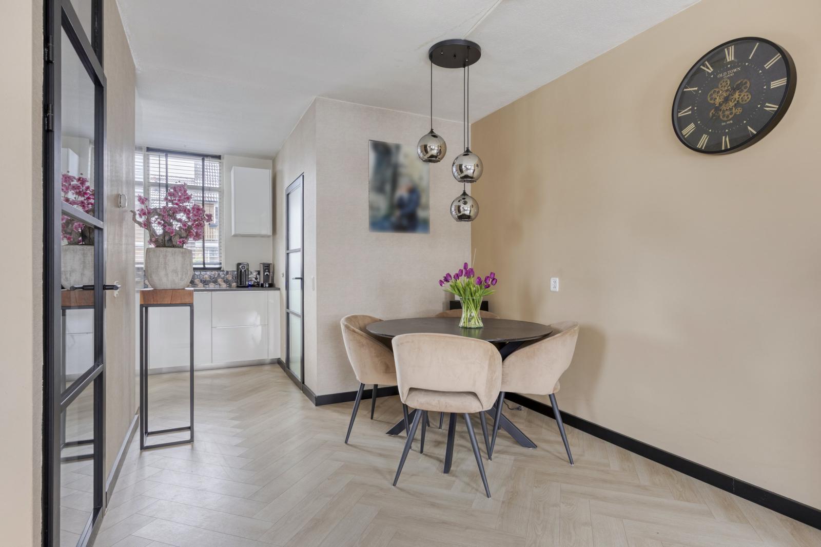 annex trapkast. Het zitgedeelte is aan de achtertuin zijde en het eetgedeelte centraal in de woonkamer nabij