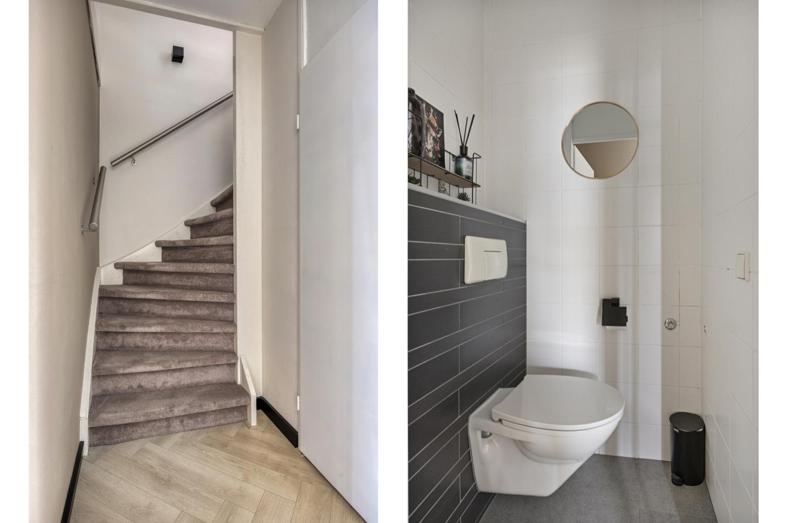 Tussen hal met toiletruimte met fontein en de trapopgang.