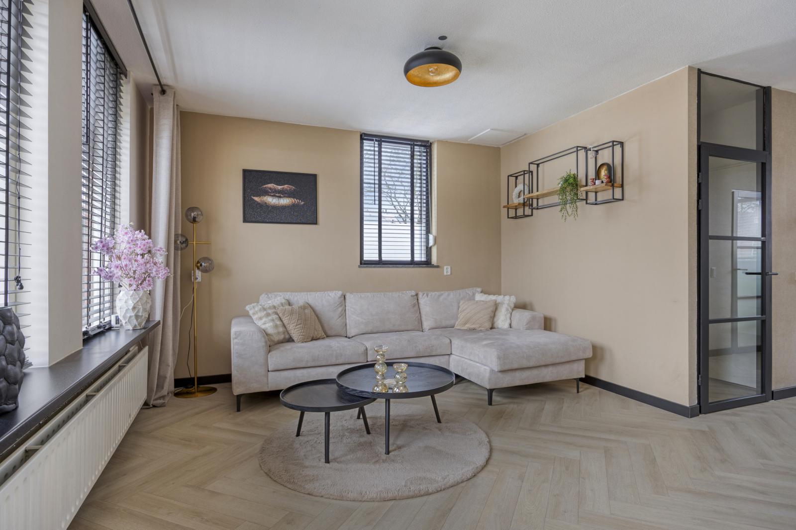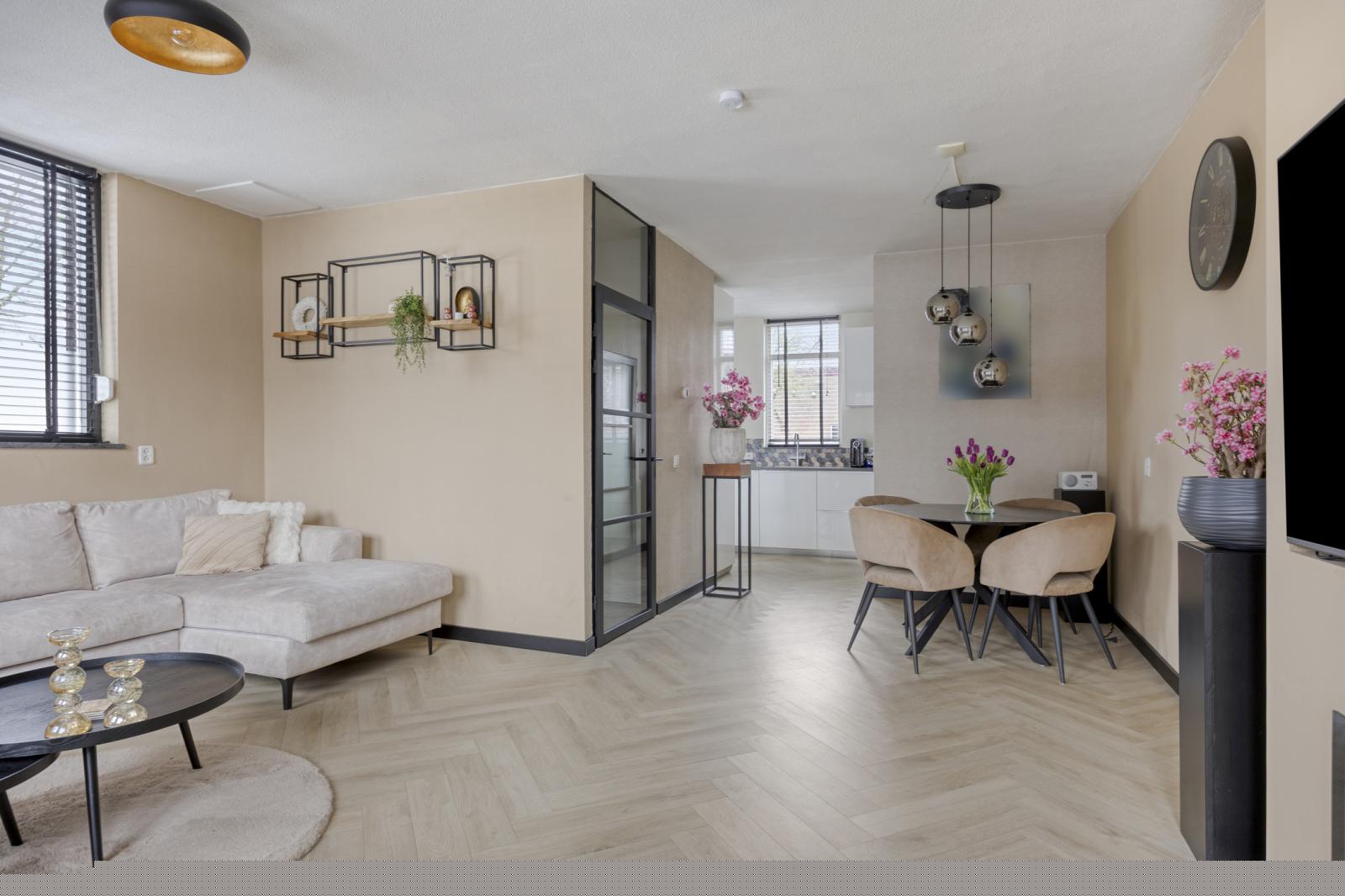Tuingerichte woonkamer met prachtige visgraad vloer en nette wand en plafond afwerking, handig is de berg-