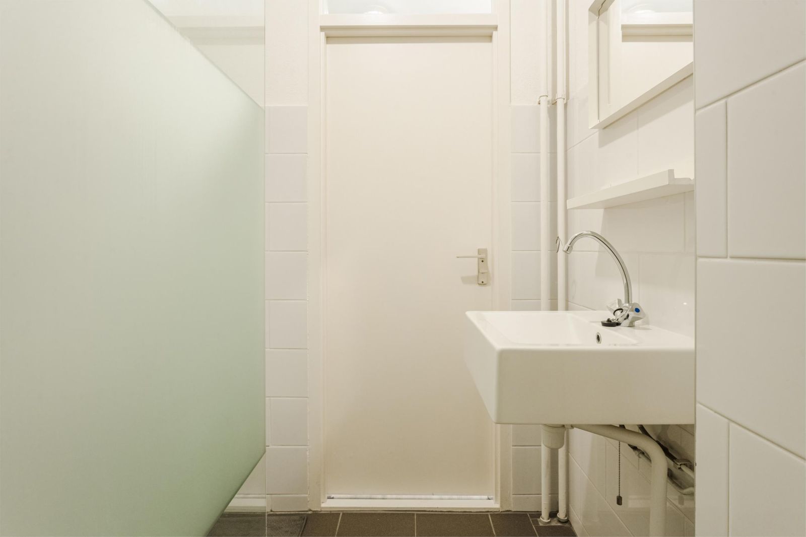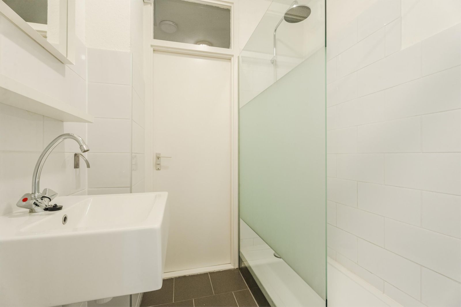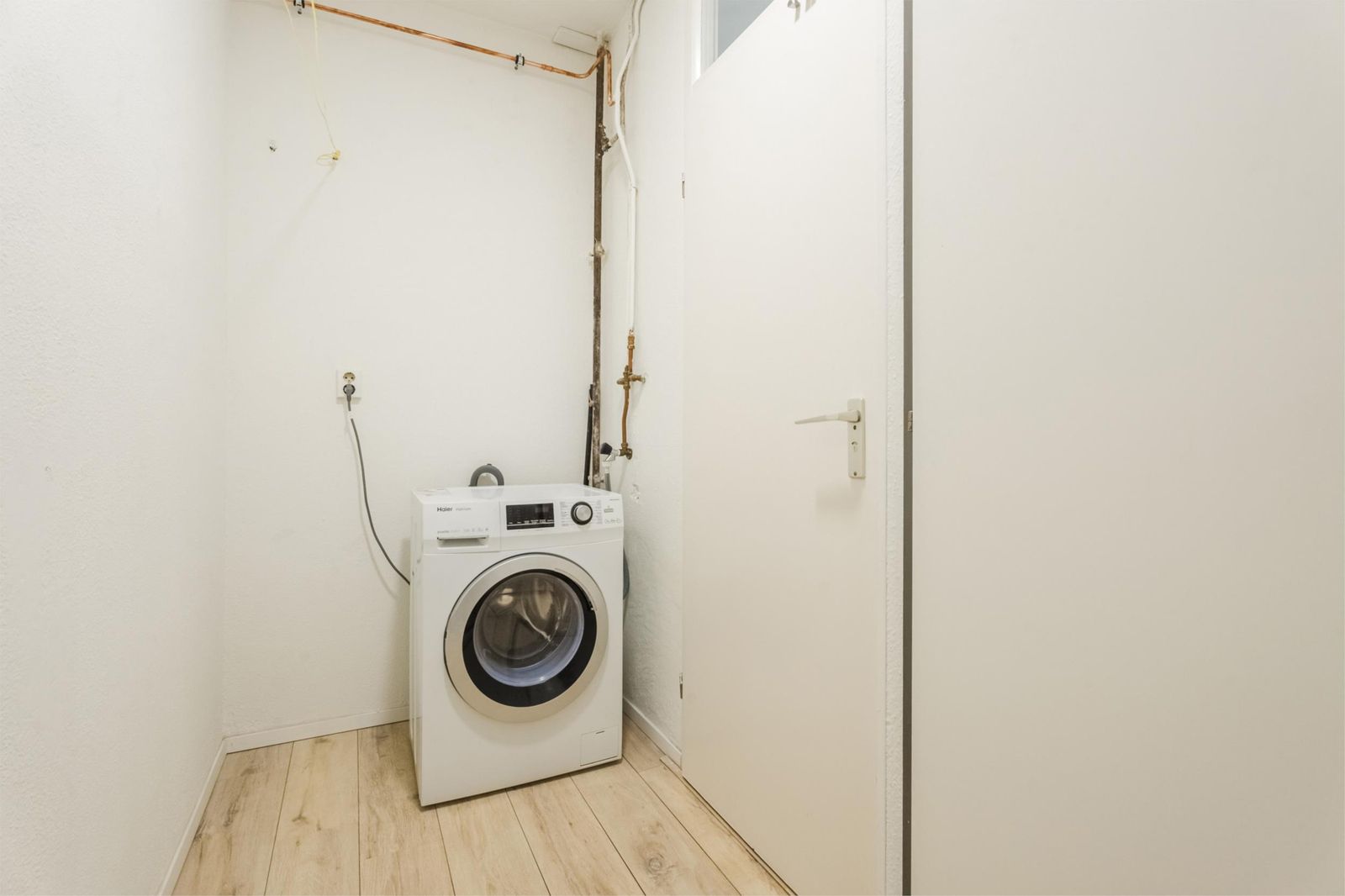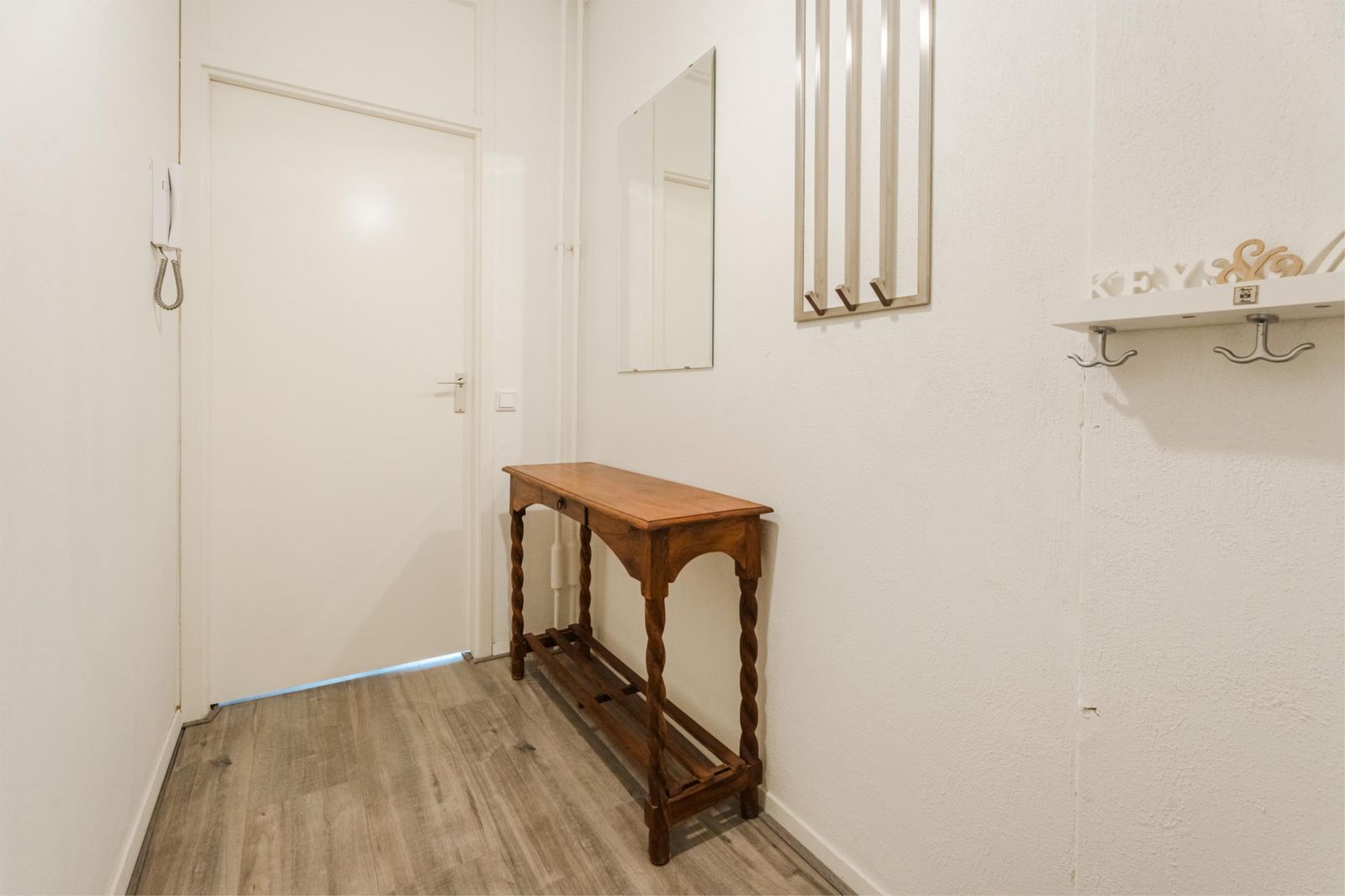 Entree/hal met links een deur naar bergruimte, waarin aansluiting voor wasmachine. De hal doorgelopen, kom je in de woonkamer met halfopen keuken. De keuken is voorzien van een vaatwasser, combi-oven, inductie kookplaat en koel/vriescombinatie. Voor de woonkamer is over de hele breedte het balkon (gelegen op oost, dus kan je genieten van de ochtendzon op het balkon). Aan de linkerkant In de woonkamer is een deur tot een gang met aan de rechterkant de (ruime)slaapkamer die grenst aan de woonkamer en aan de linkerkant in deze gang toegang tot de badkamer met douche en wastafel en toegang tot de (aparte) WC met fonteintje. Meterkast bevindt zich op de gang naast de voordeur.