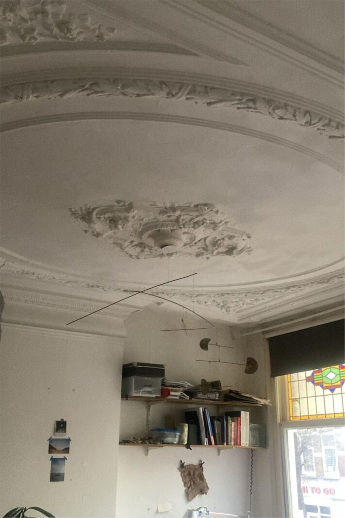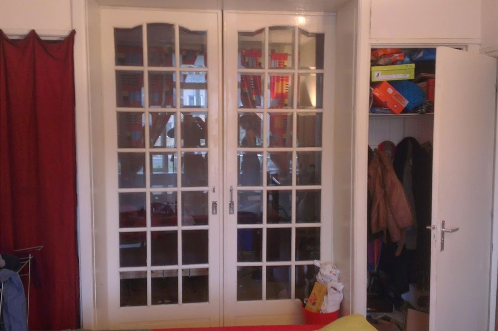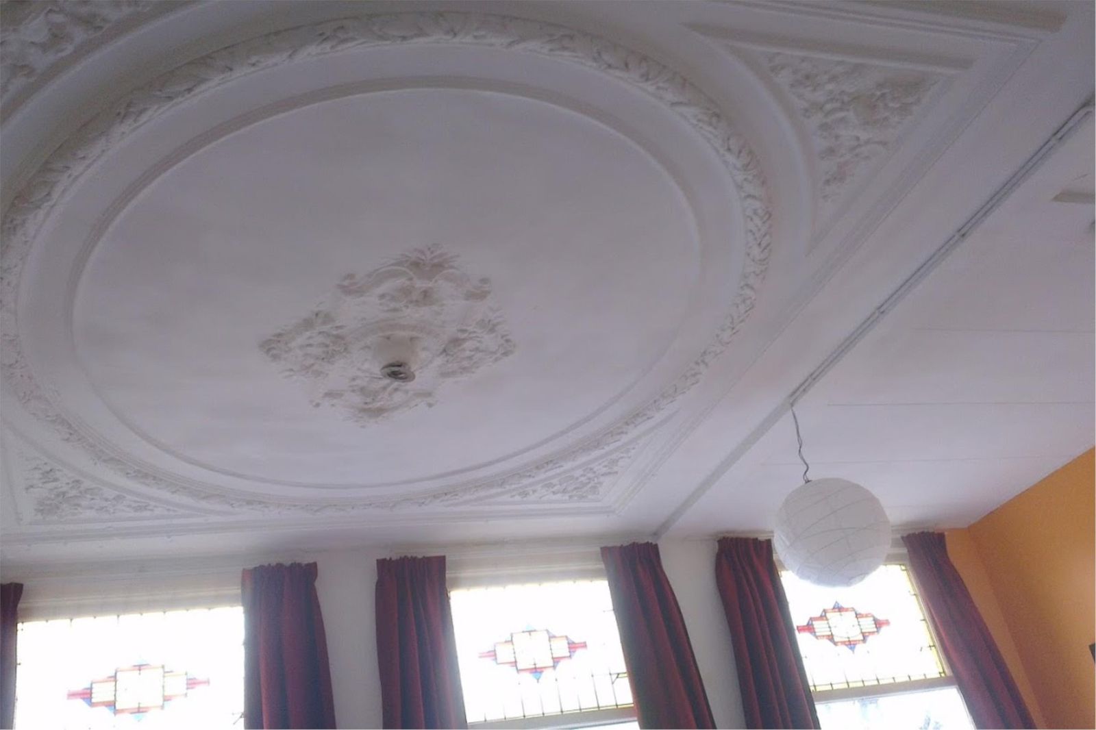 Aan de voorzijde vind je een ruime woonruimte met orginele glas in lood-schuiframen en een prachtig ornamenten plafond. Daarnaast is er een separaat toilet en een separate badkamer.
