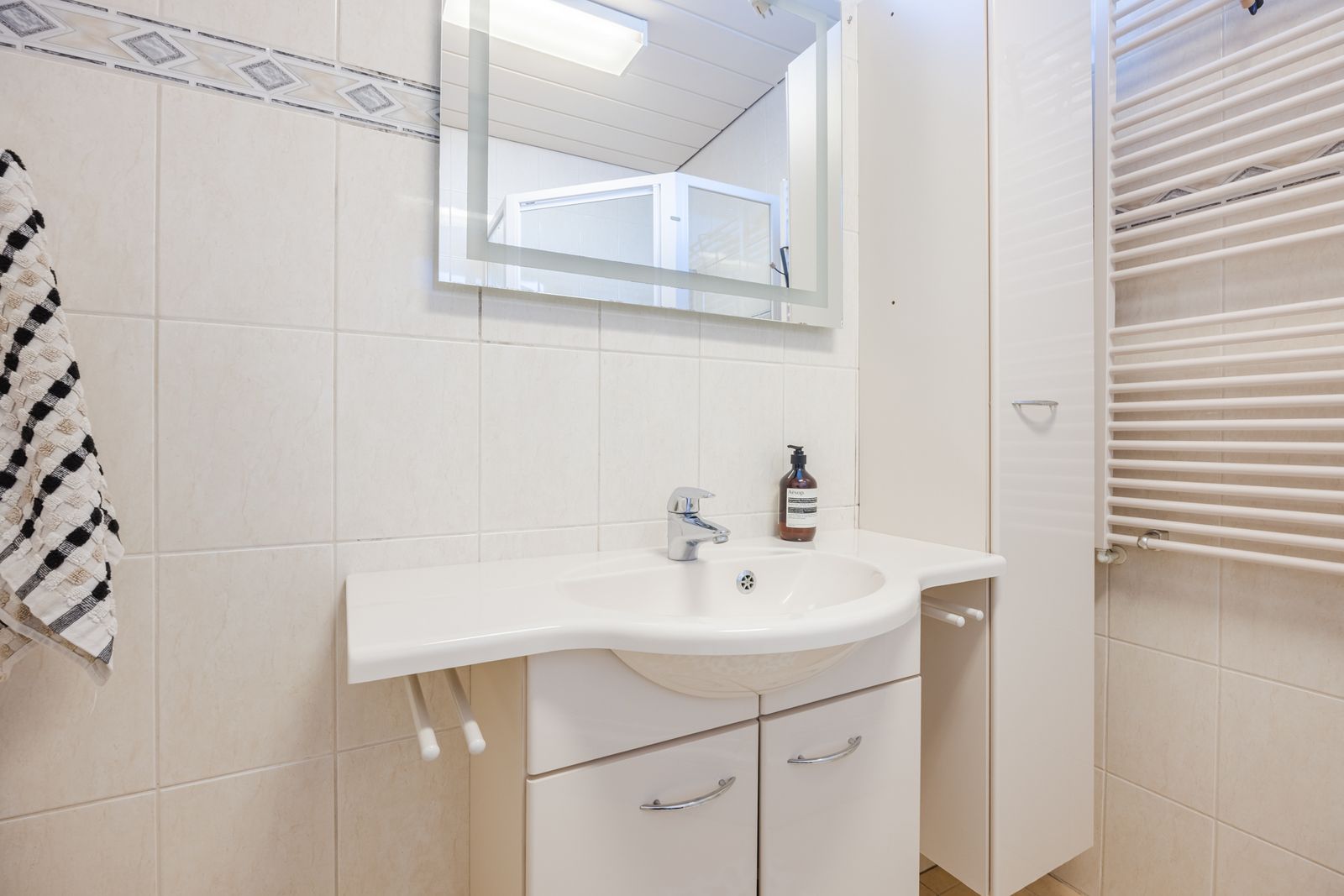 Nette badkamer met douchecabine, wastafelmeubel, wandtoilet en designradiator.