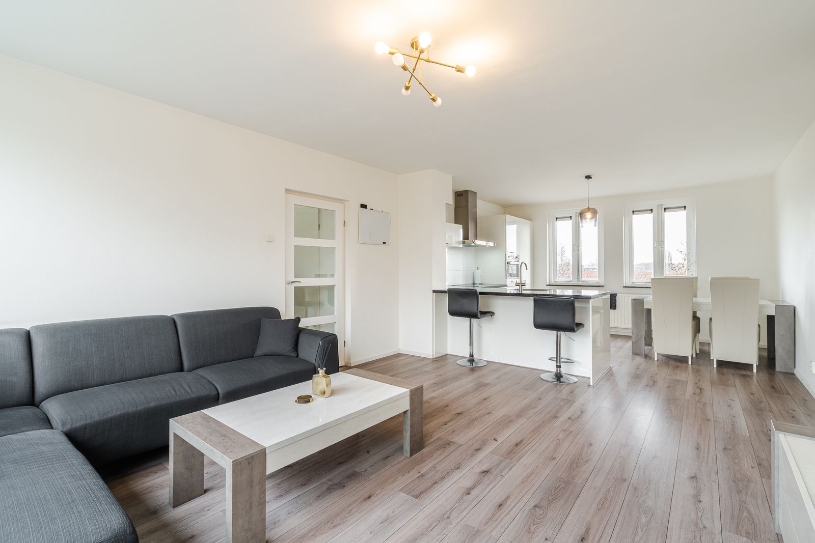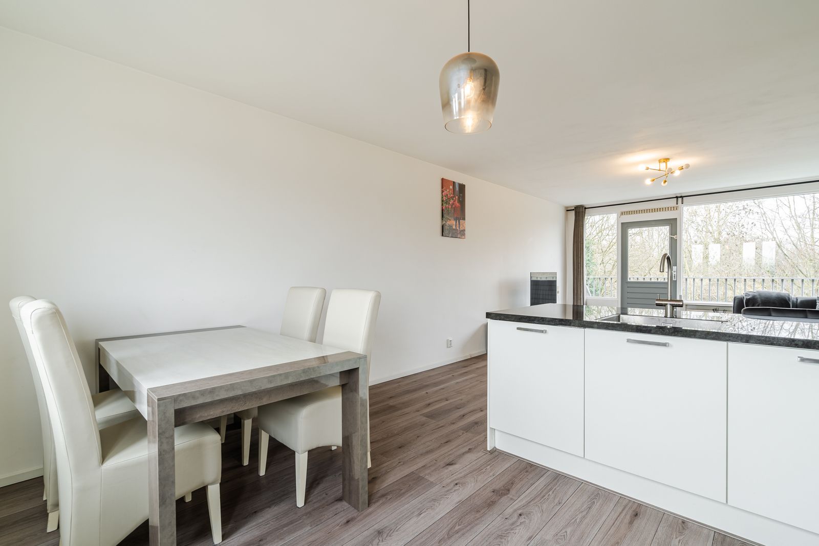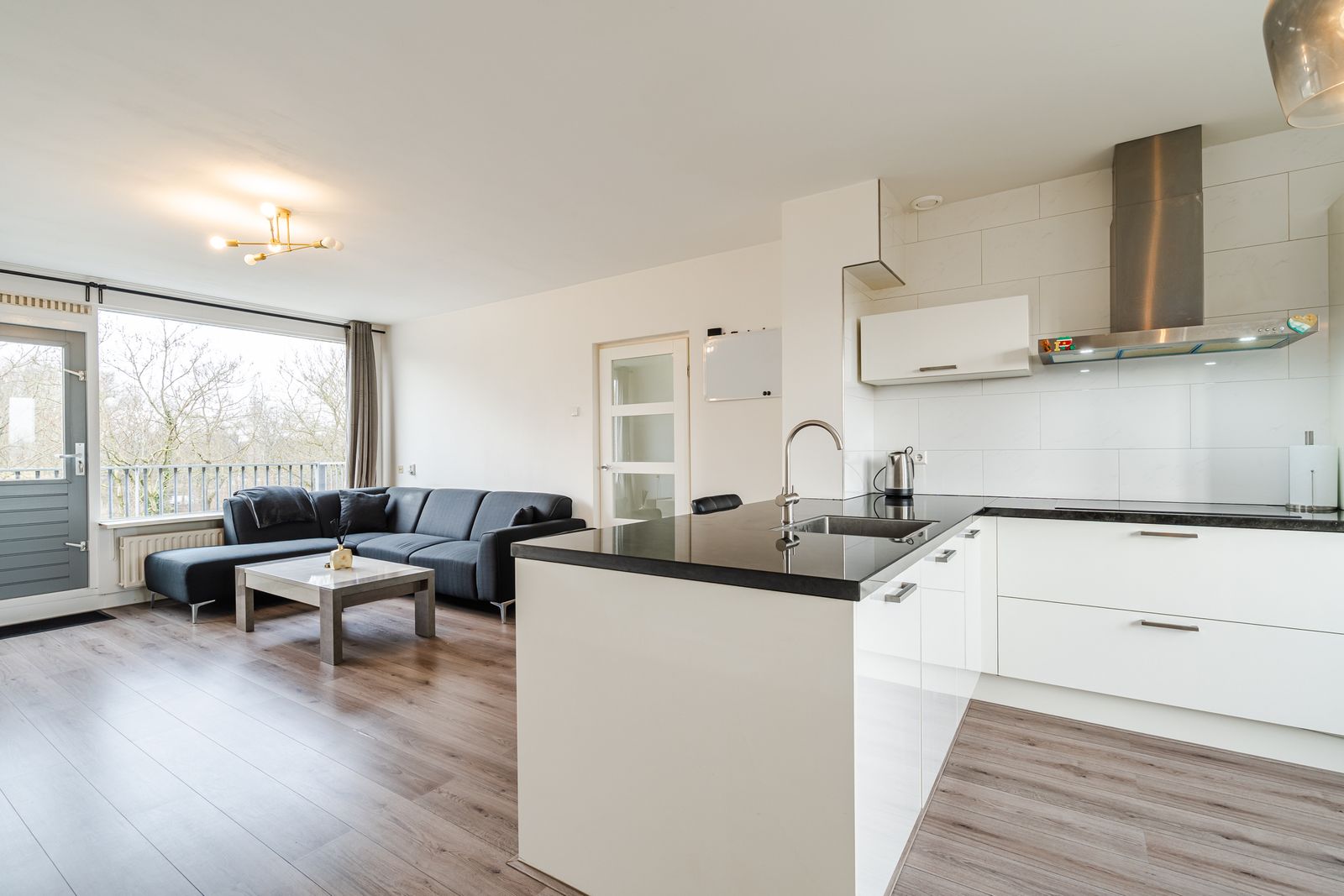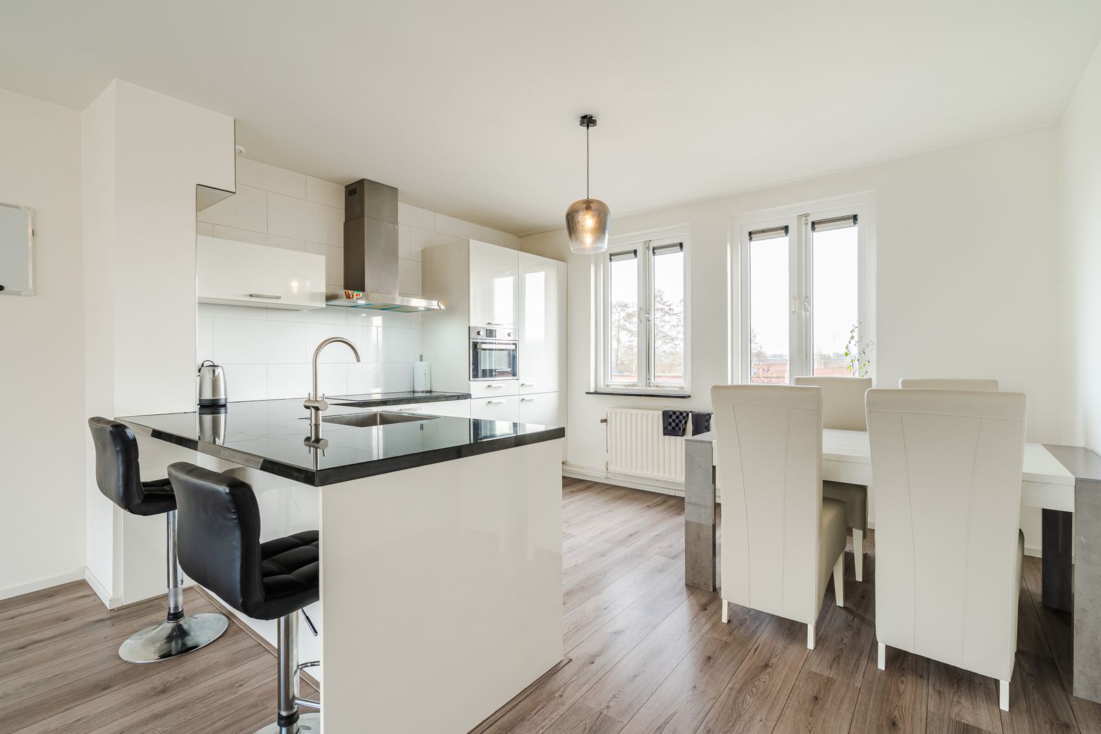Naast de living ligt de keuken. Wat hierbij direct opvalt is de comfortabele bar. Ideaal voor visite bij het koken of de afwas. De moderne L-keuken is voorzien van een ruime donkergranieten keukenblad. Dit steekt mooi af tegen de witte laden en kasten. Alle standaardgemakken zijn aanwezig, zoals inductiekookplaat, combi-magnetron, vaatwasser, etc. De keuken is ook nog ruim genoeg om een eettafel kwijt te kunnen.