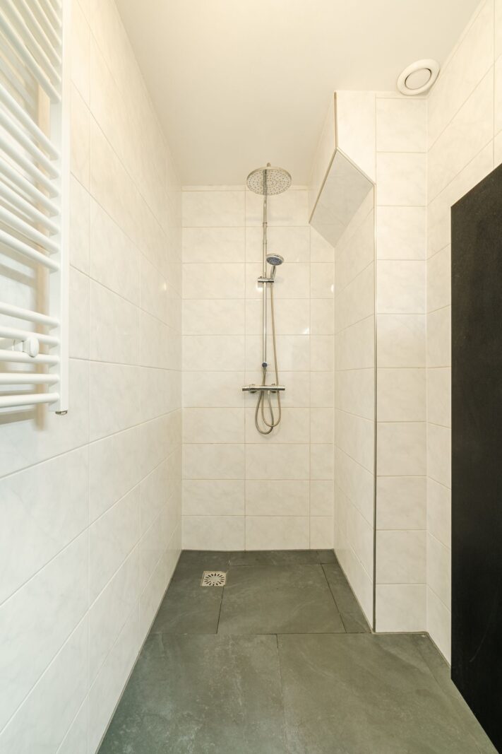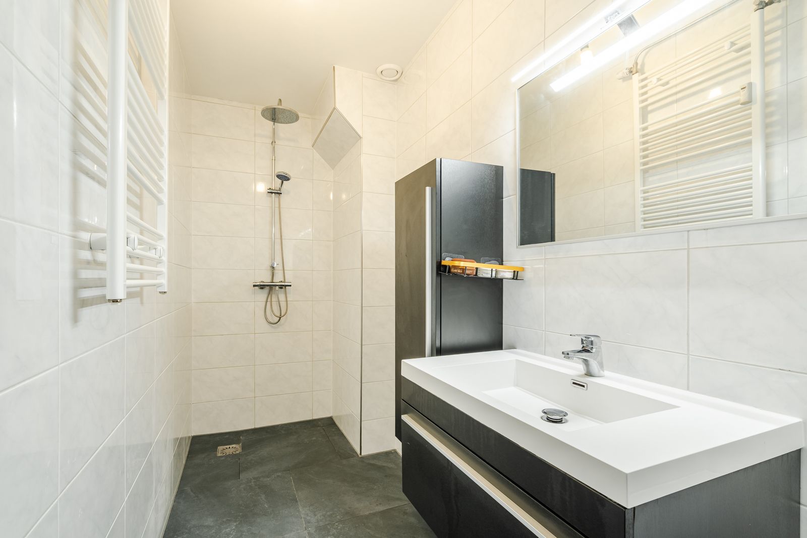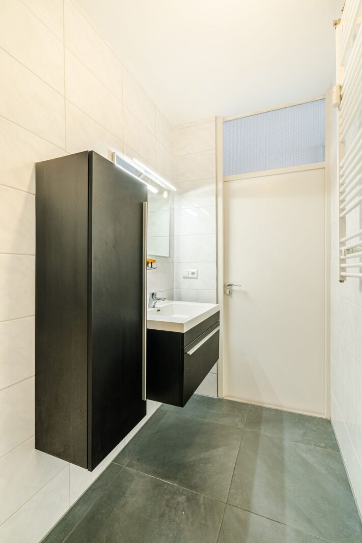 Naast de slaapkamer is de ruime badkamer. Voorzien van wastafel, spiegel en kasten.