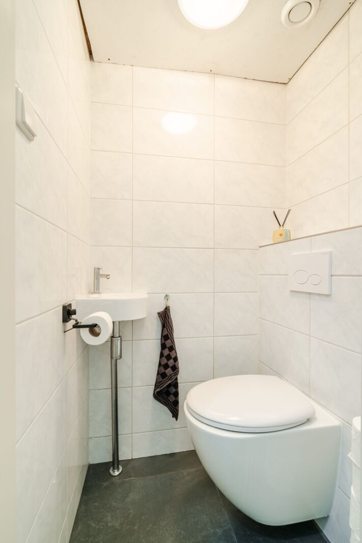 Naast de washok is er een nette wc, met hangtoilet en hoekfontein. Als je verder gaat stap je door naar de ruime woonkamer. Aan beide zeiden wordt je verwelkomt door veel lichtinval. Rechts loop je door naar het balkon. In de middag en avond kan je hier op zomerse dagen genieten van de zon. Alle kozijnen zijn in 2025 voor het laatst voorzien van een likje verf.